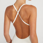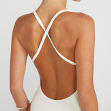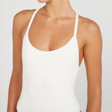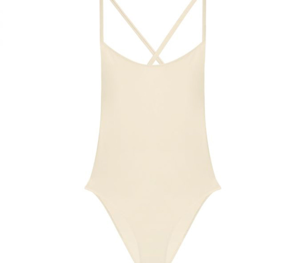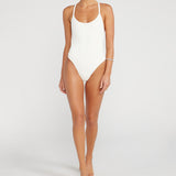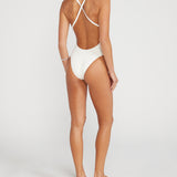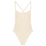 Introducing Uno Rib Cross Back One Piece in Ivory is a timeless one-piece swimsuit, distinguished by its two crossed back straps. It showcases a subtly low-rounded neckline that complements both small and large busts, coupled with a gracefully scooped back for optimal tanning. Constructed from a sustainable Lycra with a matte finish, the Uno one-piece is completed with proportionally cut legs, offering a mid-coverage silhouette perfect for active days under the sun.
