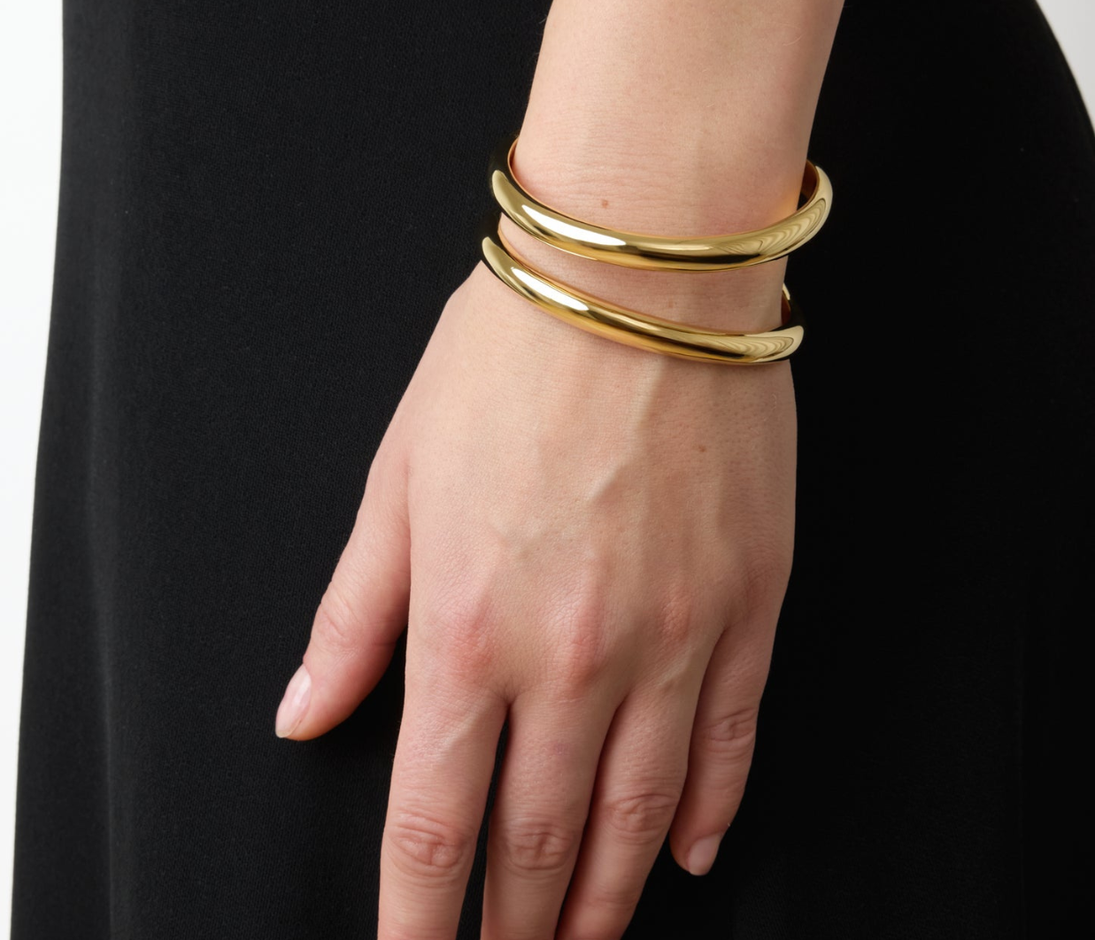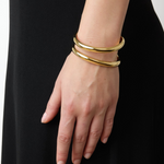Introducing the Maggie Bracelet in Gold a refined piece that embodies curvy elegance. Crafted from 18 carat gold-plated brass, which makes it ideal for layering and offering a sophisticated touch to any outfit. Depending on how you wear it and turn it, The Maggie Bracelet can have a versatile look.