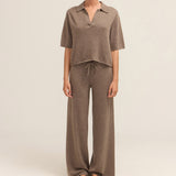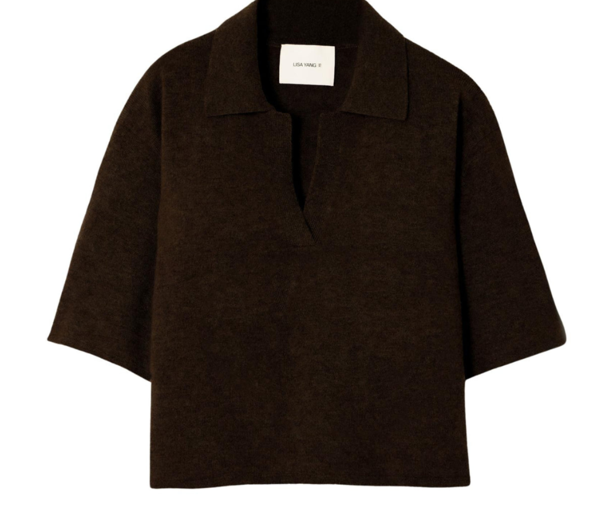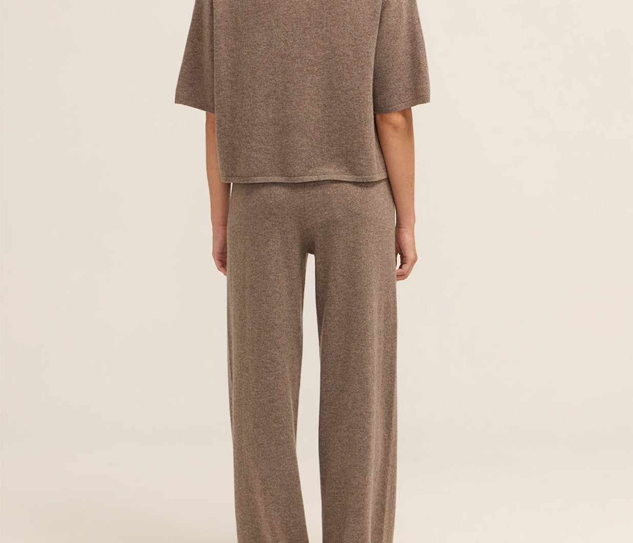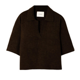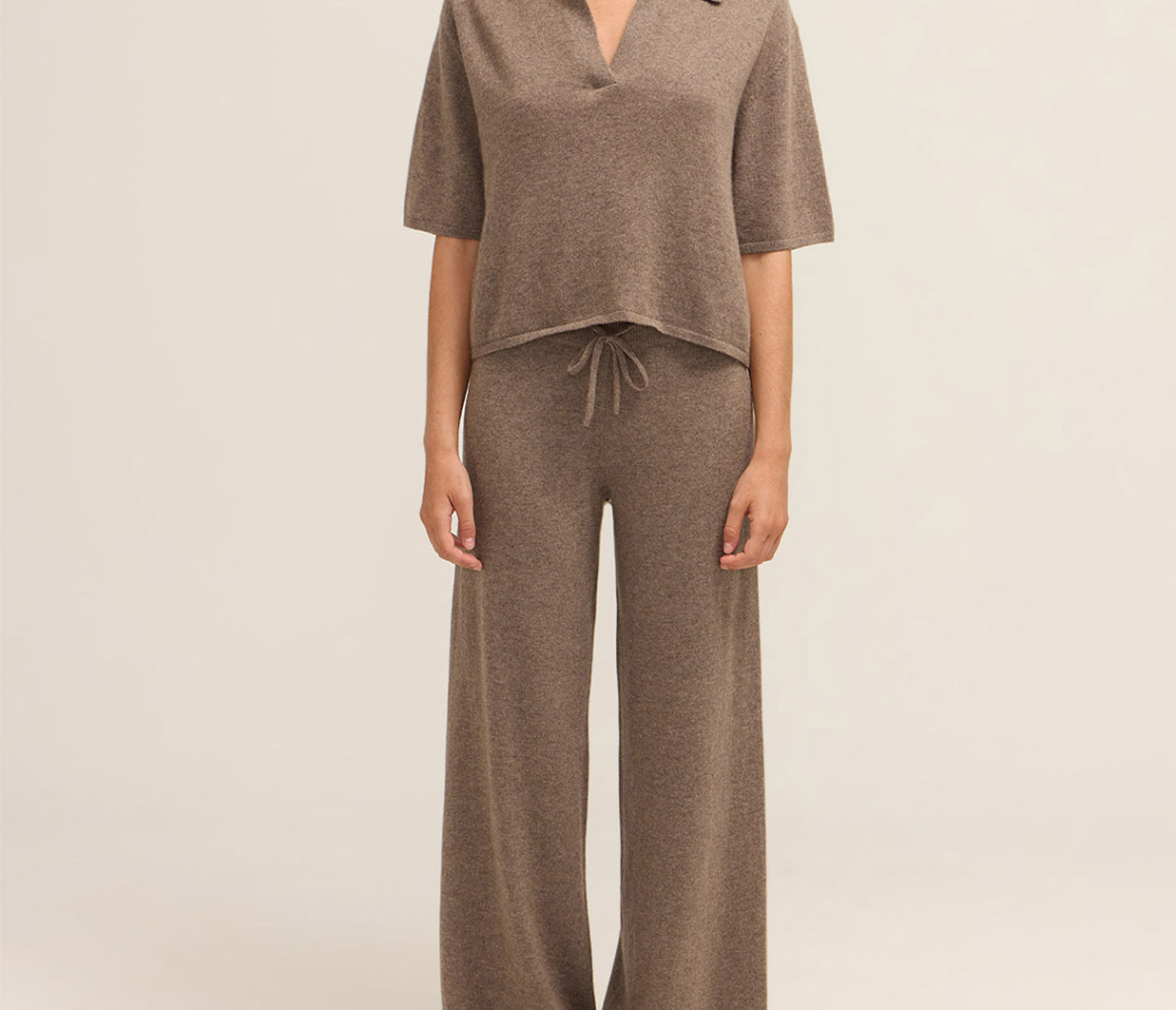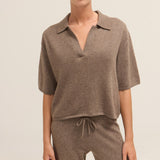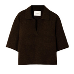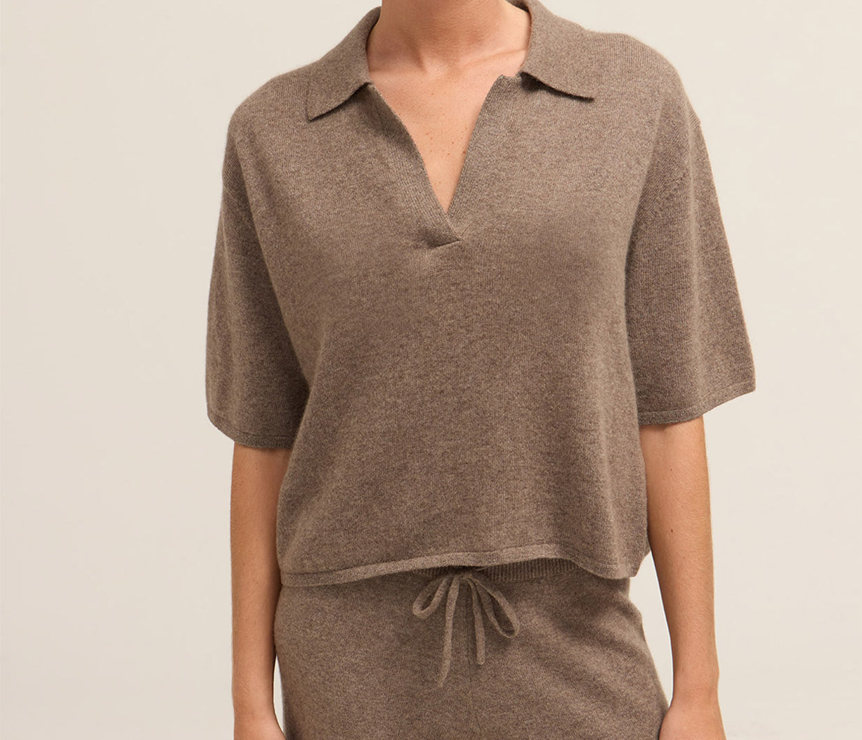 Introducing Neela T-shirt in Truffle. An effortless everyday piece, the Neela t-shirt is knitted in soft mid-weight cashmere which makes it suited for year-round wear. The relaxed fit silhouette is defined by a collared, open v-neck with an overlap design, dropped shoulders, short sleeves and a cropped hem.