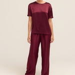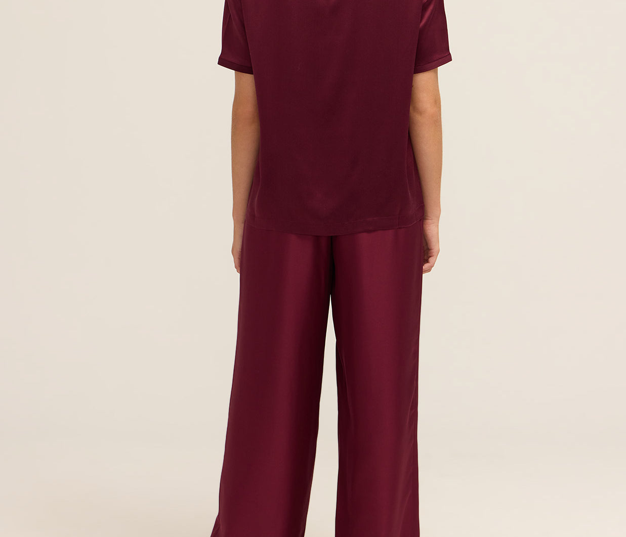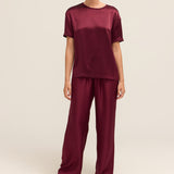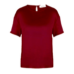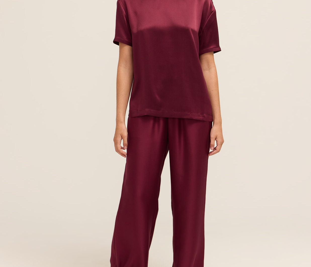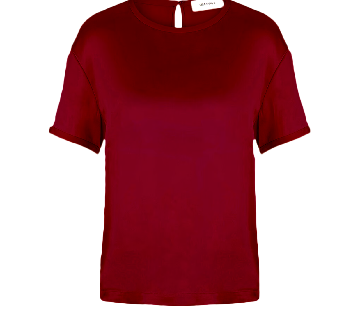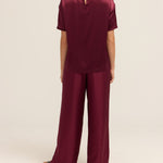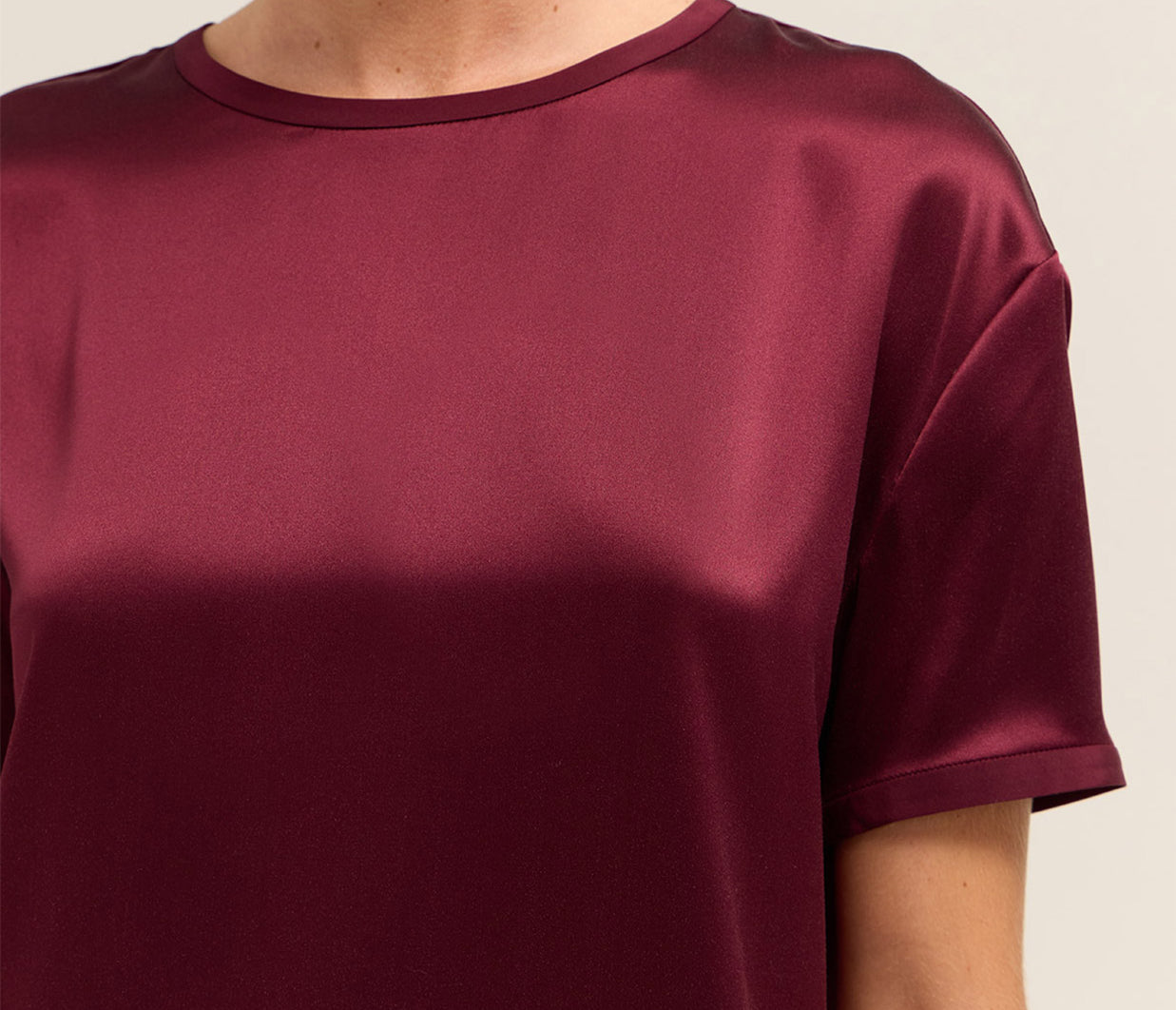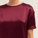 Introducing Round Neck T-Shirt in Bordeaux. In woven heavy silk, the round neck tee has a relaxed fit, neat, short sleeves and is detailed by tubular, neat panelling trims. Pair with the wide leg silk trouser for a complete, tonal look in pure silk.