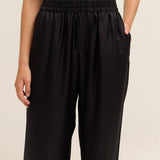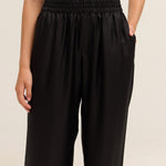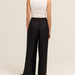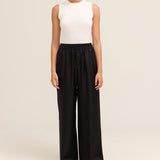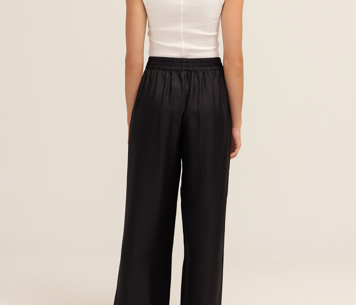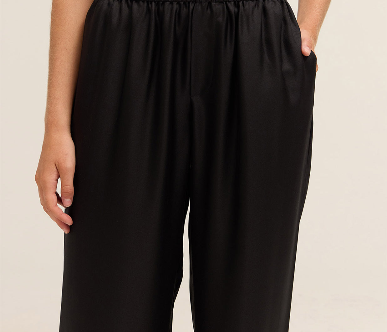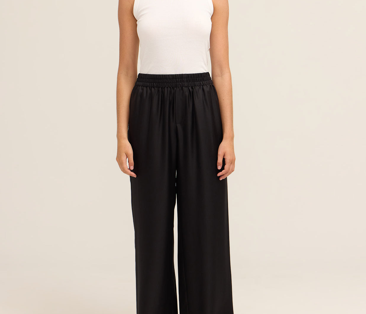 Introducing the Lisa Yang Wide Leg Trousers in Midnight. Crafted from 100% luxurious silk, these trousers offer an elegant drape and an ultra-soft feel against the skin. The wide-leg silhouette creates a flattering, flowy movement, perfect for both day and evening wear.