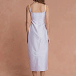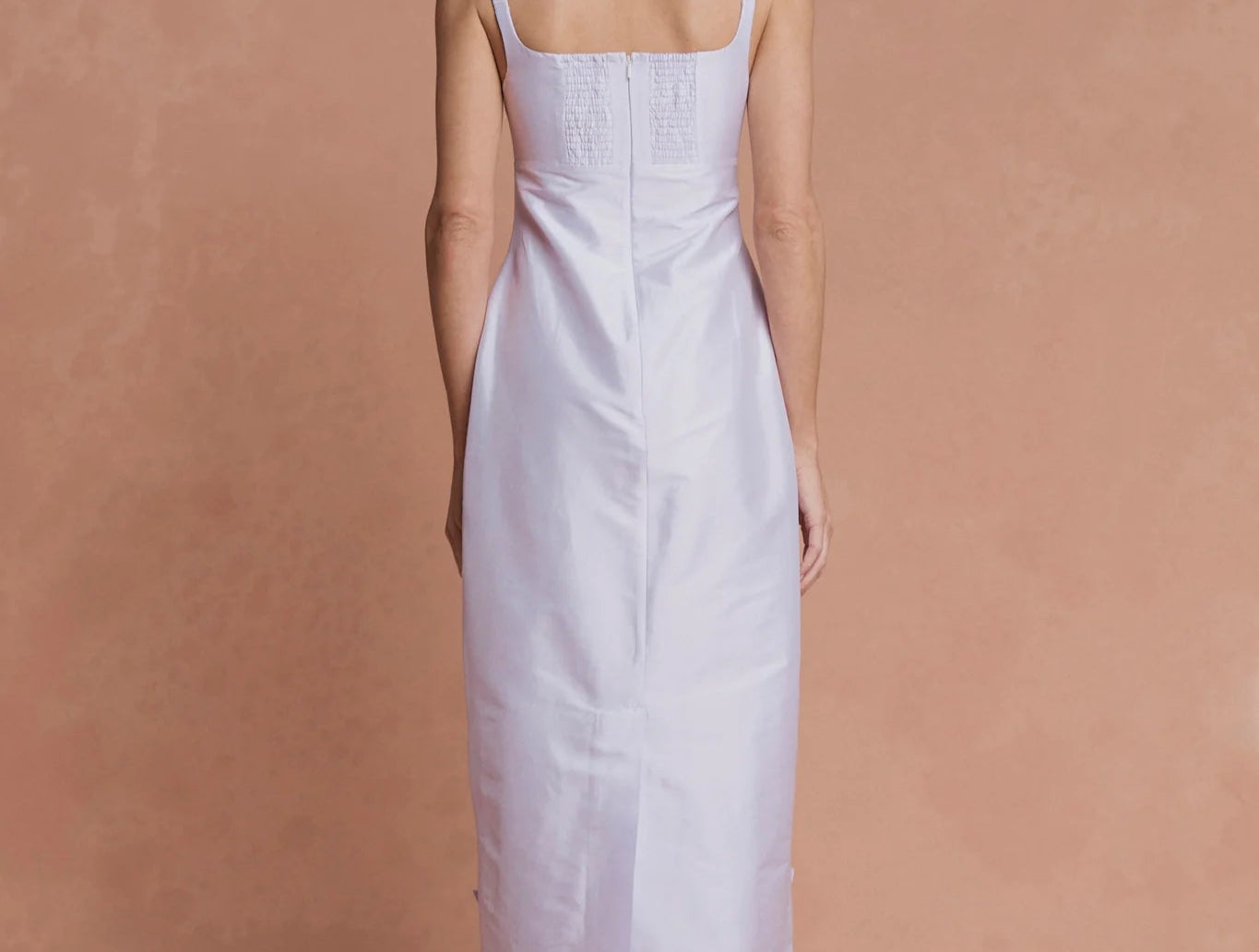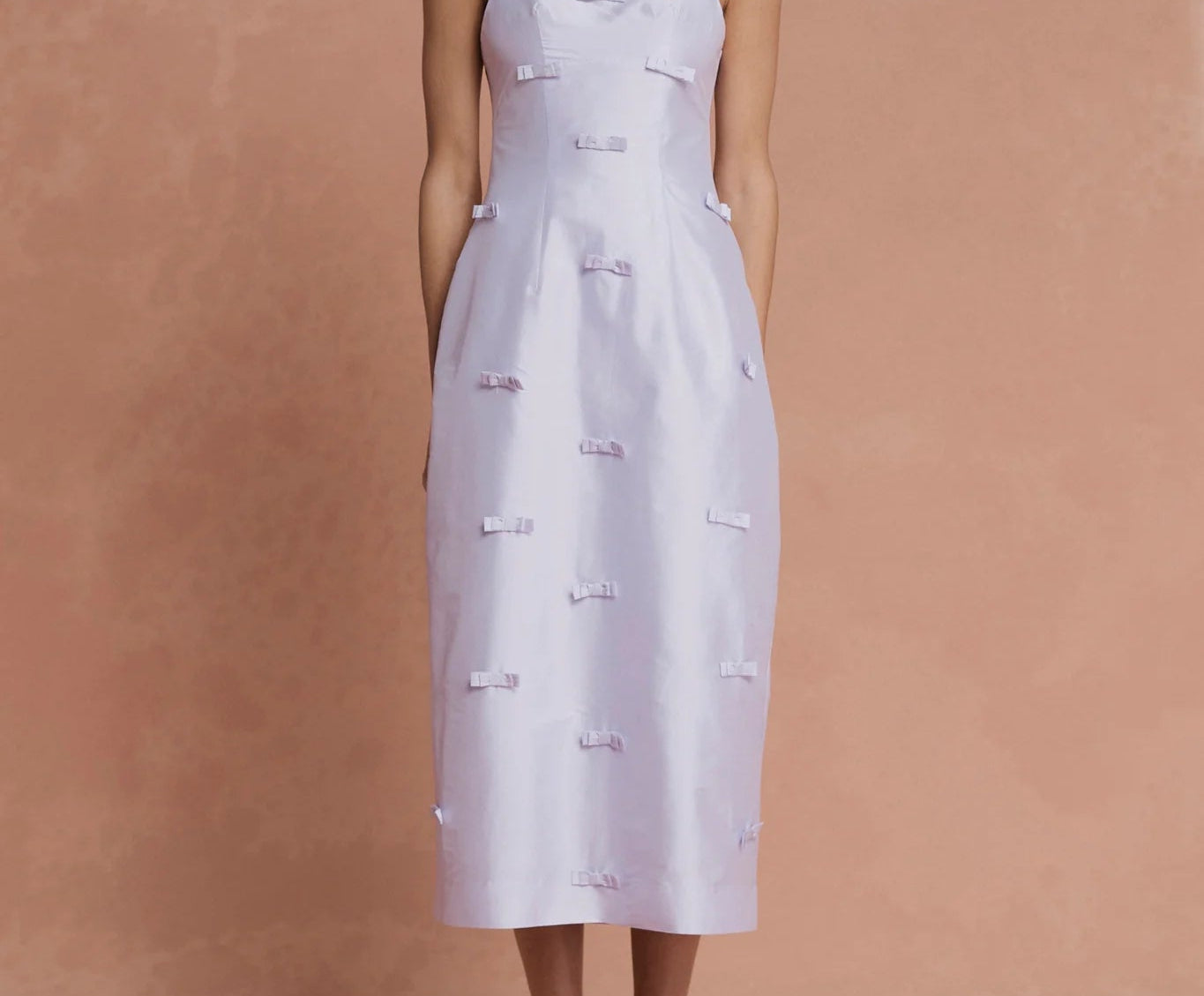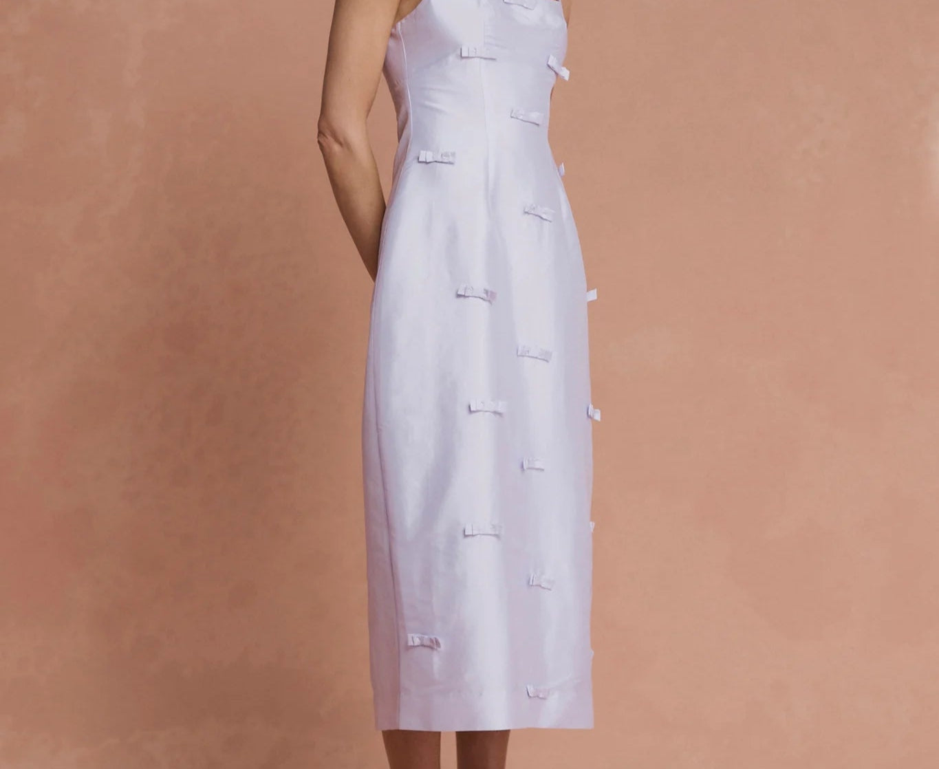 Introducing Lovaan's Camilla Dress in Lilac, a midi dress silhouette in a purple lilac hue. Designed with an A-line, form-fitting silhouette featuring thin straps, a square neckline, and stitched bow accents. Perfect for day-to-night events or formal occasions.