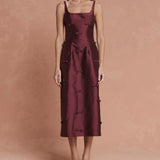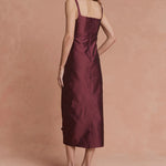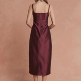 Introducing Lovaan's Camilla Dress in Plum, a midi dress silhouette in a rich plum hue. Designed with an A-line, form-fitting silhouette featuring thin straps, a square neckline, and stitched bow accents. Perfect for day-to-night events or formal occasions.