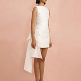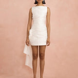 Introducing Lovaan's Melody Mini Dress in Ivory Taffeta, a mini dress in ivory cream. The Melody dress is designed with asymmetrical pleats that gently wrap the body, finishing in an oversized bow for an extra touch. Perfect for a day to night occasion.