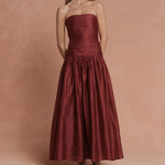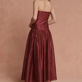 Introducing Lovaan's Nancy Dress in Garnet, a maxi-length strapless gown dress silhouette in a burgundy red garnet color hue. Designed with a gathered, layered bodice and a form-fitting silhouette that falls into a voluminous ruched skirt. Perfect for day-to-evening occasion dressing.