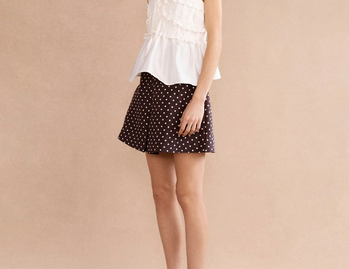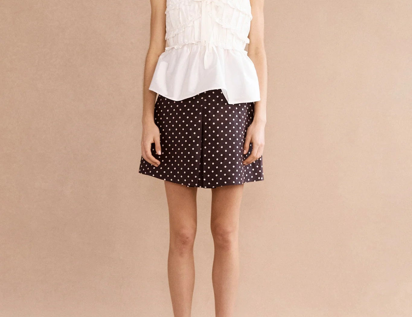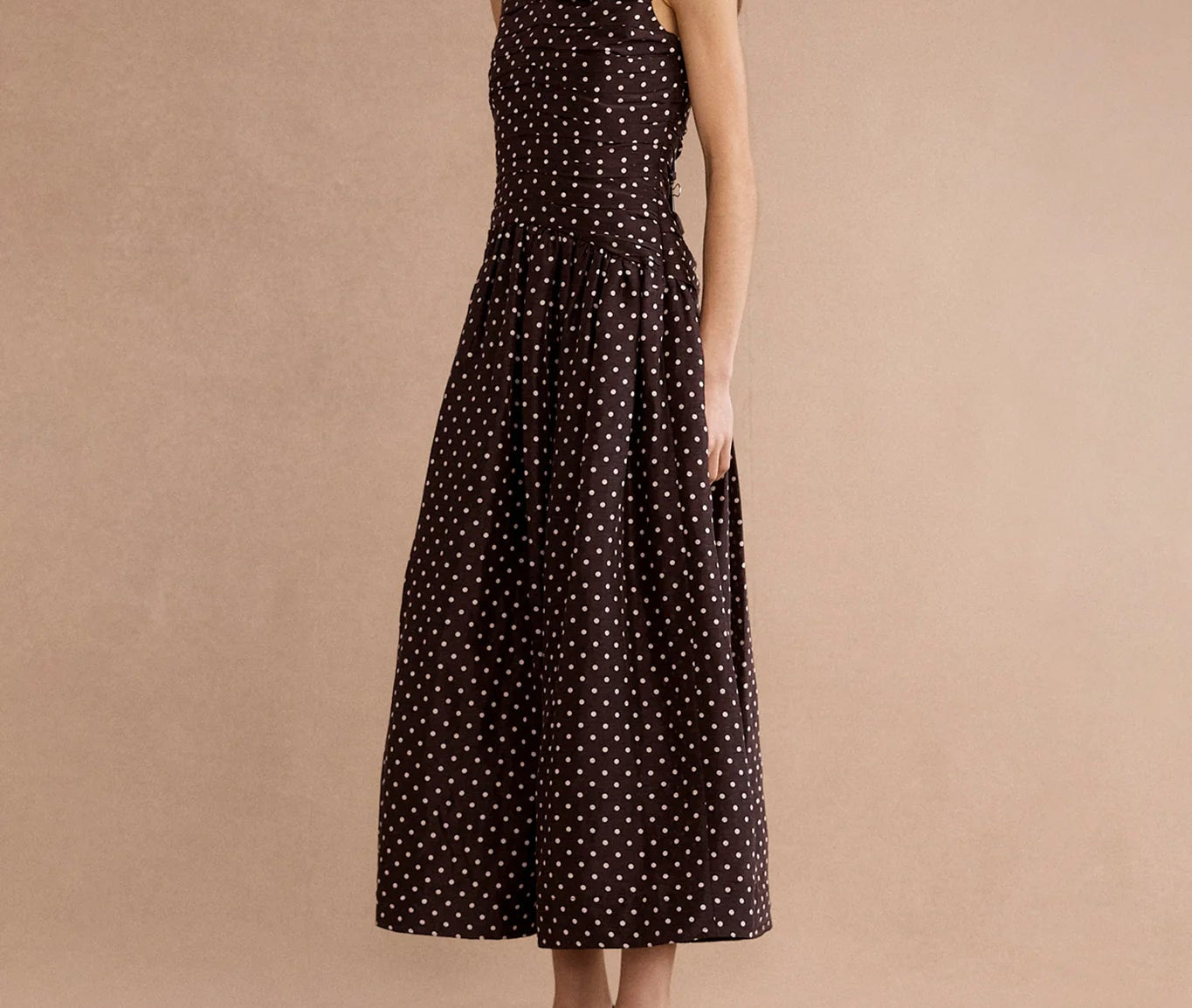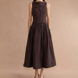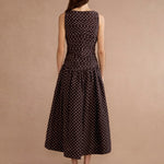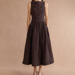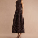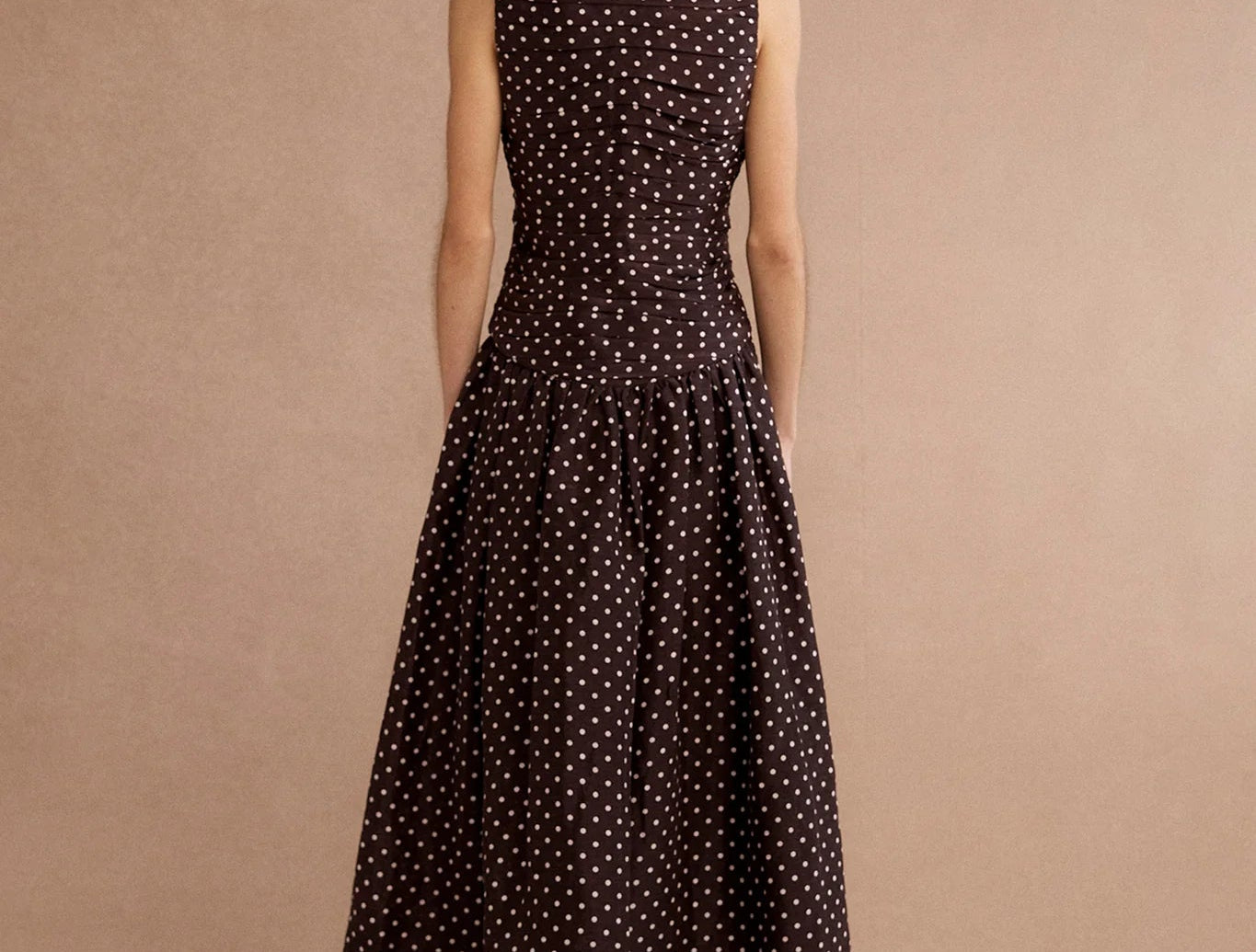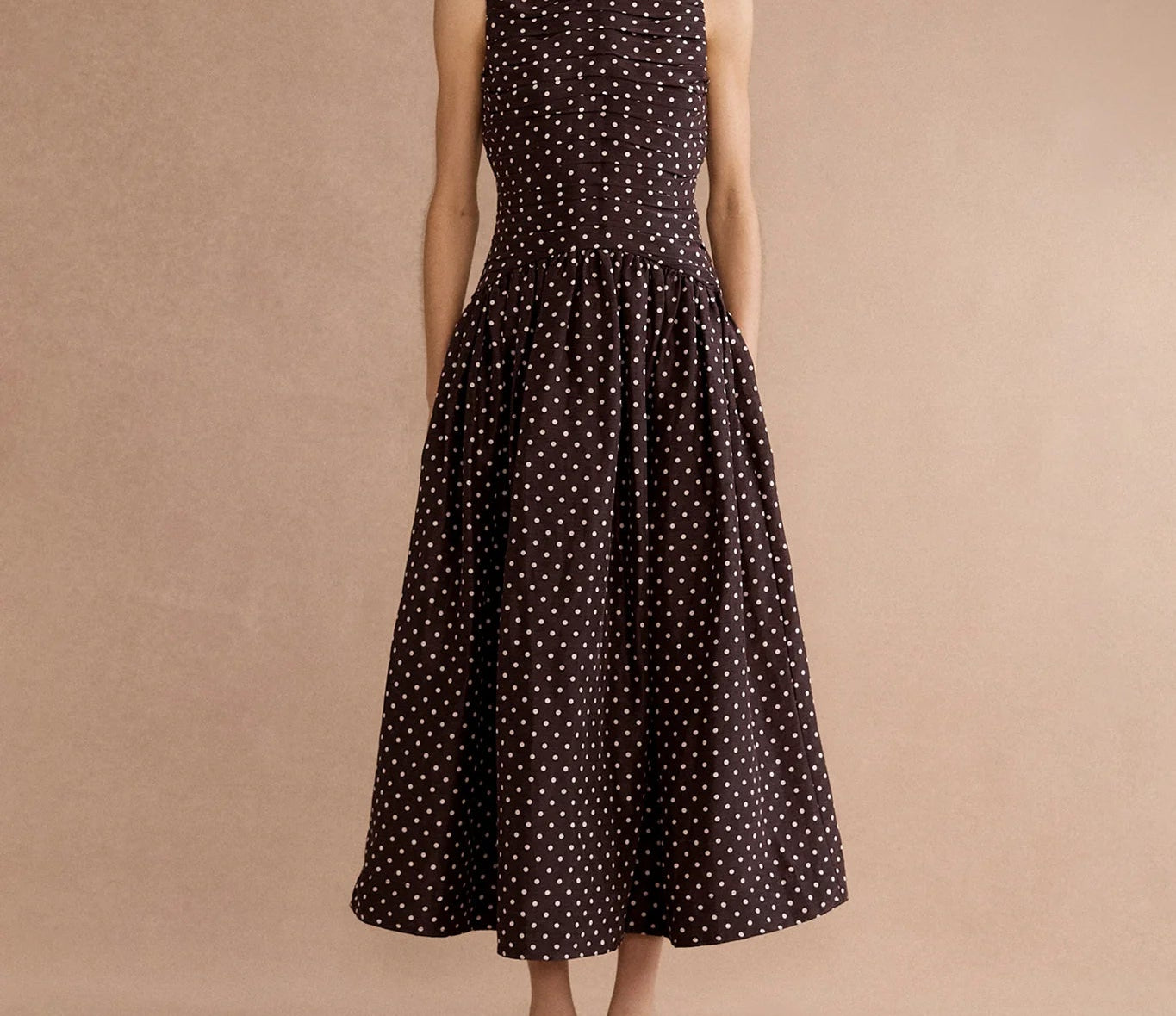 Introducing Lovaan’s Val Dress in Cacao Spot, a sleeveless midi silhouette in rich brown and white polka dot. Featuring a ruched bodice and a softly draped full skirt, the Val Dress flatters the waistline and finished with an invisible side zip and full lining for a refined, elegant finish.