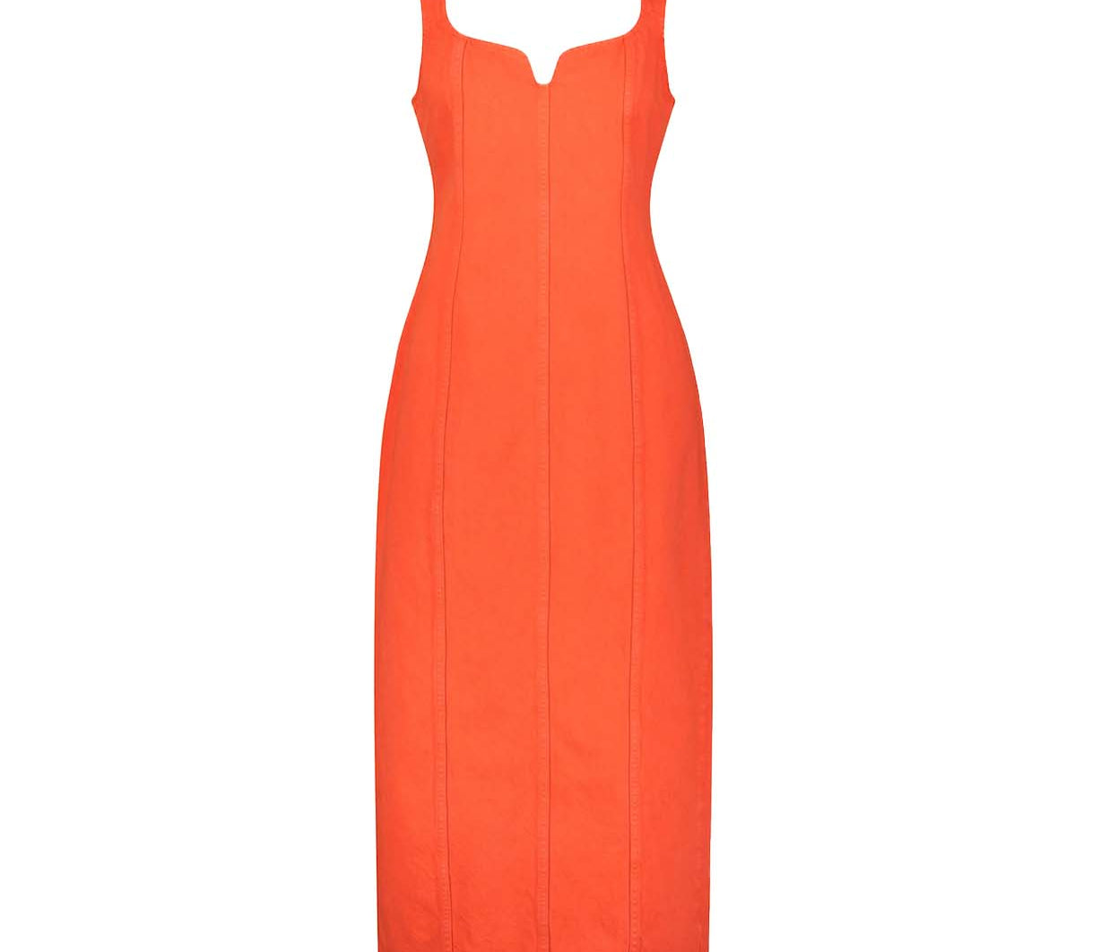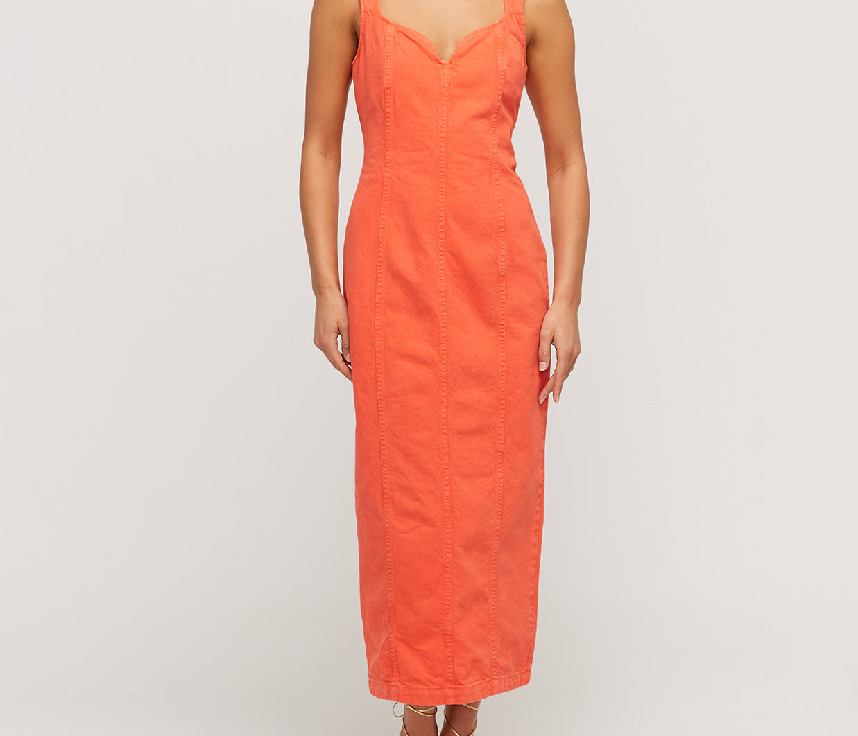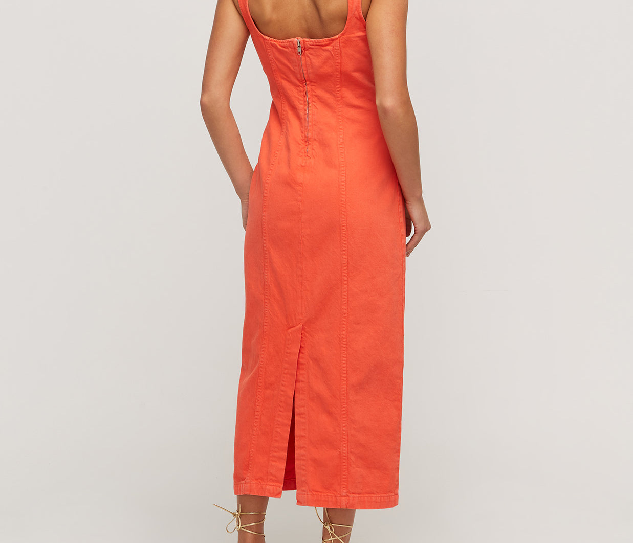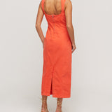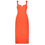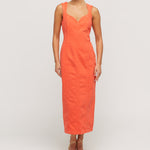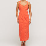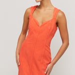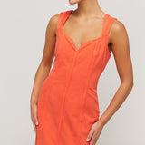 Indya is a classy statement piece. In a vibrant hue of citric orange, this denim staple features princess seams to create a tailored, form-fitting silhouette. Featuring a sweetheart neckline and exposed metal zipper at the back. Pair with a sleek heel and gold jewellery for an evening look.
