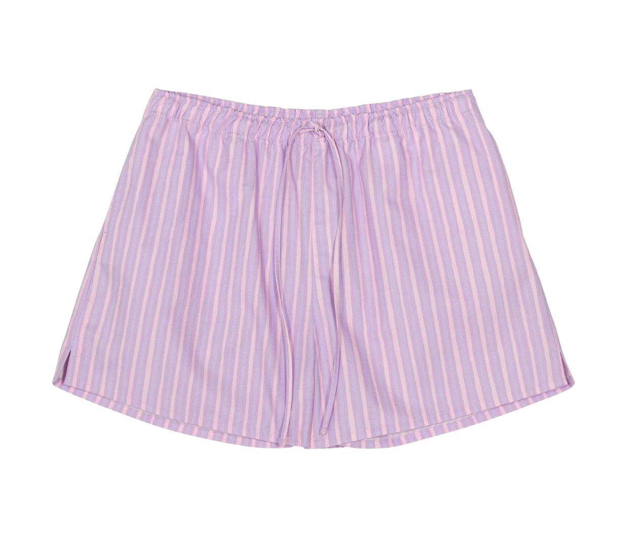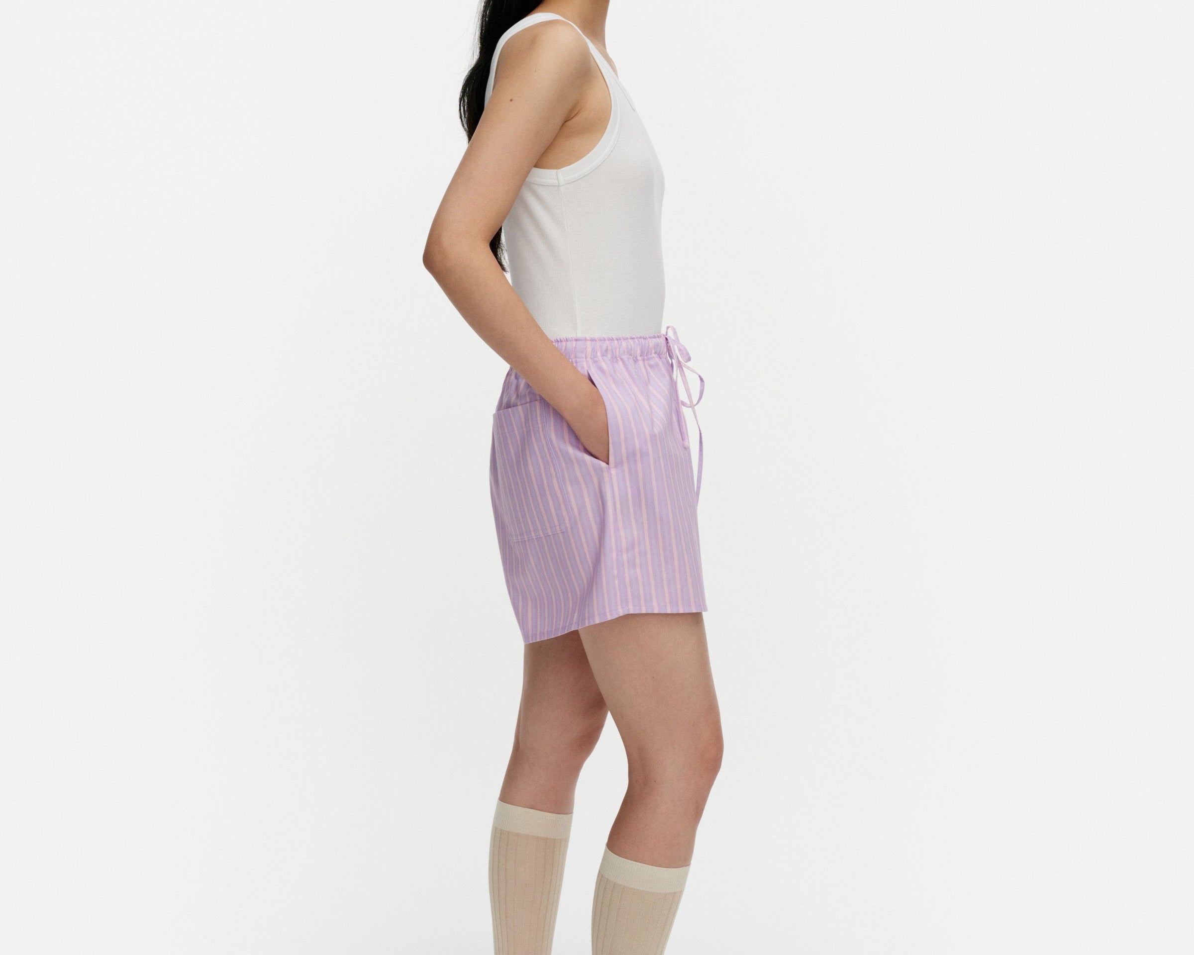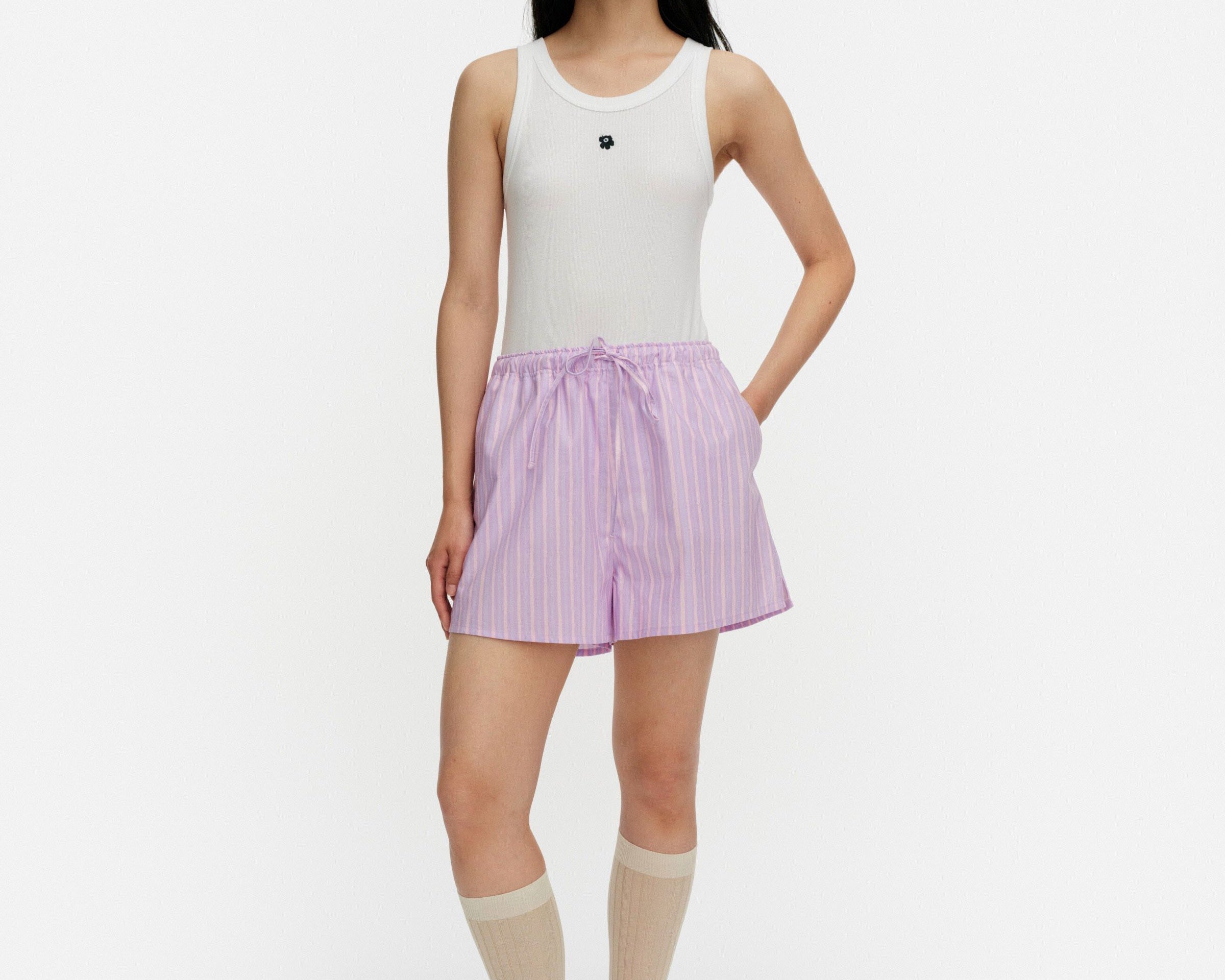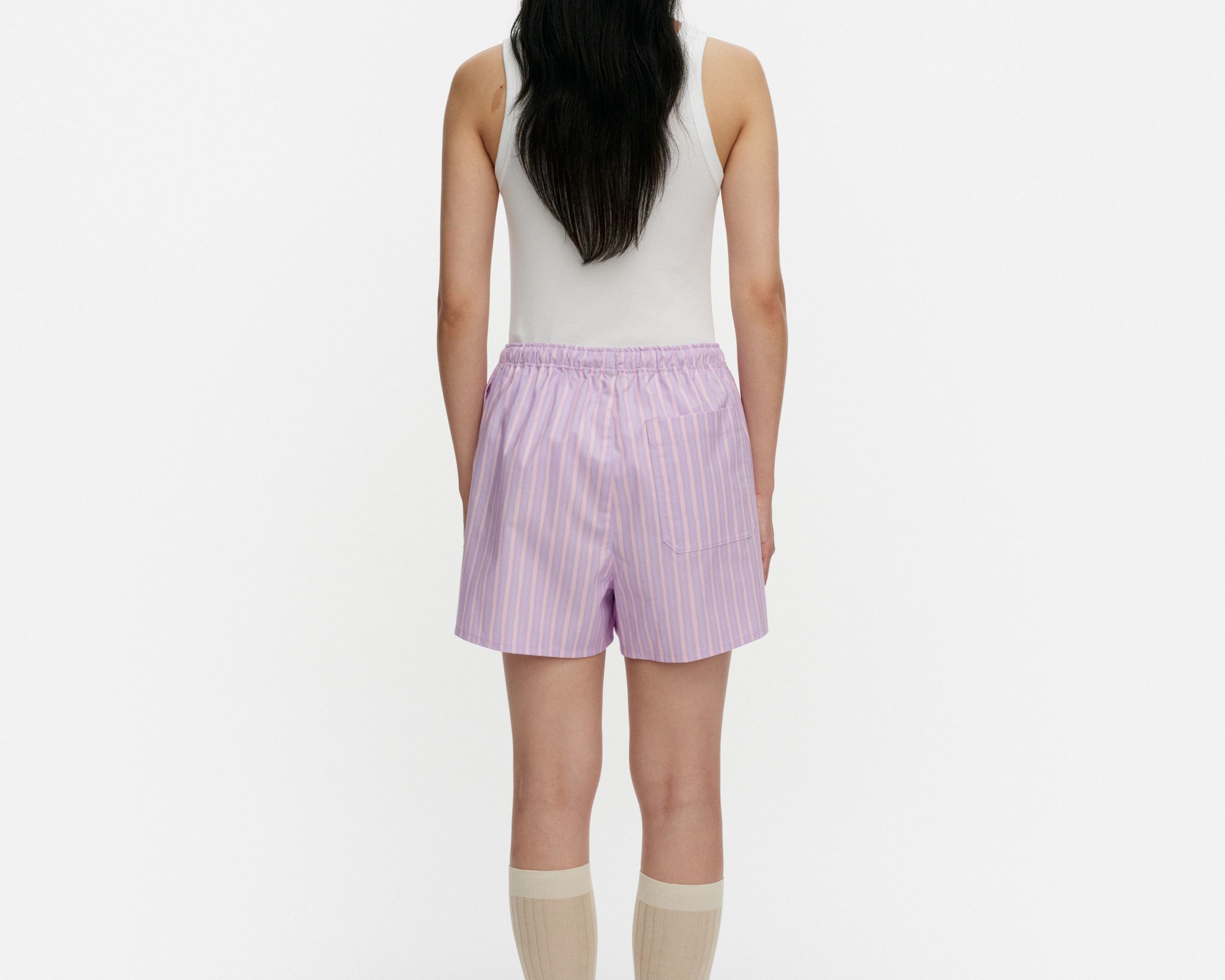 Introducing Marimekko's Diagonaali Piccolo Kioski Shorts in Pink Lilac, a mini short silhouette in pink purple lilac stripes. The Diagonaali short is designed with a Helsinki print featuring an elastic waistband with drawstrings, side seam pockets, and one patch pocket in the back.