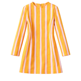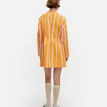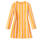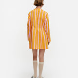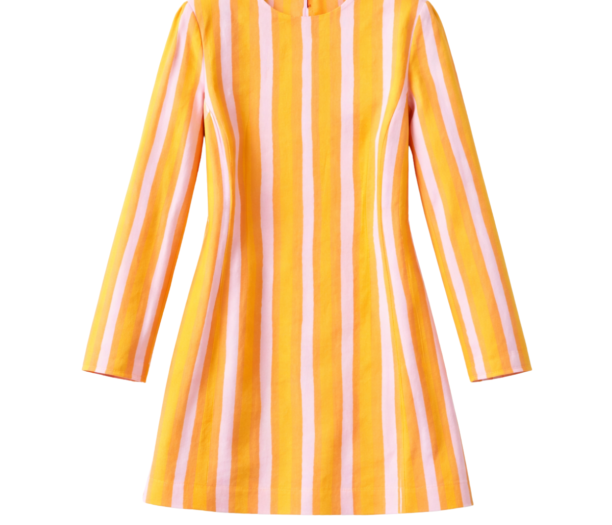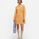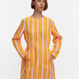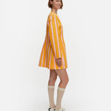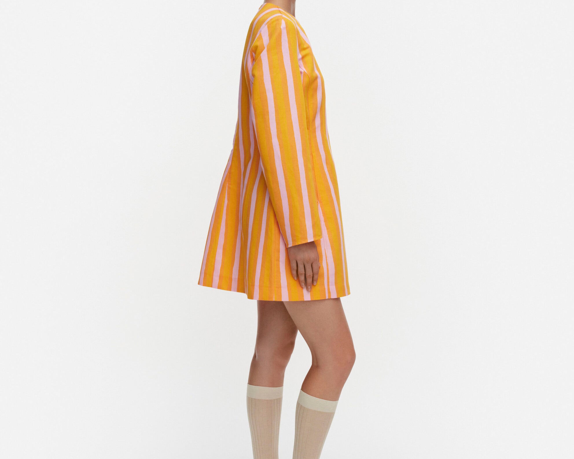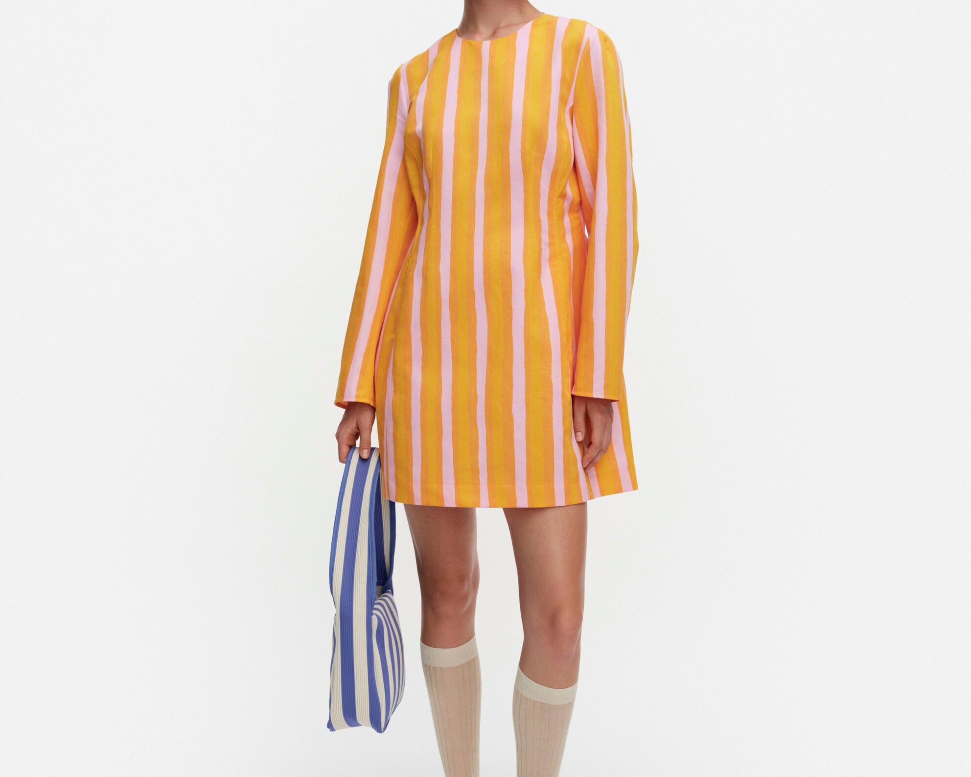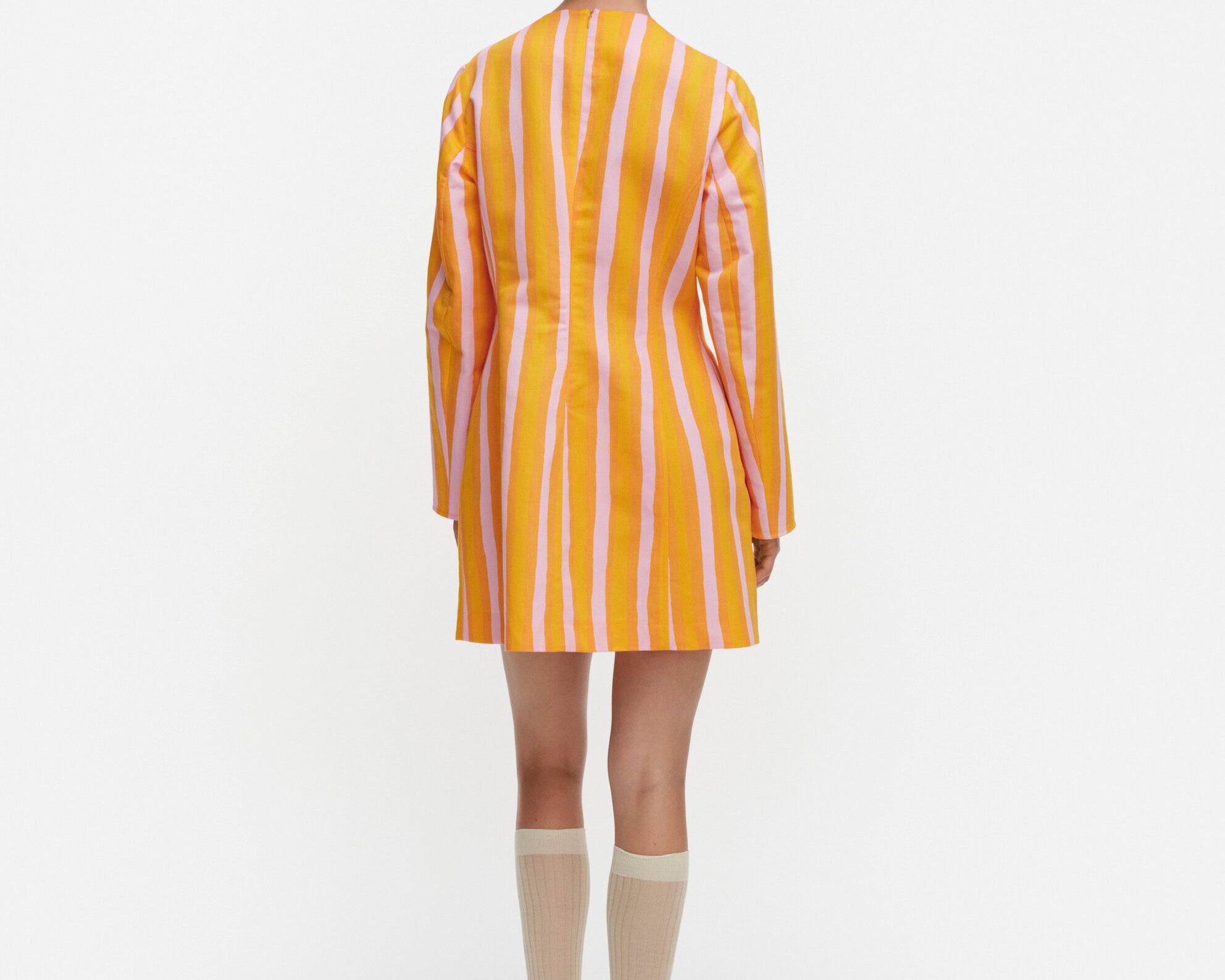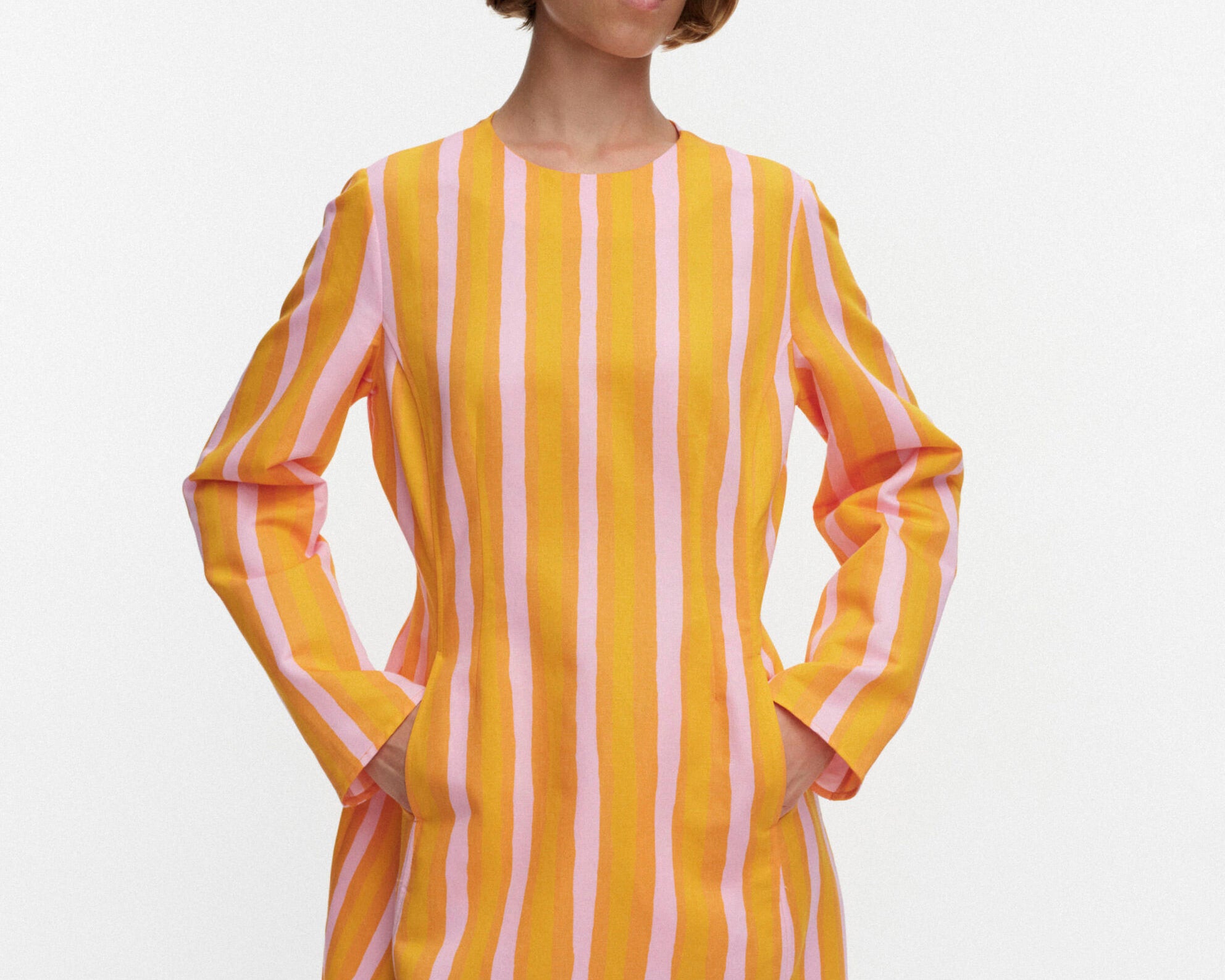 The Iloinen dress has a slim fit, a straight top, and a flared cut hem, and it features the Piccolo pattern, which is printed in Helsinki. The mini dress has an O-neck with a concealed zipper in the back seam and side panels with pockets in the front seams. The dress has long slim sleeves and darts at the front waist that give it a more fitting shape.