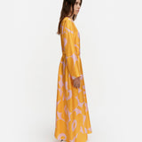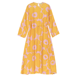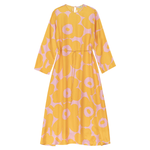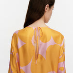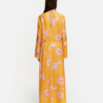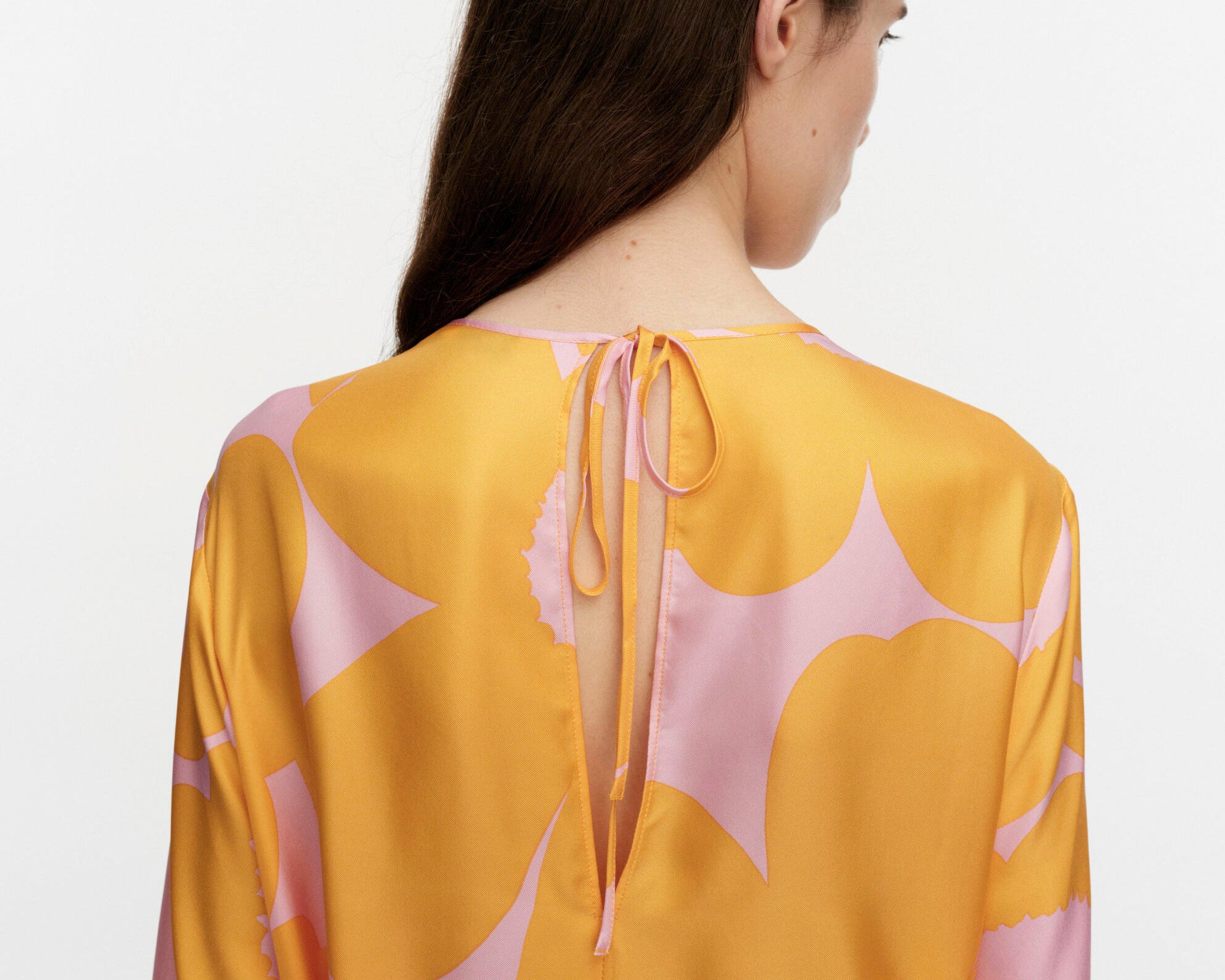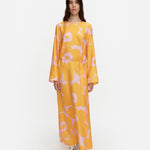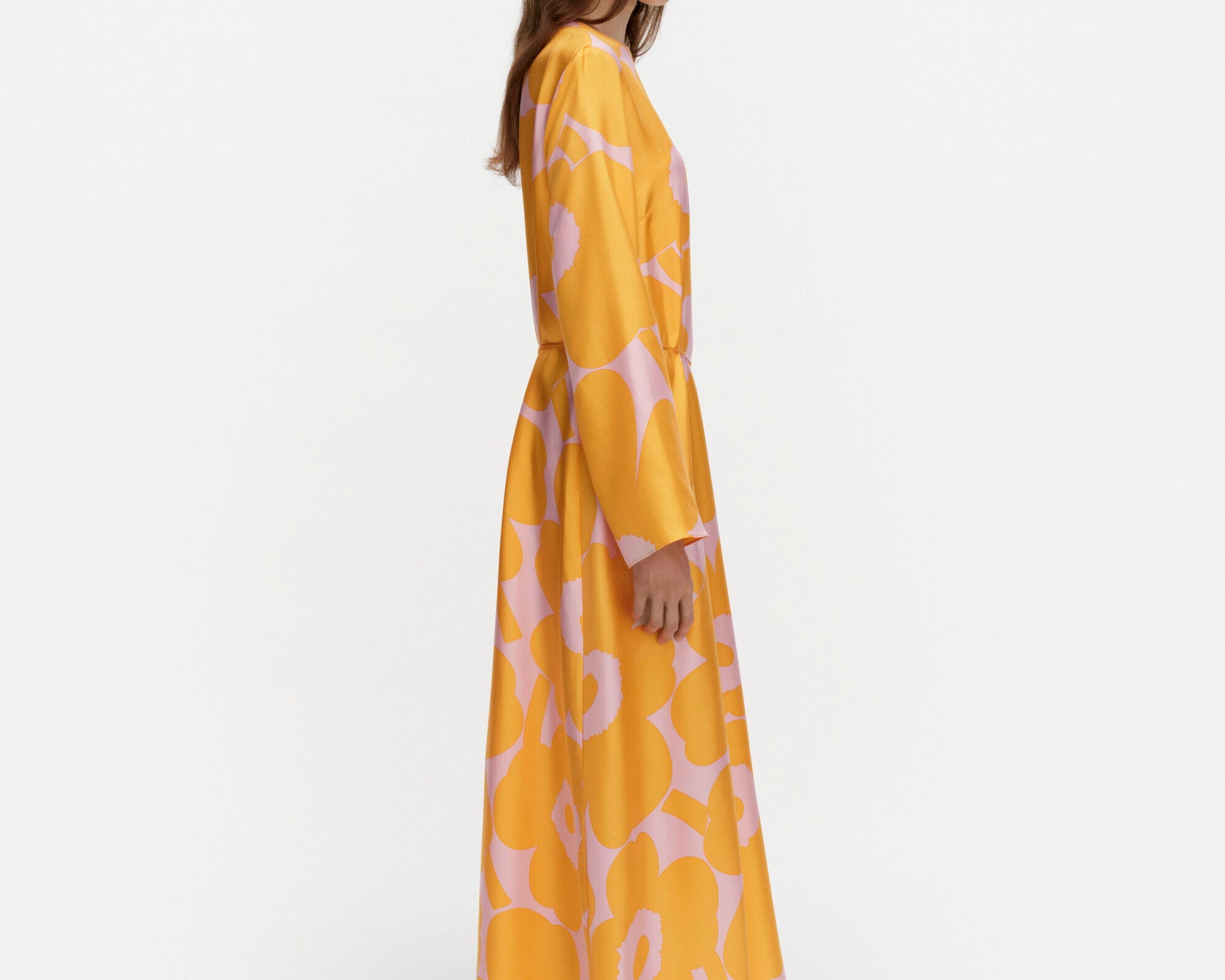 Introducing Marimekko's Kaunista Unikko Silk Dress in Pink Orange, a maxi-length, long-sleeve dress silhouette. Designed with an O-neck, the dress features a deep V-slit and ribbon closure in the back neckline with side seam pockets and a narrow, separate belt.