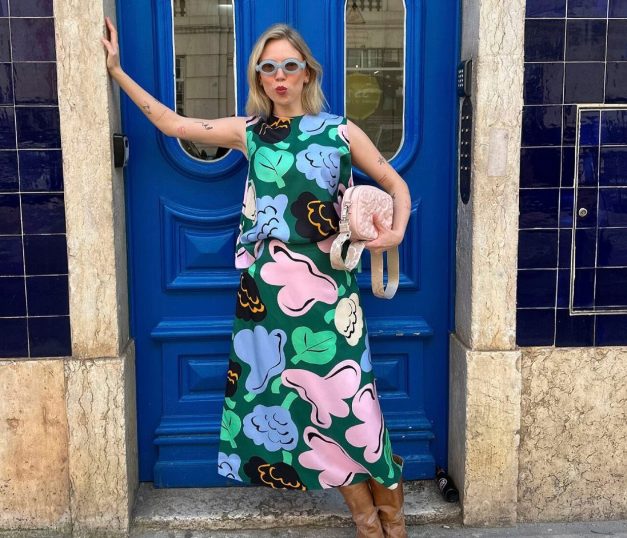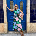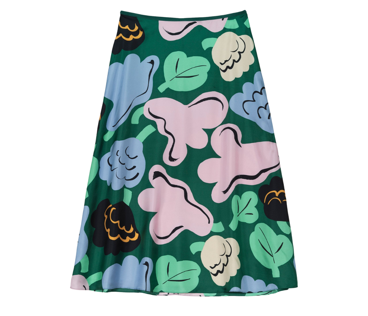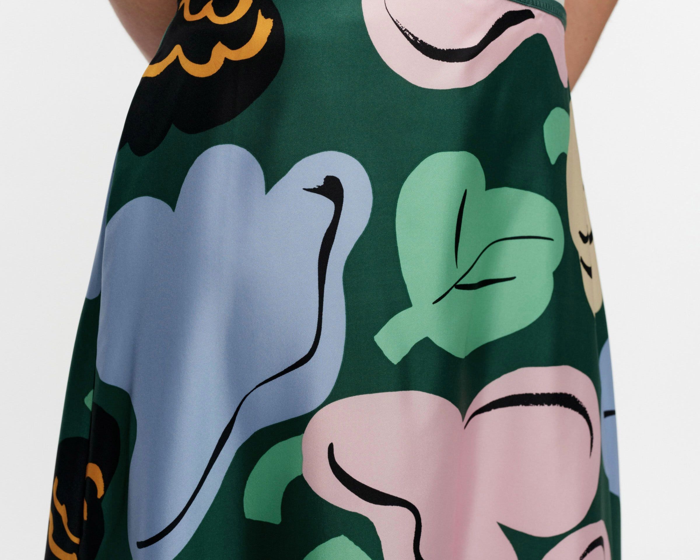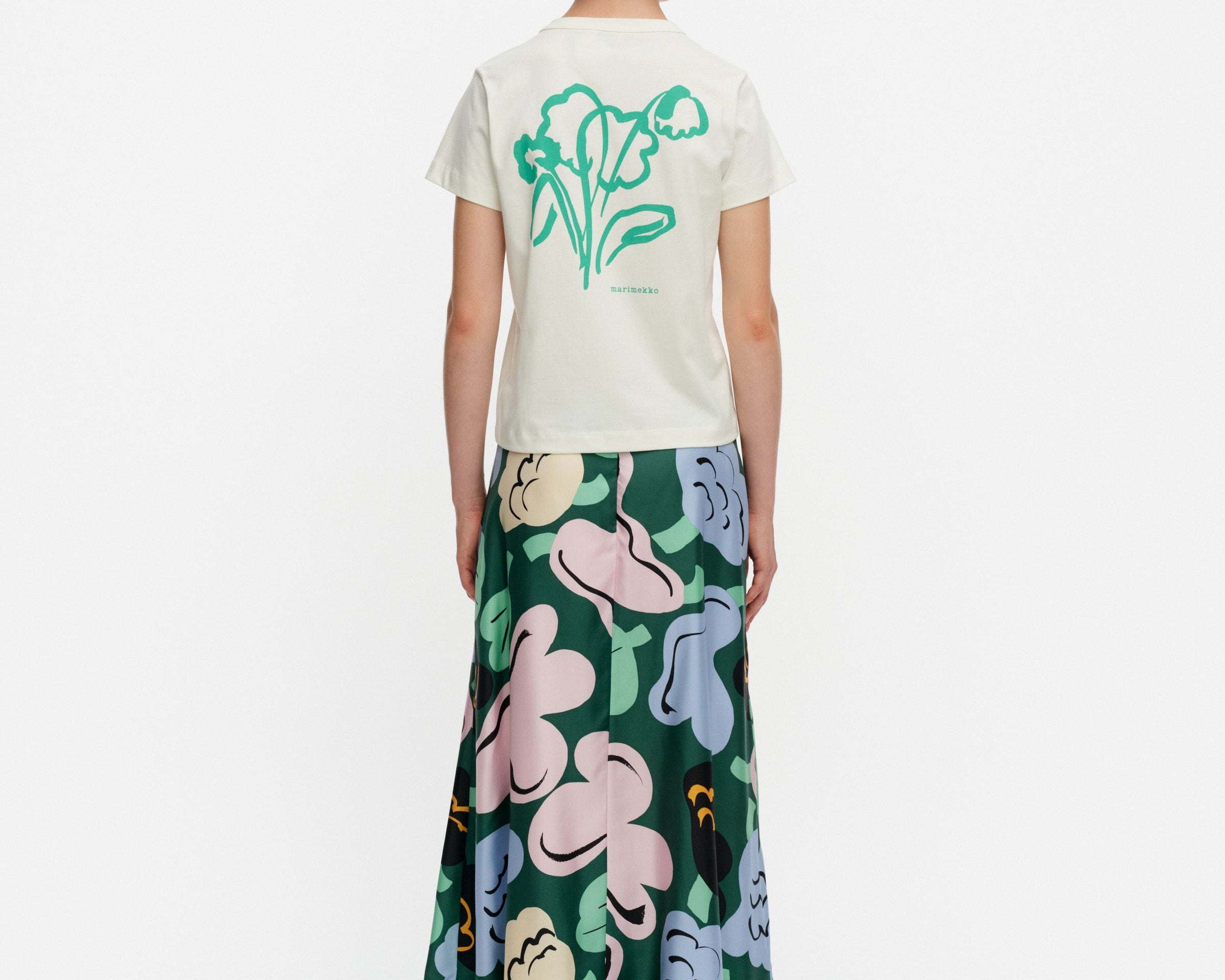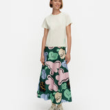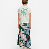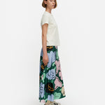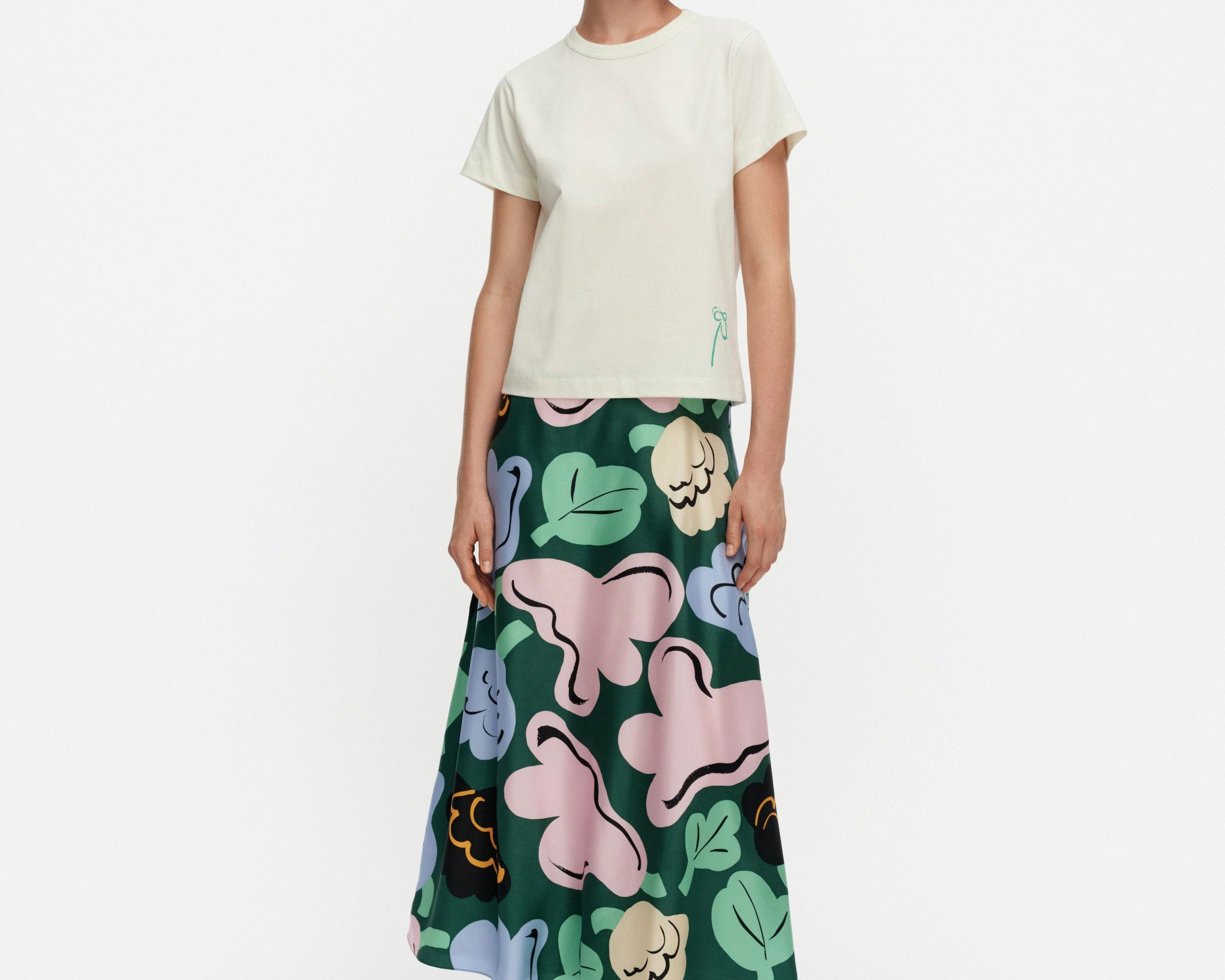Introducing Marimekko's Koostumus Kukasta Kukkaan Silk Skirt in Green and Pink, a midi-length skirt silhouette. Designed with the brand’s exclusive floral print, inspired by the playful flight of bumblebees from bloom to bloom. Crafted with a subtle flared silhouette, it’s finished with elastic gathering at the waist and a hook-and-eye closure for a comfortable fit. Pair with a simple tee for an effortless summer look.