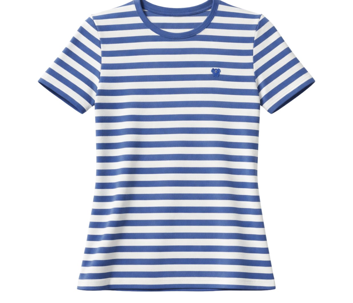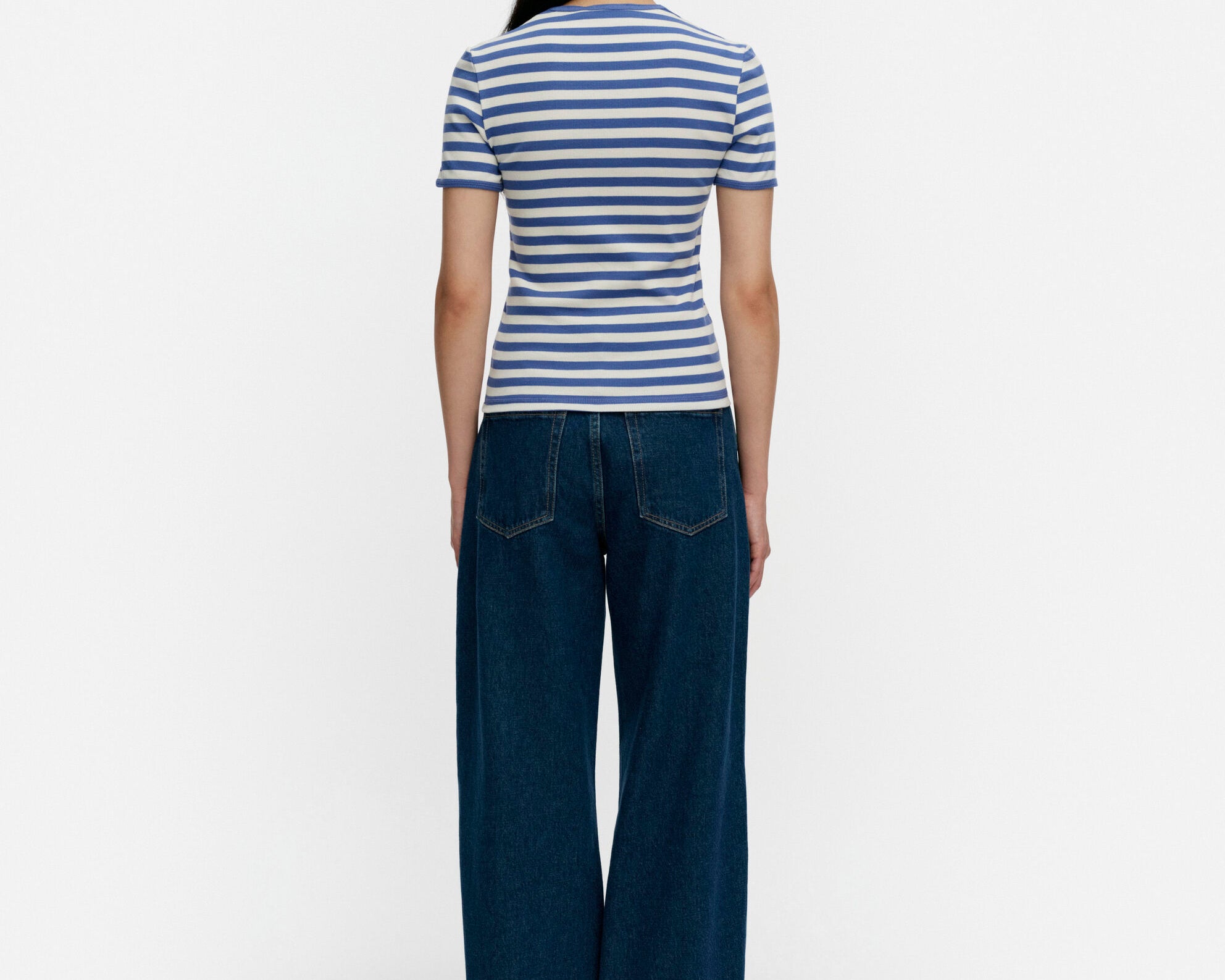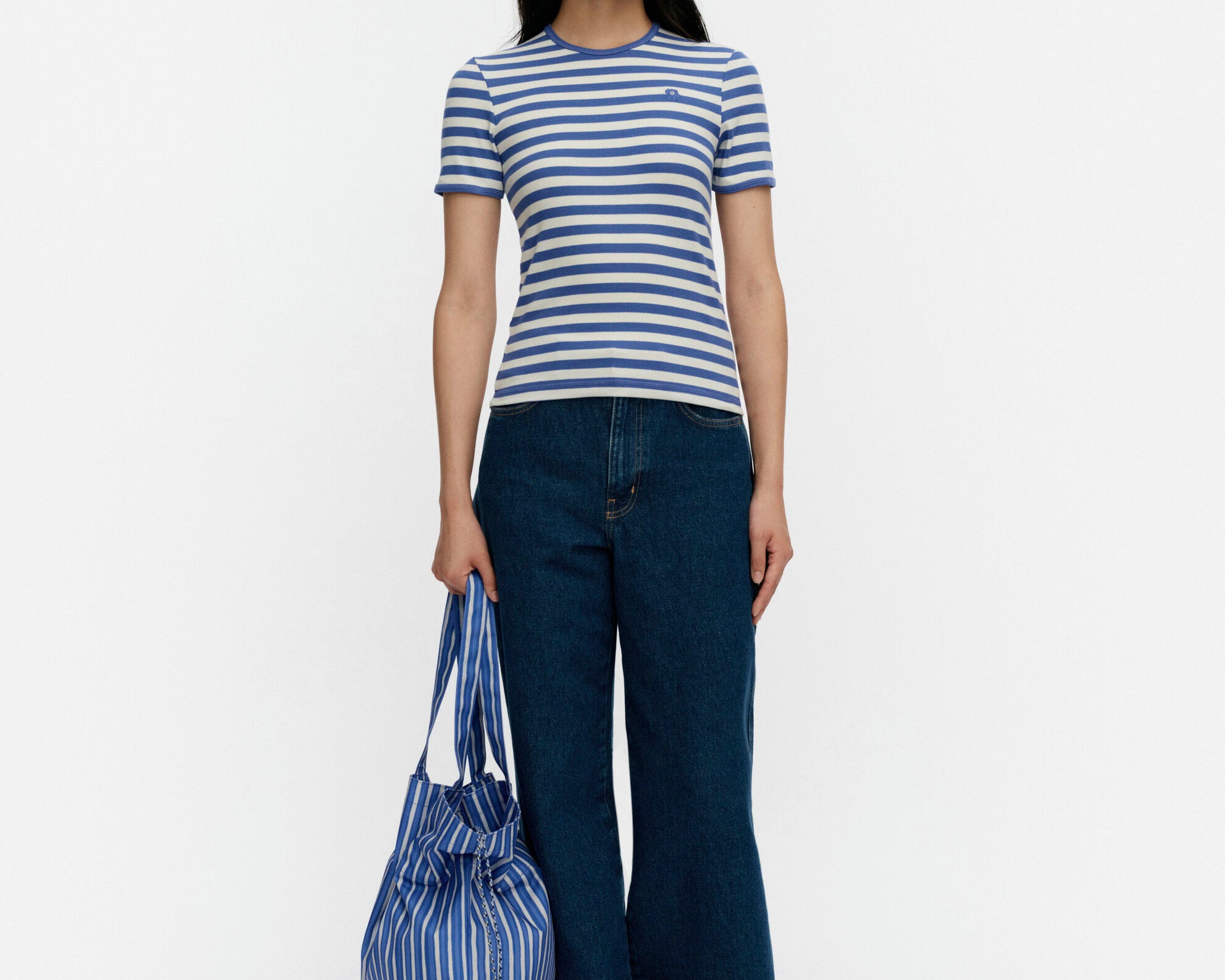 The flower t-shirt has a slim fit, a Tasaraita pattern and a small embroidered Unikko flower on the chest. The round neckline and cuffs are finished with a ribbed edge.