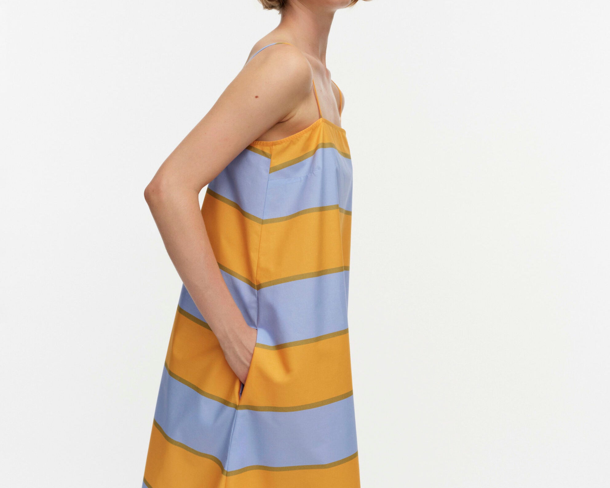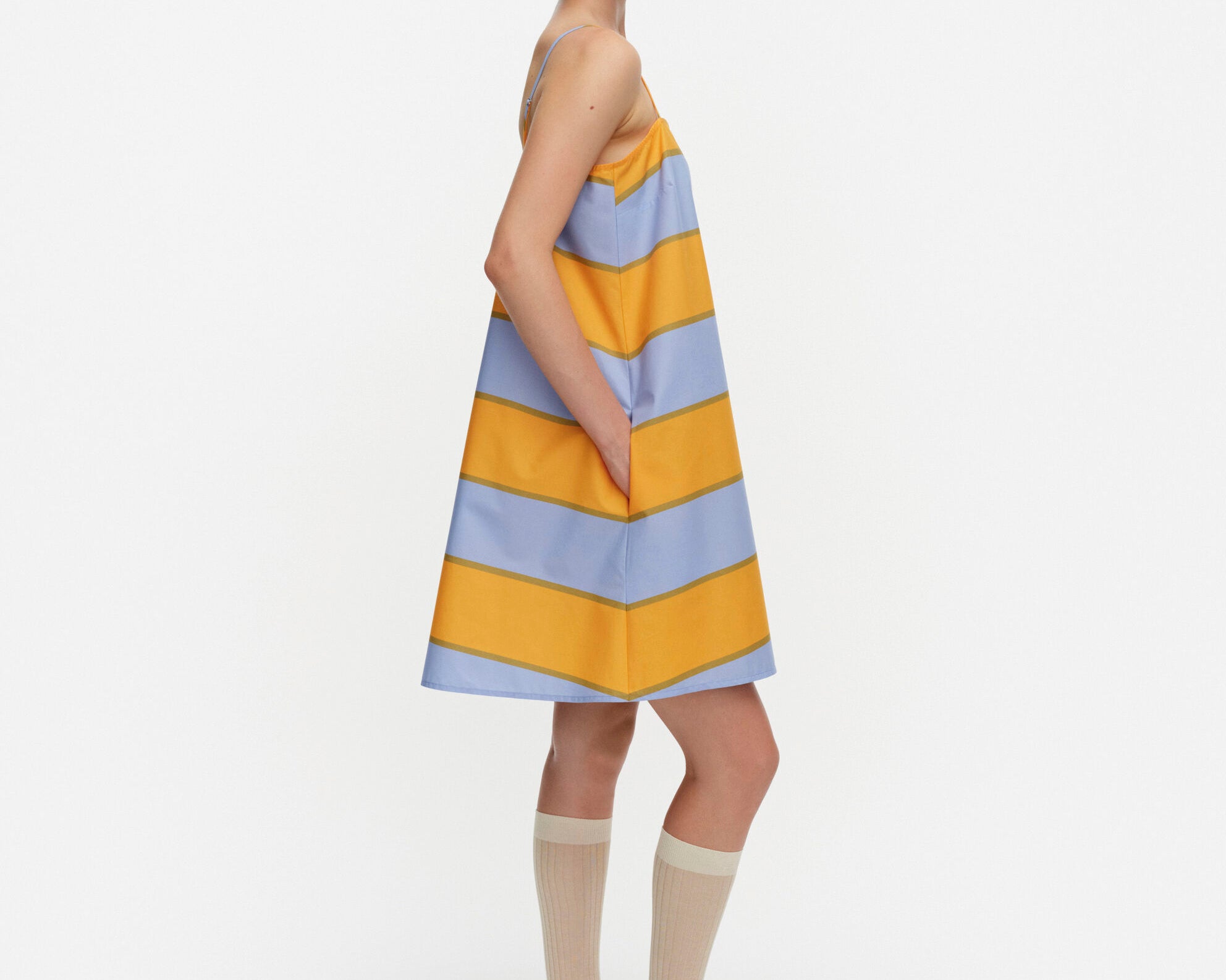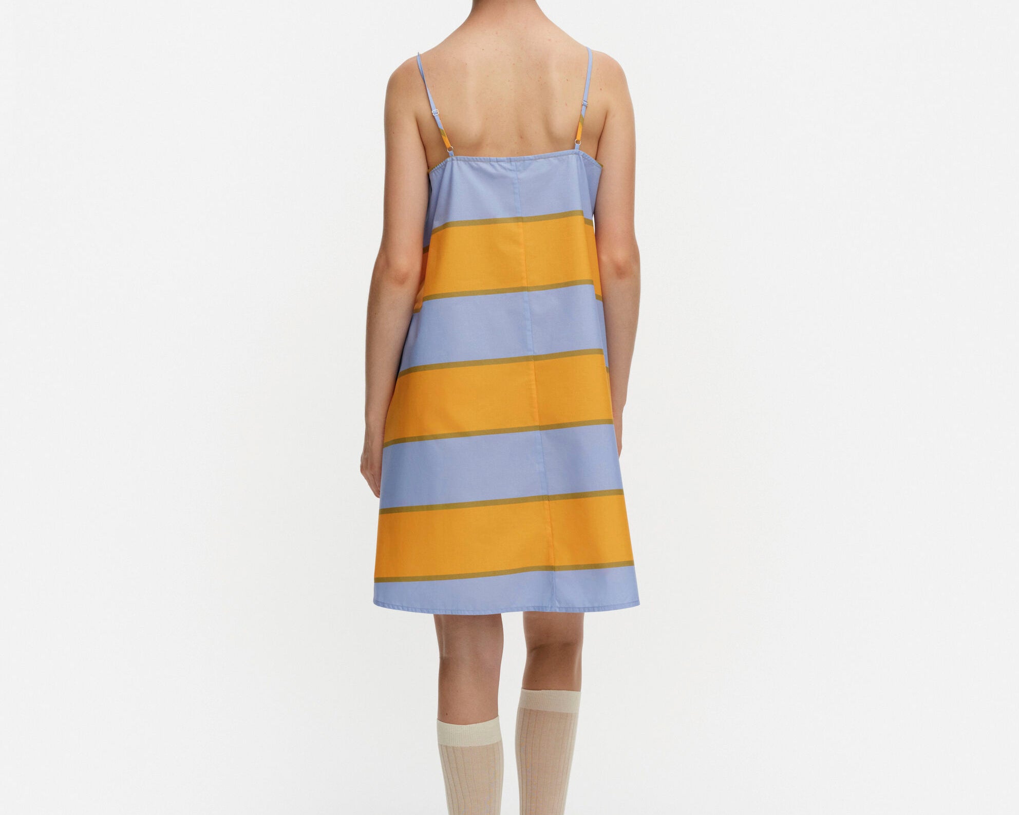 The Pelit dress has a slim, A-line fit, and it features the Galleria pattern. The mini dress has short spaghetti straps, a straight neckline, a concealed zipper in the left side seam, and a central back seam. The bust darts give the dress a more fitting shape.