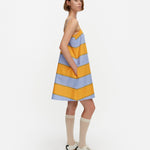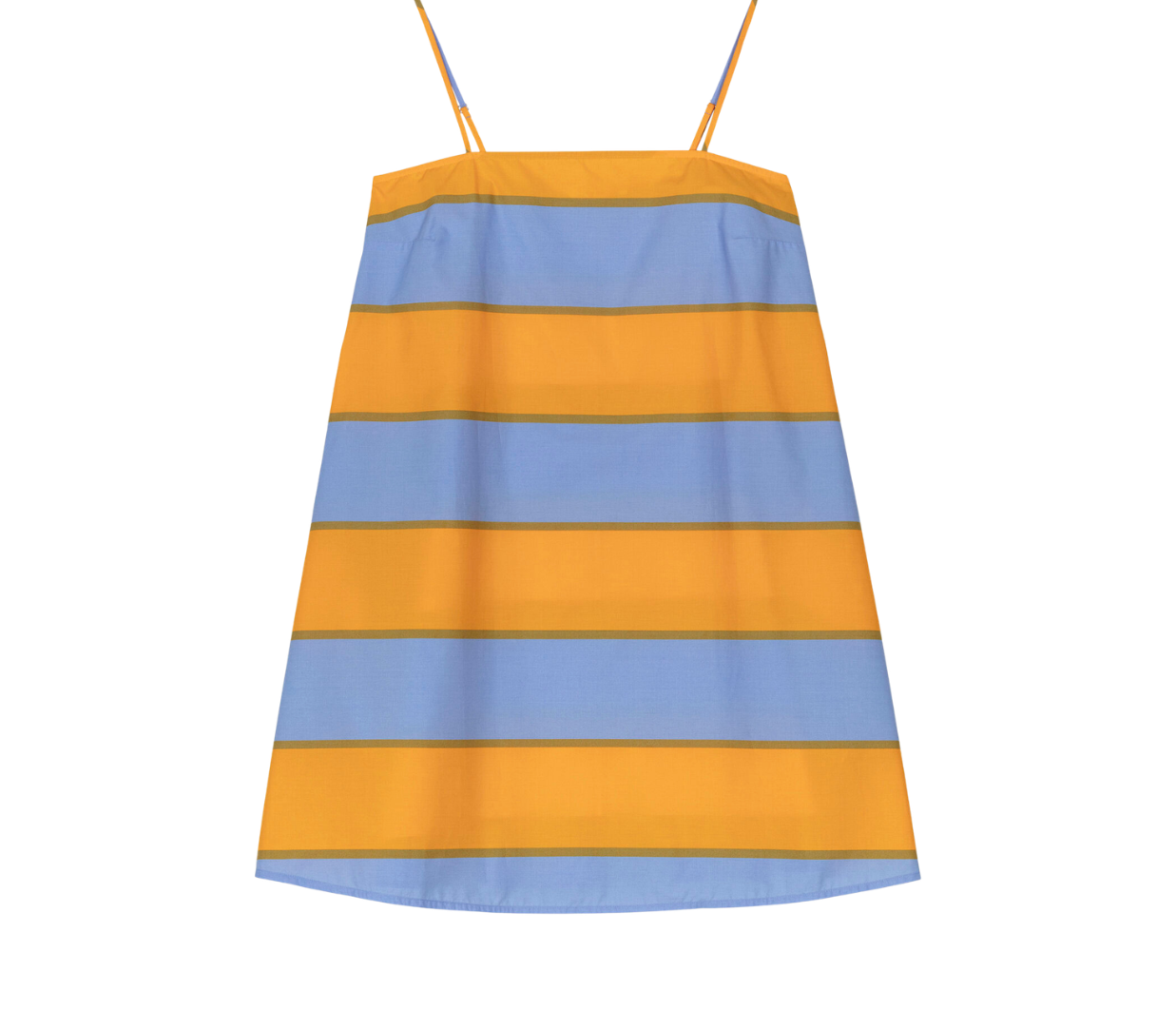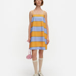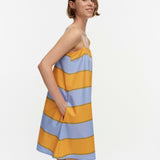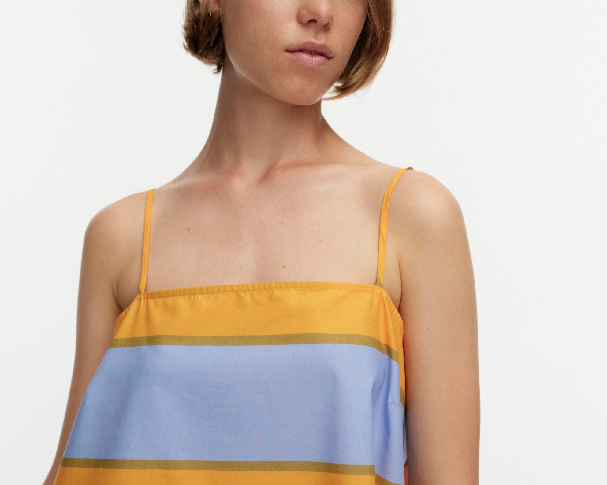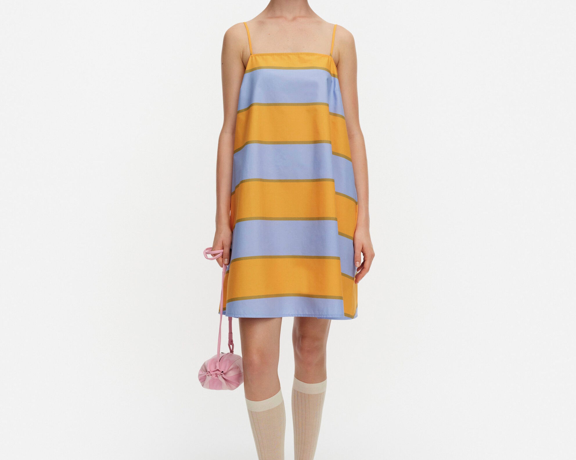The Pelit dress has a slim, A-line fit, and it features the Galleria pattern. The mini dress has short spaghetti straps, a straight neckline, a concealed zipper in the left side seam, and a central back seam. The bust darts give the dress a more fitting shape.