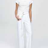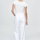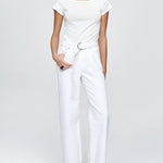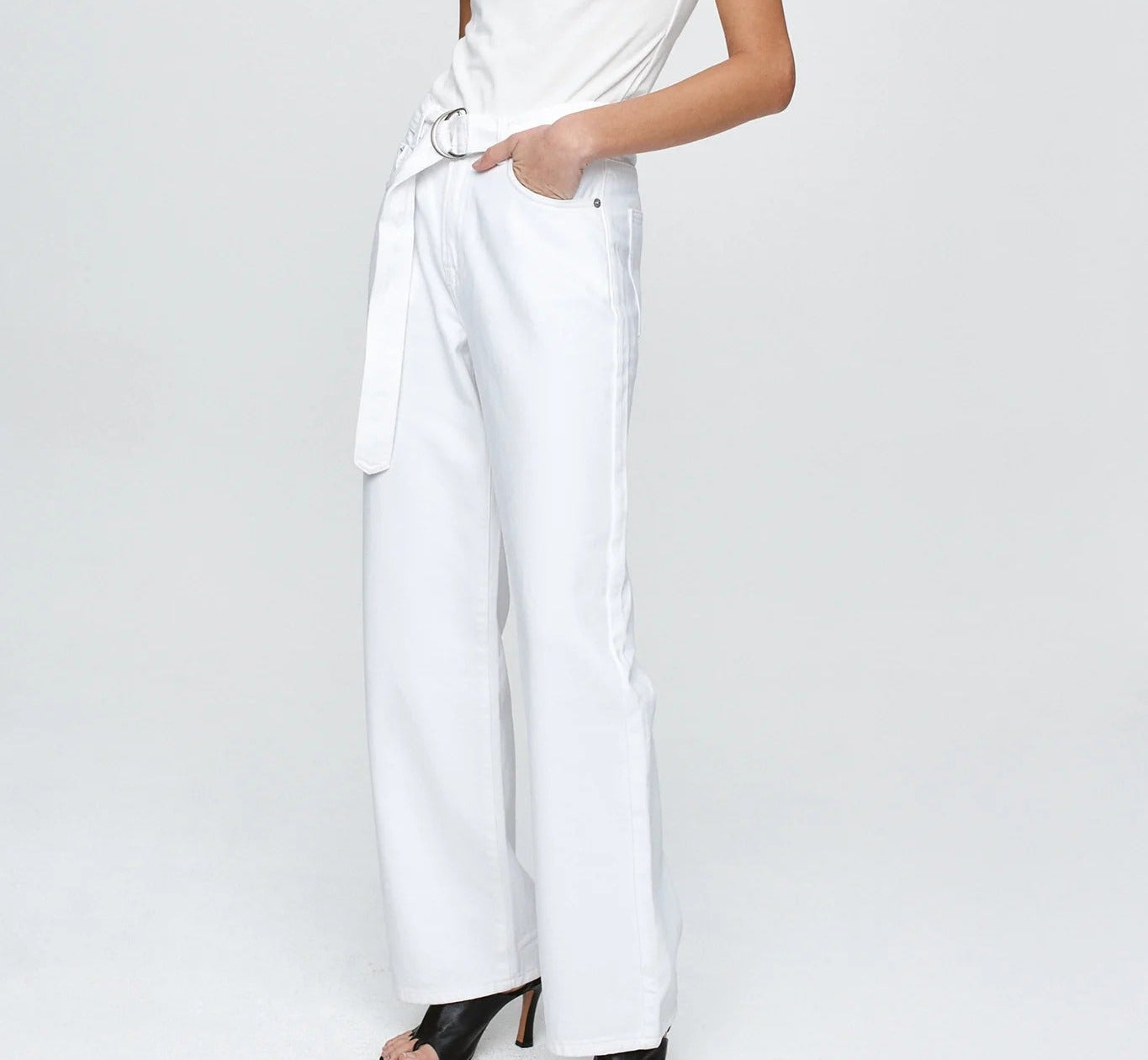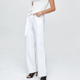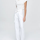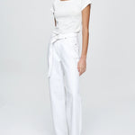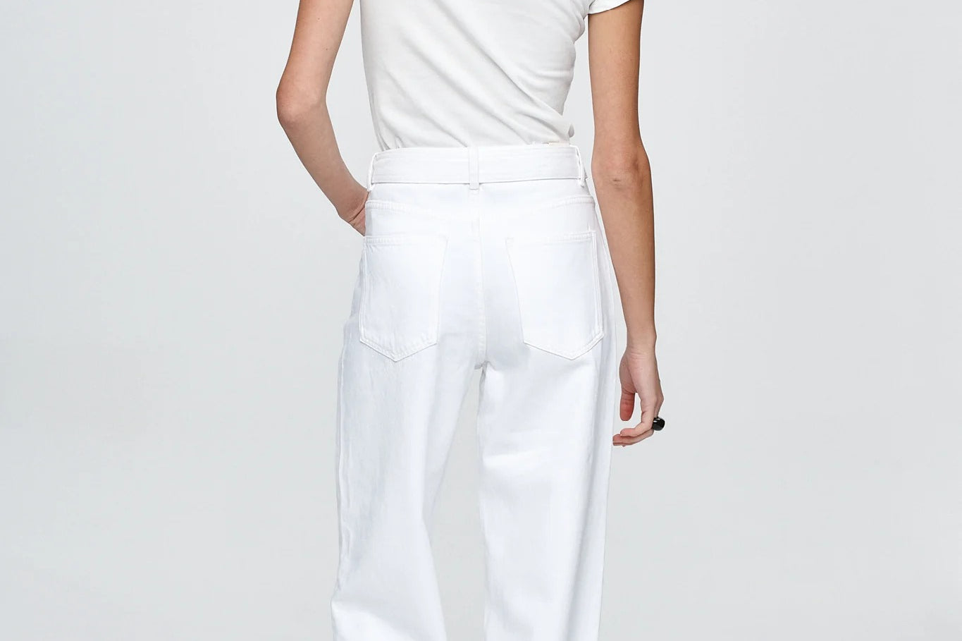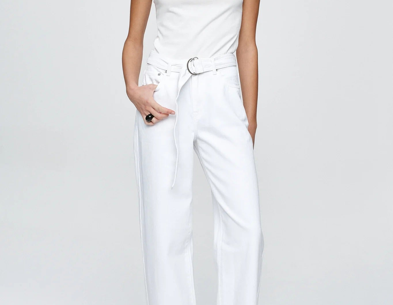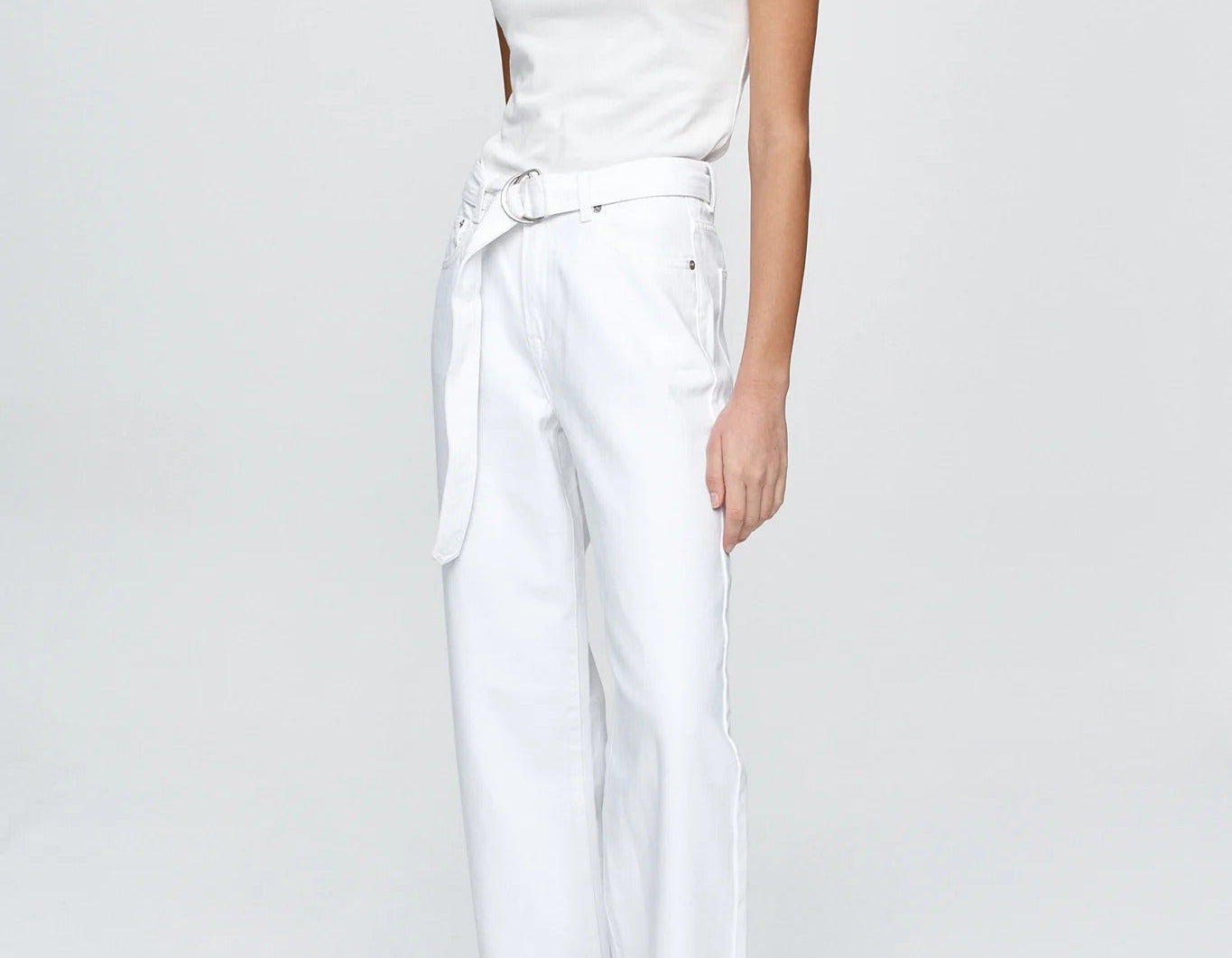 Introducing Marle’s Belted Wide Leg Jean in Blanc, a high-waisted, wide-leg denim jean silhouette in the color white. The belted wide-leg jean features a detachable self-fabric belt with silver D-ring hardware, functional side seam pockets, and back patch pockets.