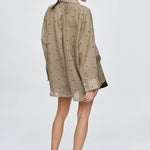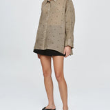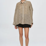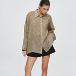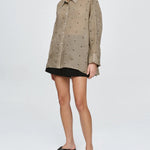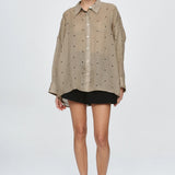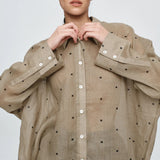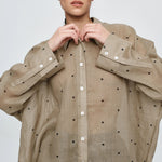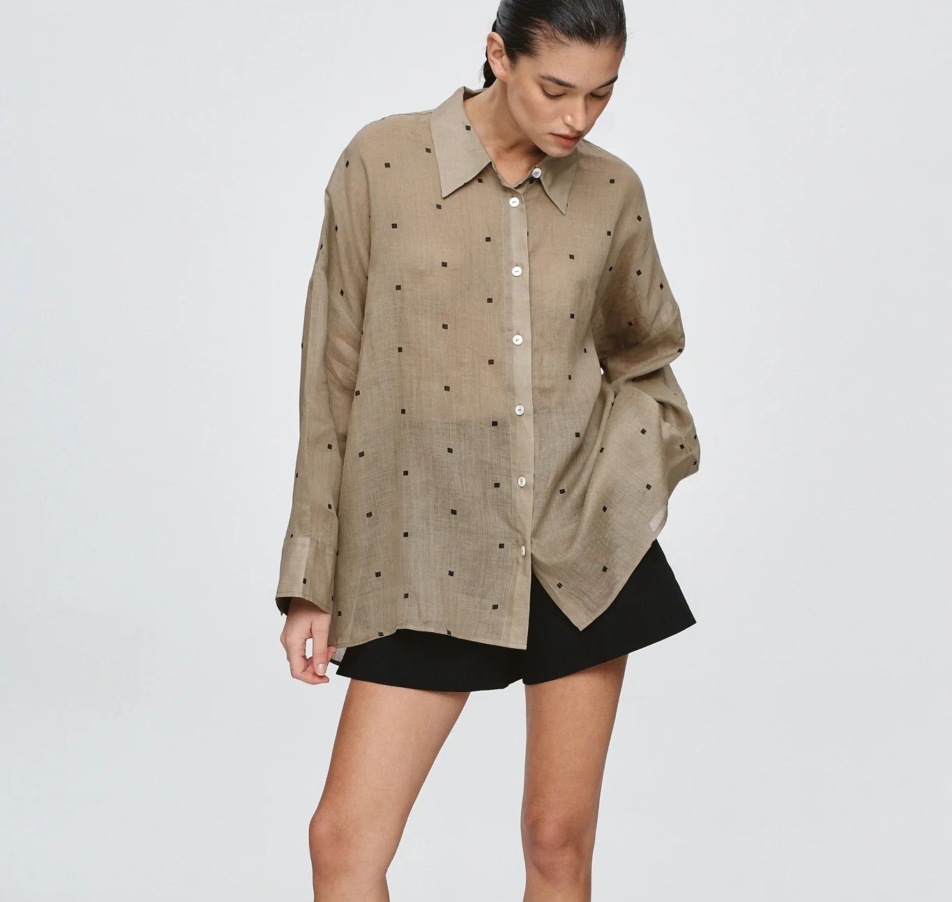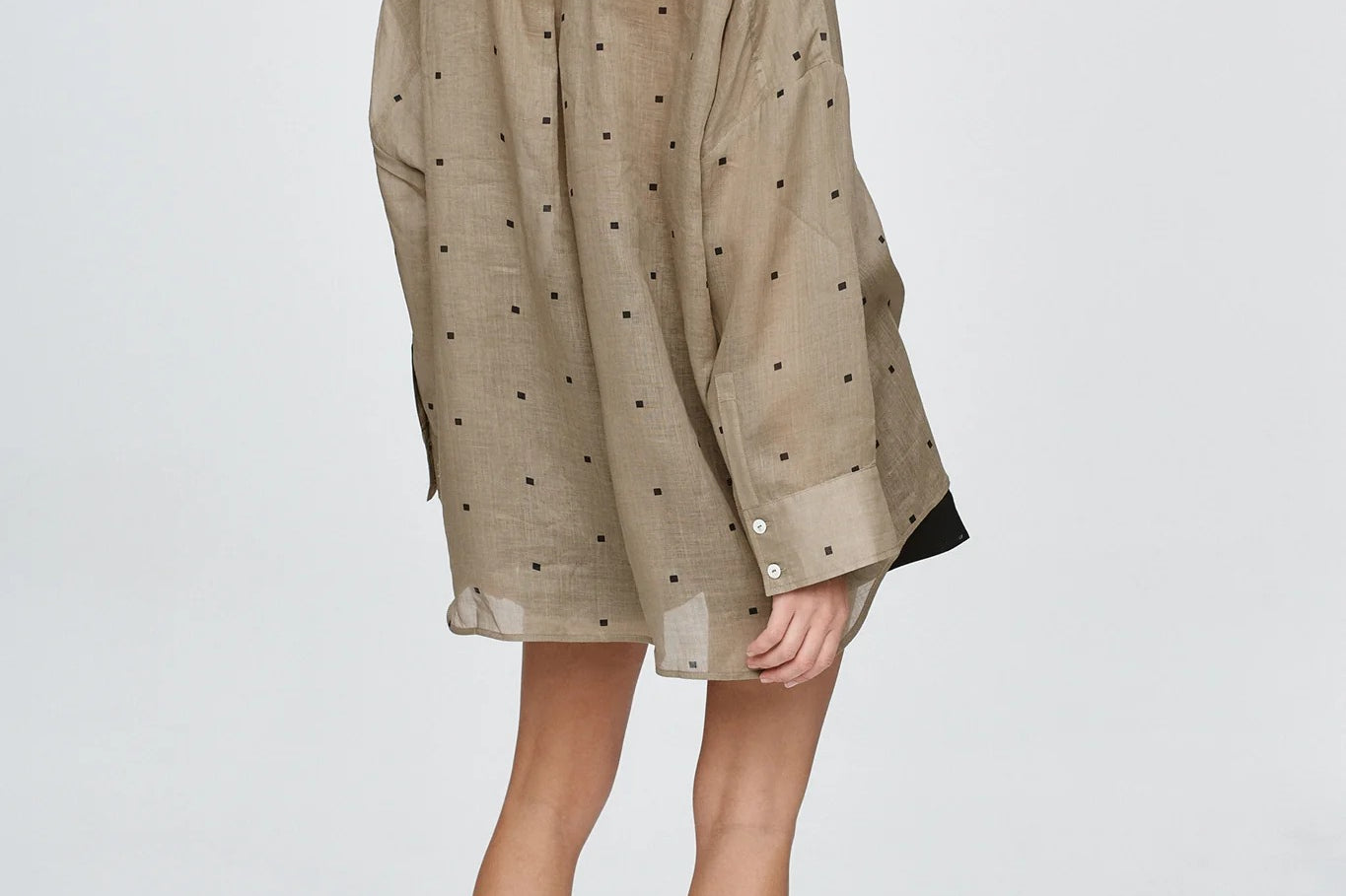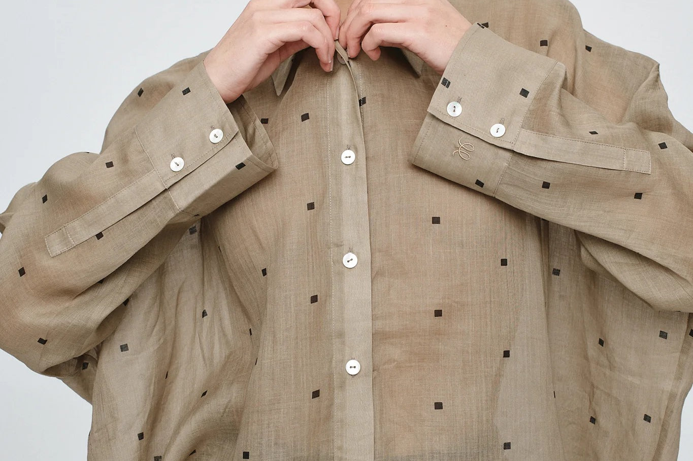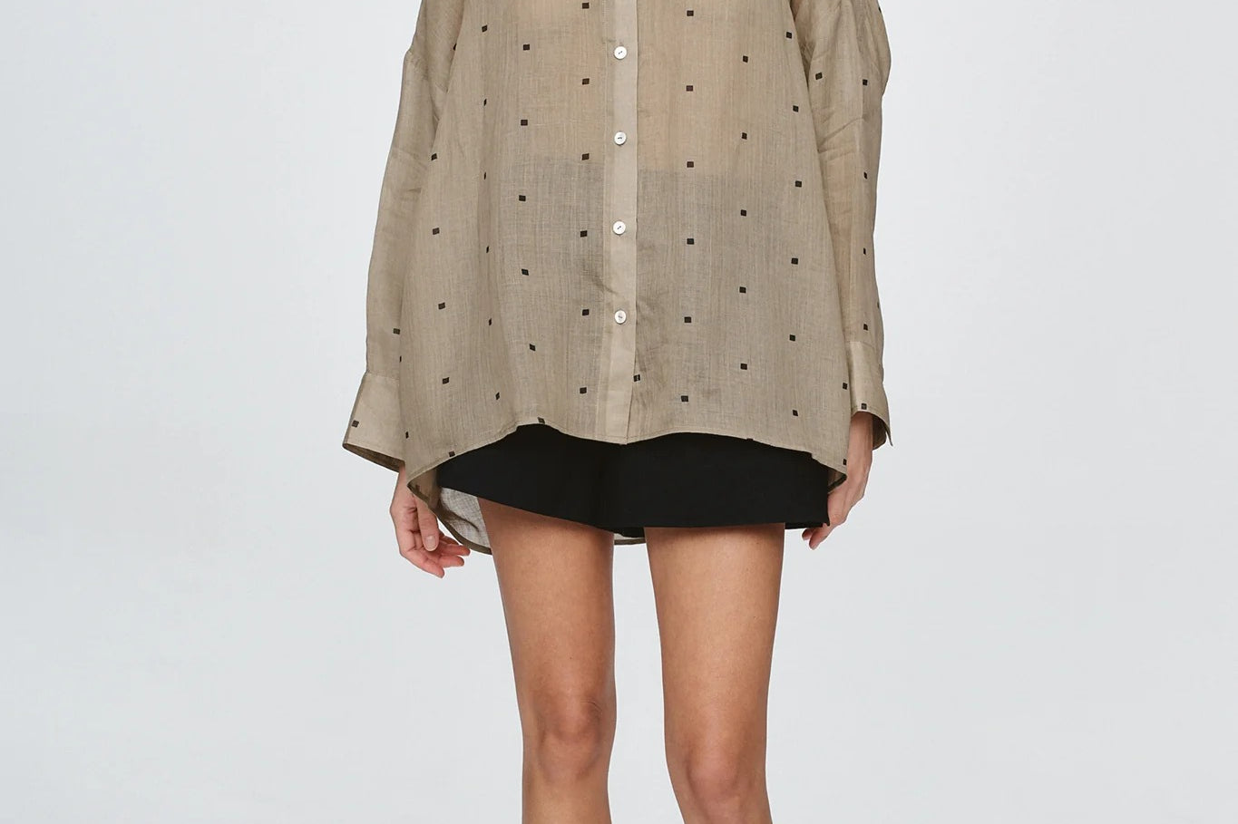 Introducing Marle’s Edie Shirt in Laurel, a semi-sheer, oversized long-sleeve shirt silhouette in a beige canvas hue with a black square dot motif. Crafted from semi-sheer ramie cloth with a classic collar and button-through front with natural shell buttons, it features a relaxed boxy silhouette that falls longer at the back. Wide long sleeves with two-button cuffs complete this effortlessly polished look.