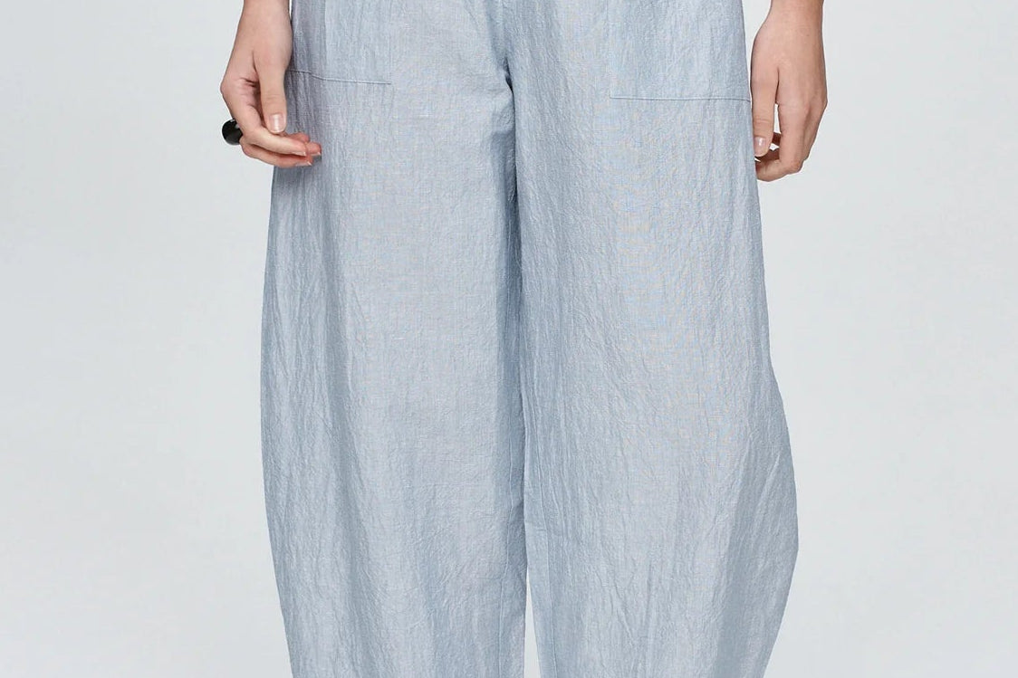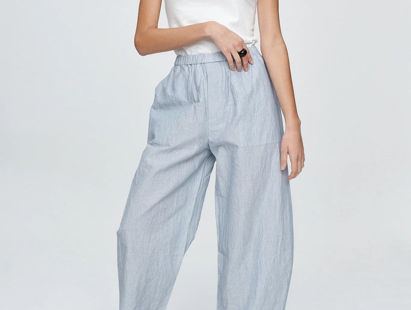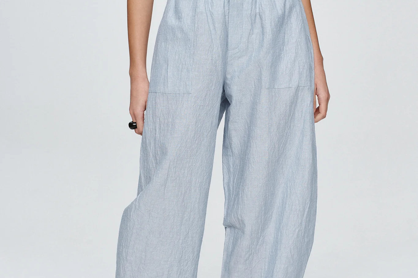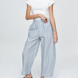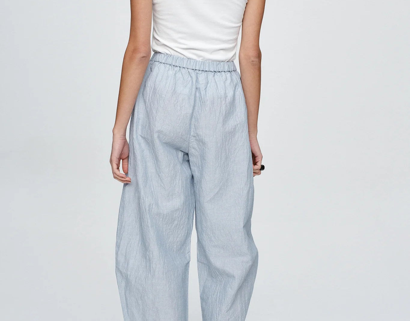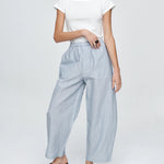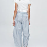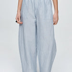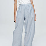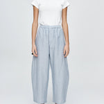 Introducing Marle's Ellidy Pant in Bleu Stripe, a relaxed high-waisted barrel-leg silhouette in blue stripe. Designed with an elasticated waistband, the Ellidy Pant is a high-waisted pant featuring patch pockets with bar tack detailing and tonal topstitching for a subtle utilitarian touch. The lightweight fabric gives natural structure, making it a timeless staple for casual days or elevated weekend dressing.