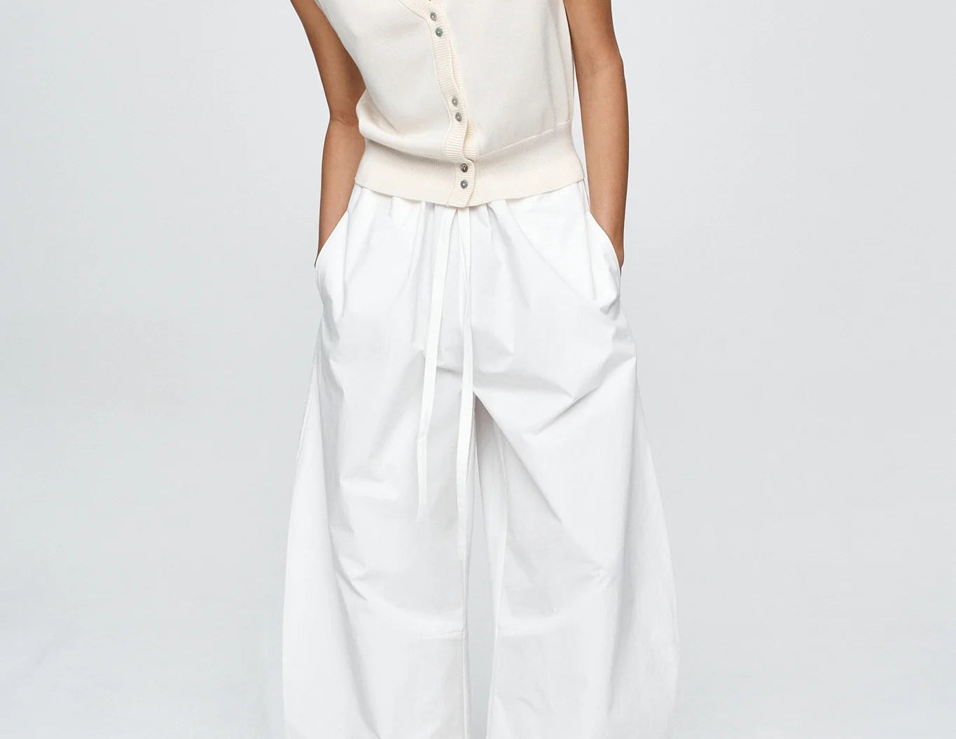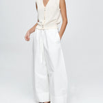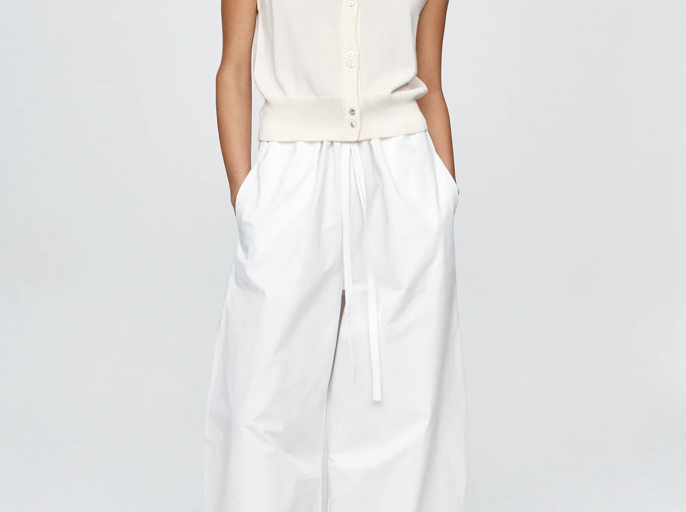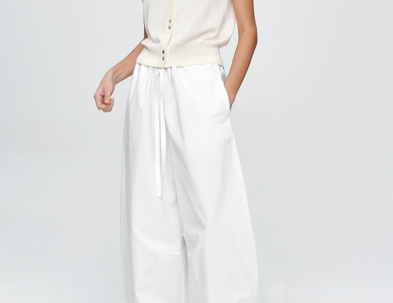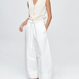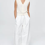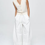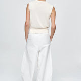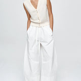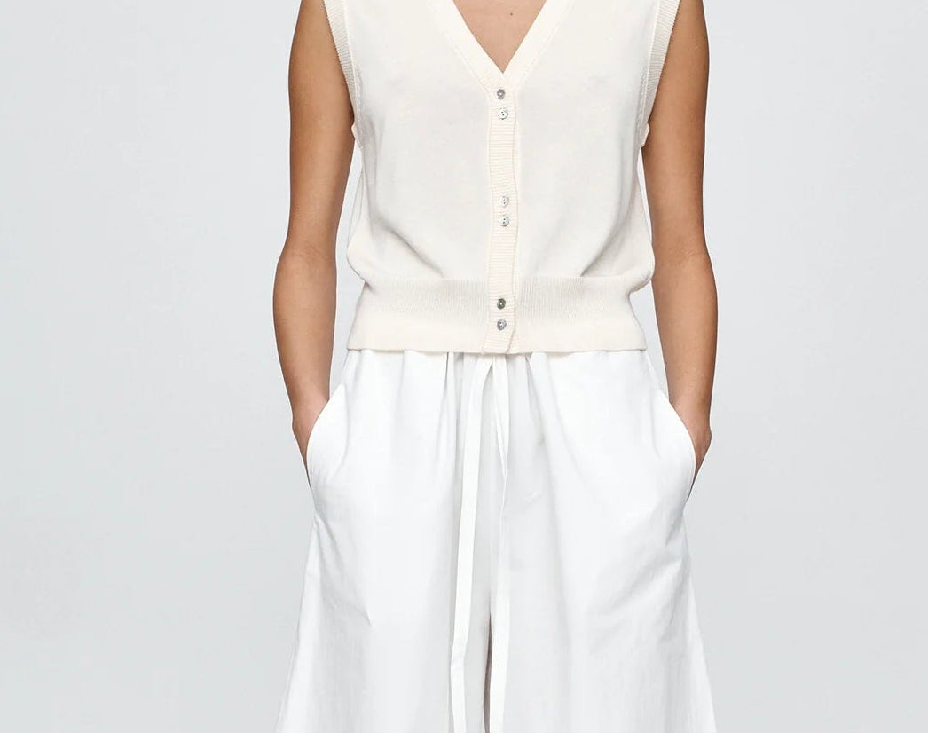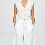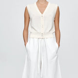 Introducing Marle’s Foundations Vest in Ivory, a sleeveless knit vest silhouette in a cream-ivory color. Designed with a deep V-neckline and front button closure, the Foundation sleeveless vest features contrast shell buttons and a wide ribbed hem for a structured yet refined finish.