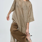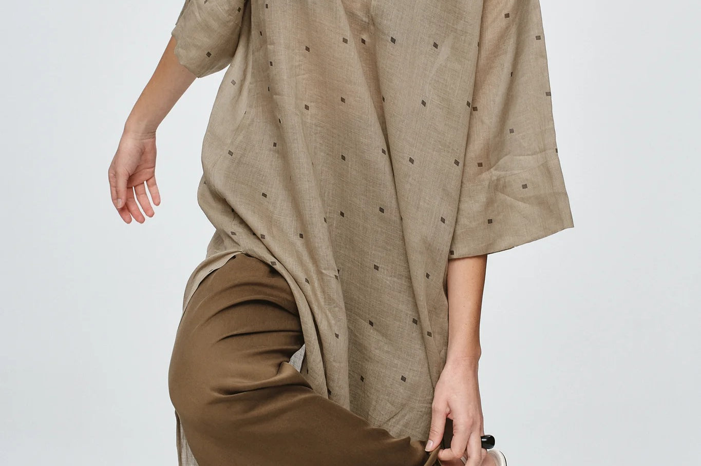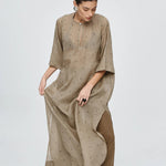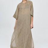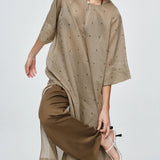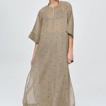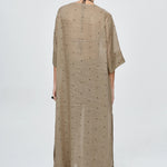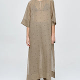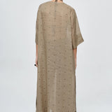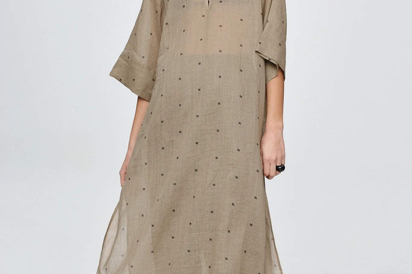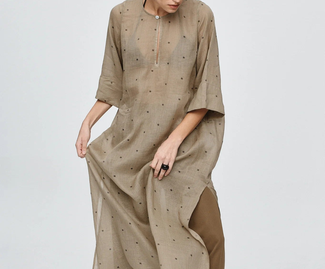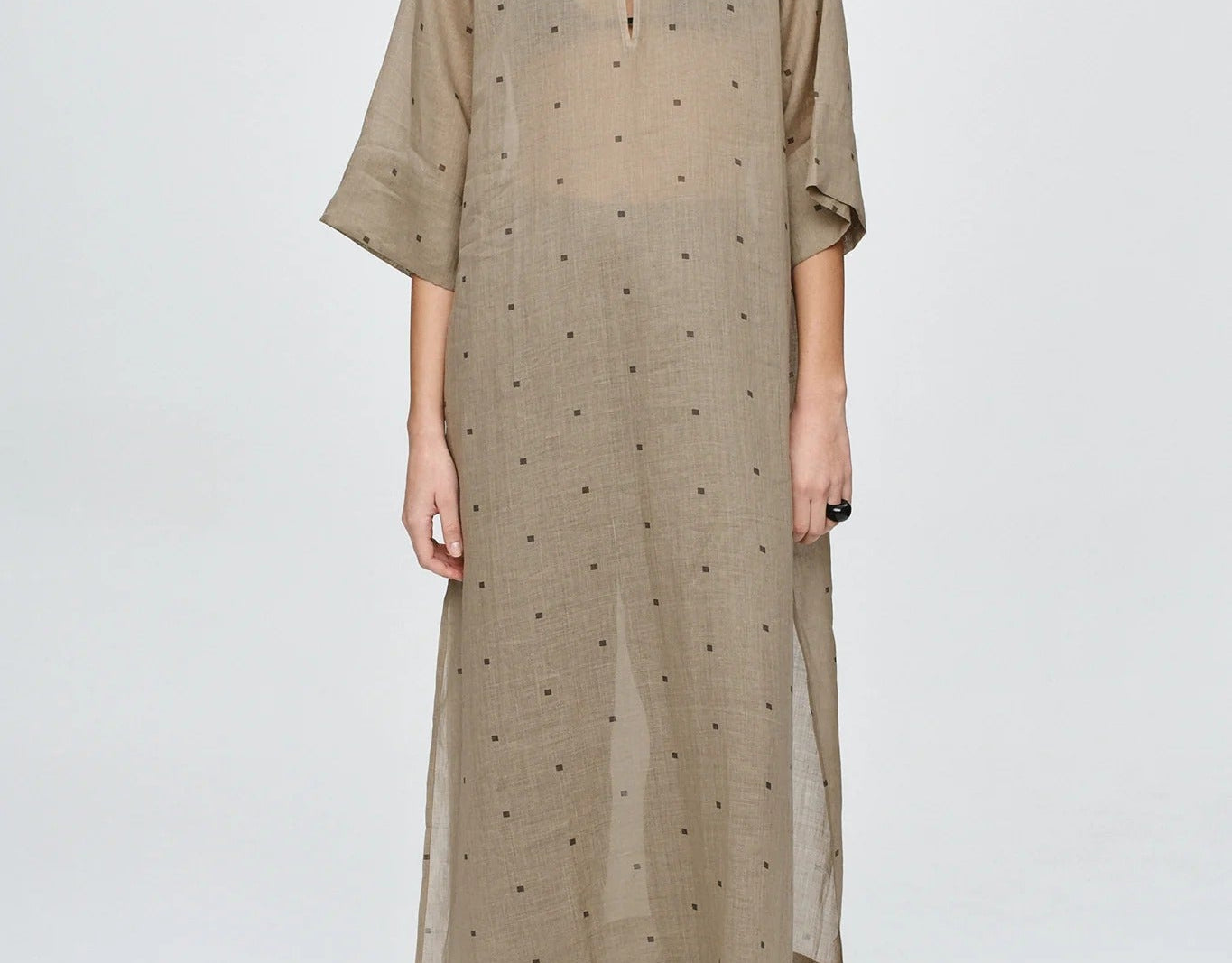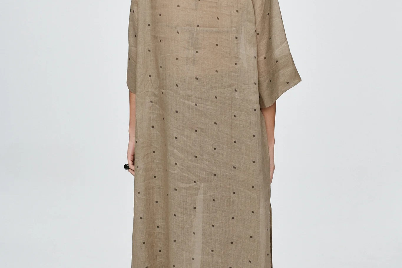 Introducing Marle’s Kaftan in Laurel, a semi-sheer maxi-length kaftan silhouette in a beige canvas with a black square dot motif. Designed with a clean, round neckline and a discreet front neck slit secured by a single button. A panelled hemline adds subtle weight and shape with side seam slits to create movement and soft volume. Unlined for a light, breathable feel, it is intended to layer over swimwear or fine base garments.
