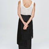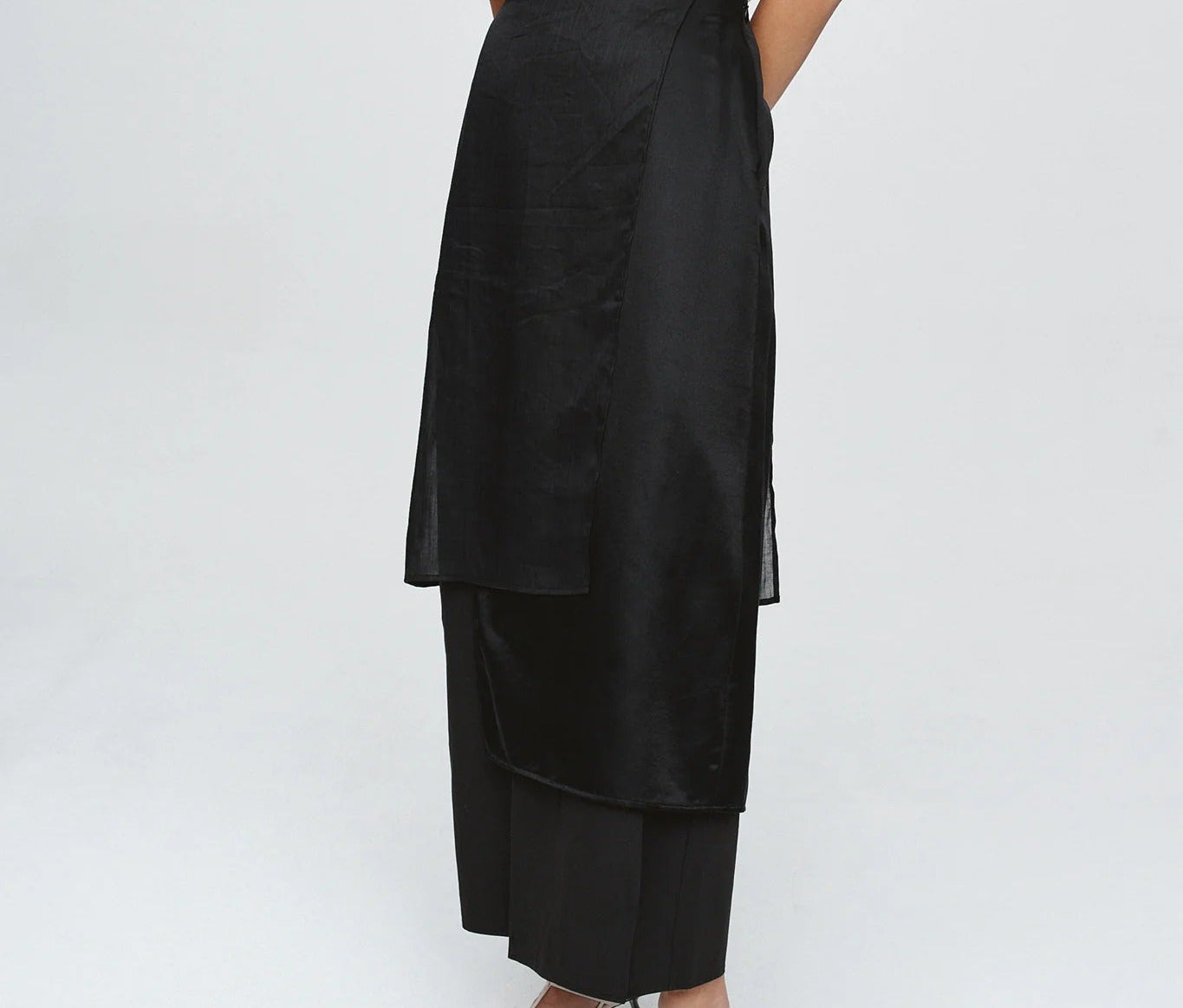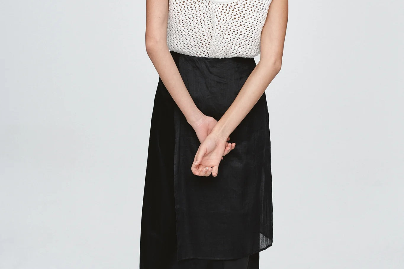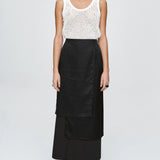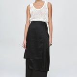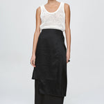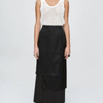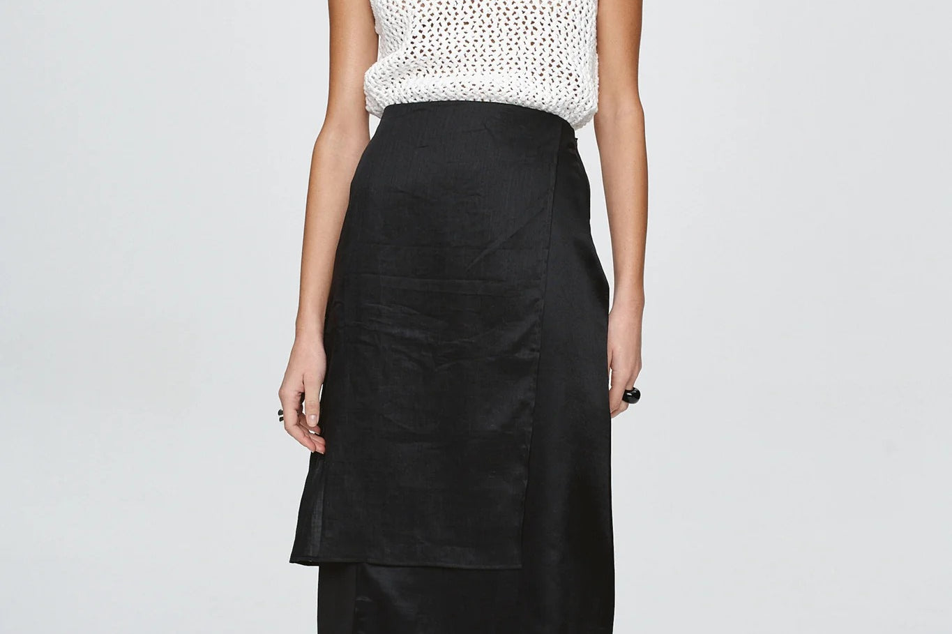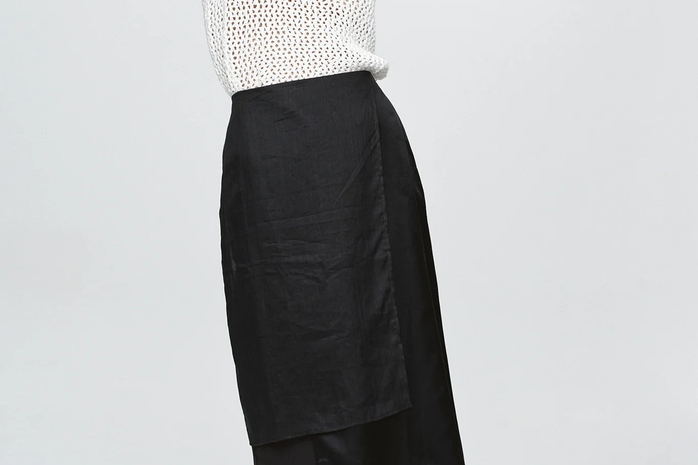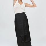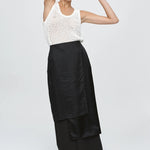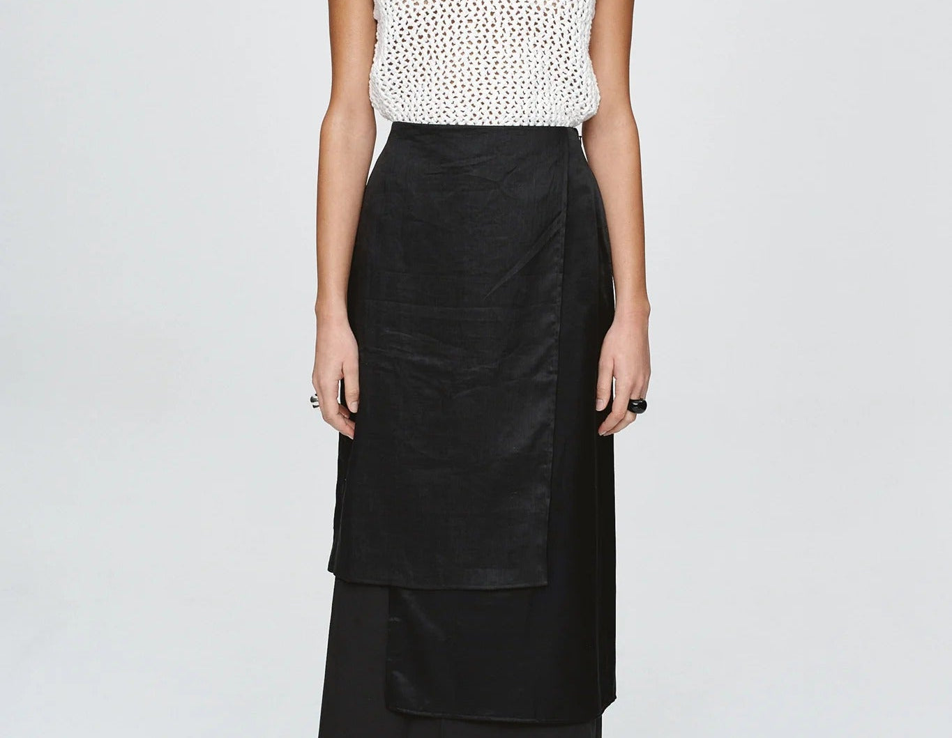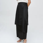 Introducing Marle’s Onda Skirt in Black, a wrap-style maxi skirt in black. Designed with overlapping panels creating a subtle tiered effect that drapes softly over the body, it creates movement and depth while maintaining a clean silhouette. Effortlessly refined, this maxi skirt embodies Marle’s signature balance of structure and ease.