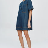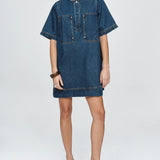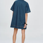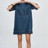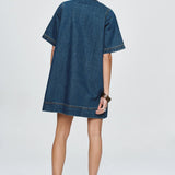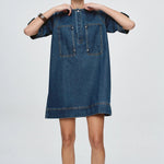 Introducing Marle's Patch Pocket Dress in Classic Blue, a relaxed, boxy short-sleeve dress silhouette in indigo blue. Crafted from 100% organic cotton with a relaxed, boxy shape. Features a round neckline and a concealed half placket secured with snap dome closures. Features include two oversized chest patch pockets with metal rivet reinforcement. Finished with topstitching and exaggerated hem detailing for a utility-inspired finish.