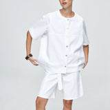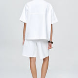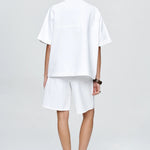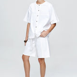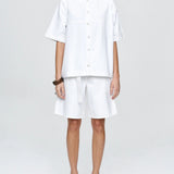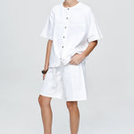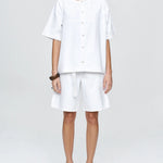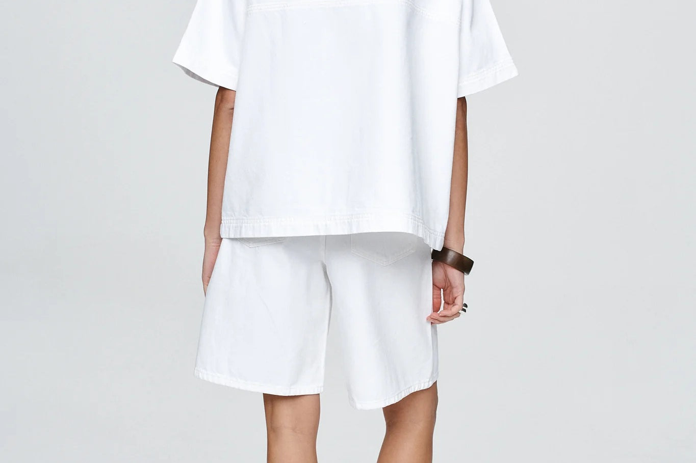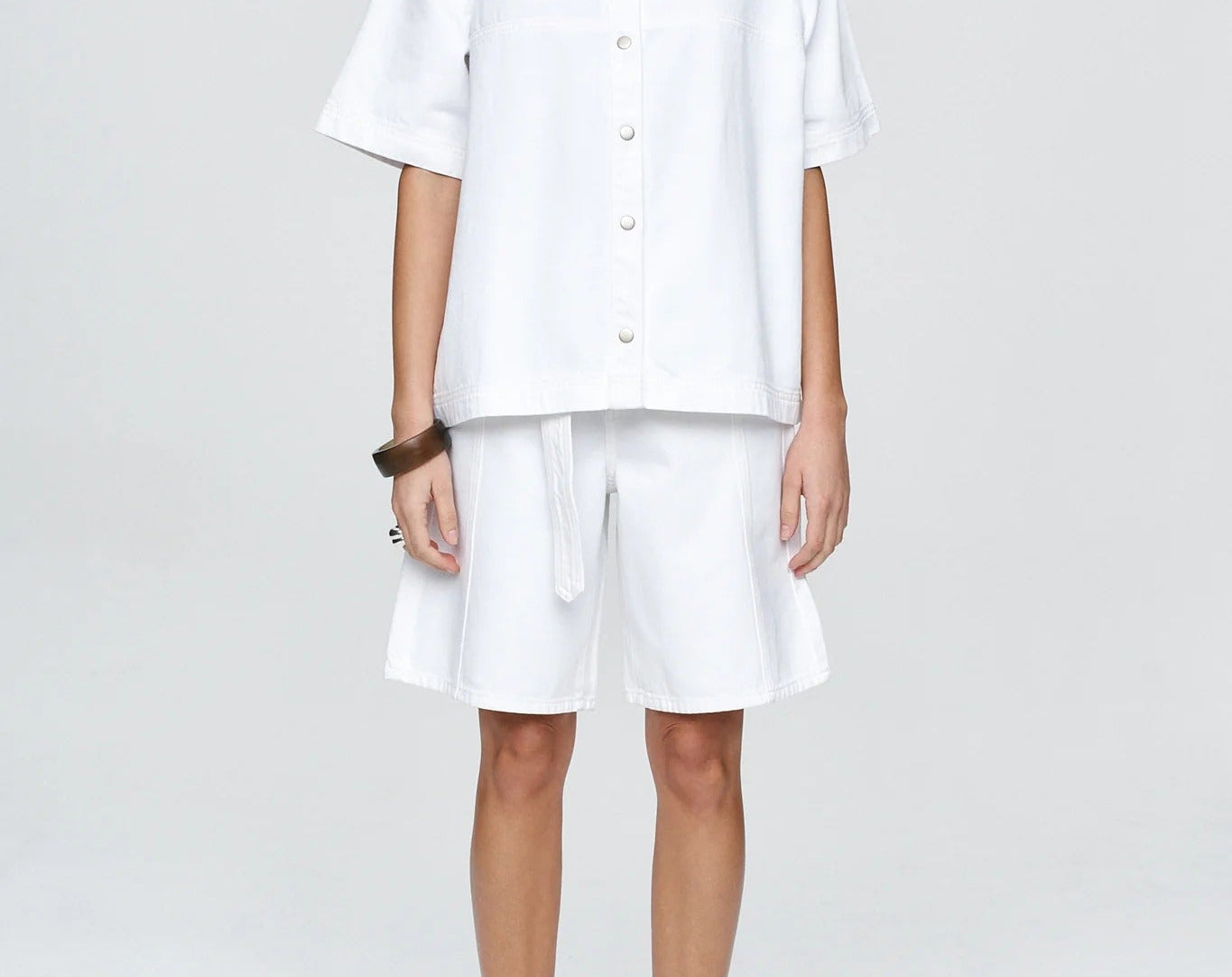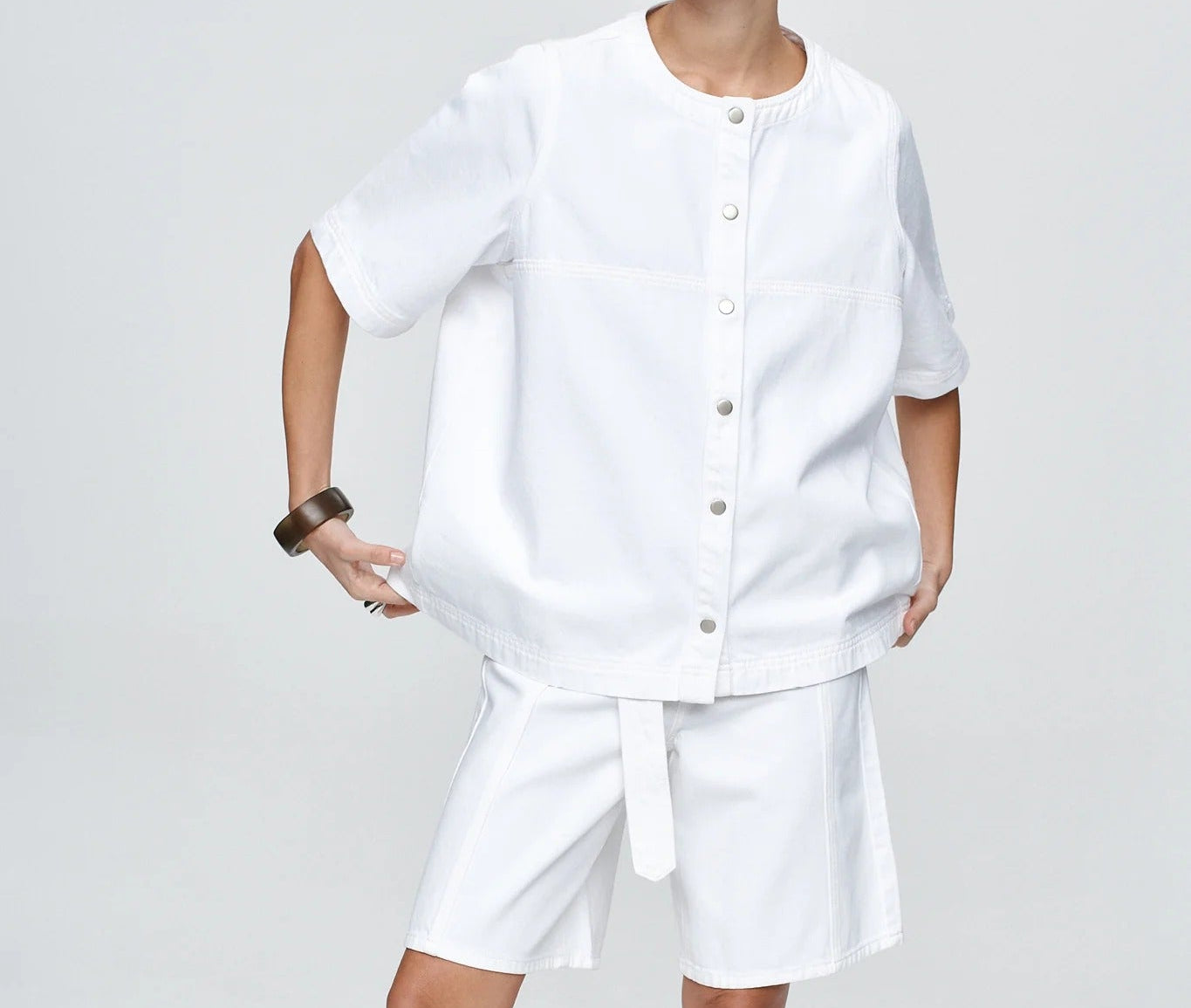 Introducing Marle’s Short Sleeve Seam Shirt in Blanc, a relaxed boxy shirt in the color white. Designed with a clean, collarless round neckline and front placket secured with metal snap dome fastenings. Finished with exposed panel seams and reinforced topstitching throughout. This versatile piece works as a stand-alone top or layered for effortless styling.
