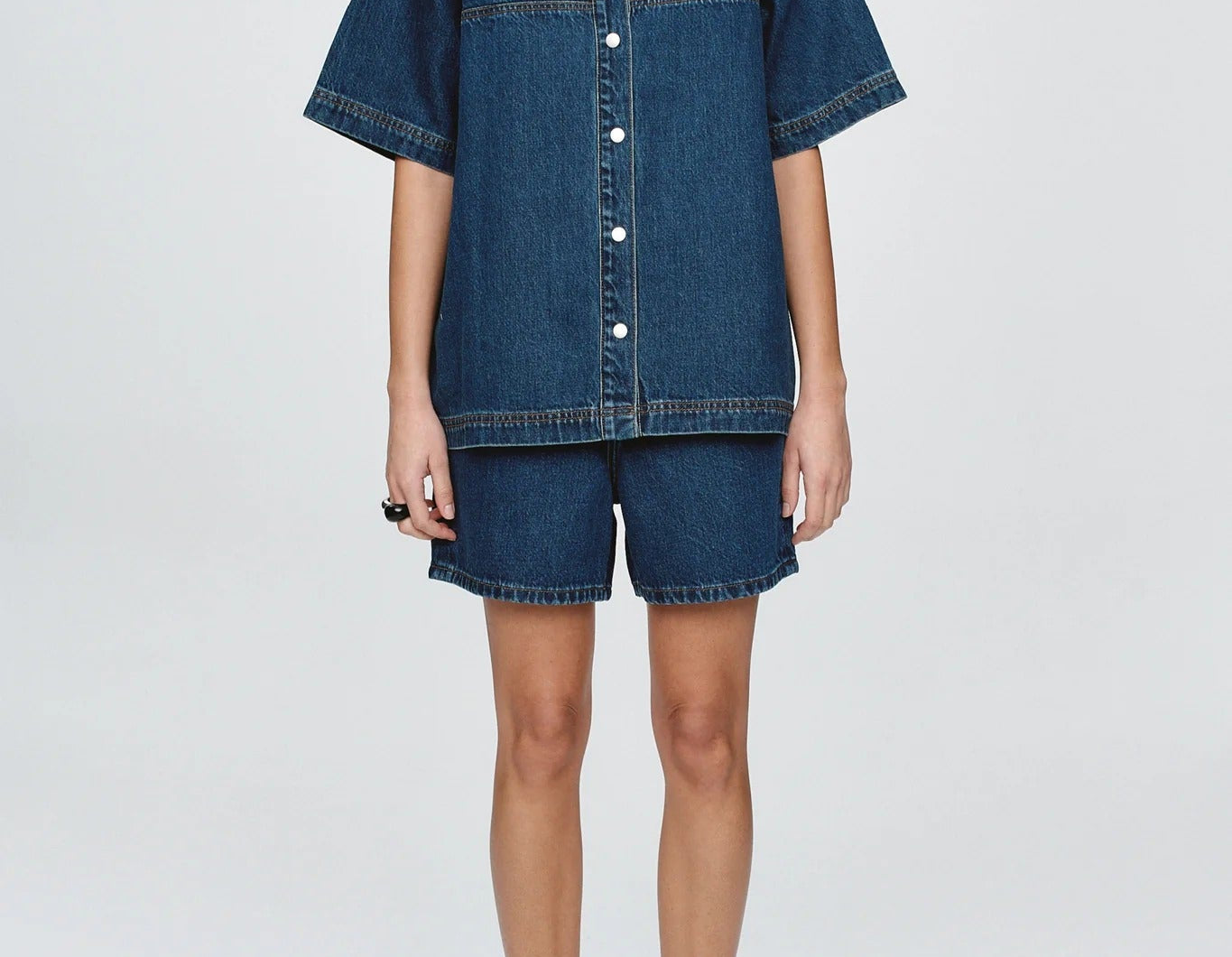 Introducing Marle’s Short Sleeve Seam Shirt in Blanc, a relaxed boxy shirt in the color white. Designed with a clean, collarless round neckline and front placket secured with metal snap dome fastenings. Finished with exposed panel seams and reinforced topstitching throughout. This versatile piece works as a stand-alone top or layered for effortless styling.