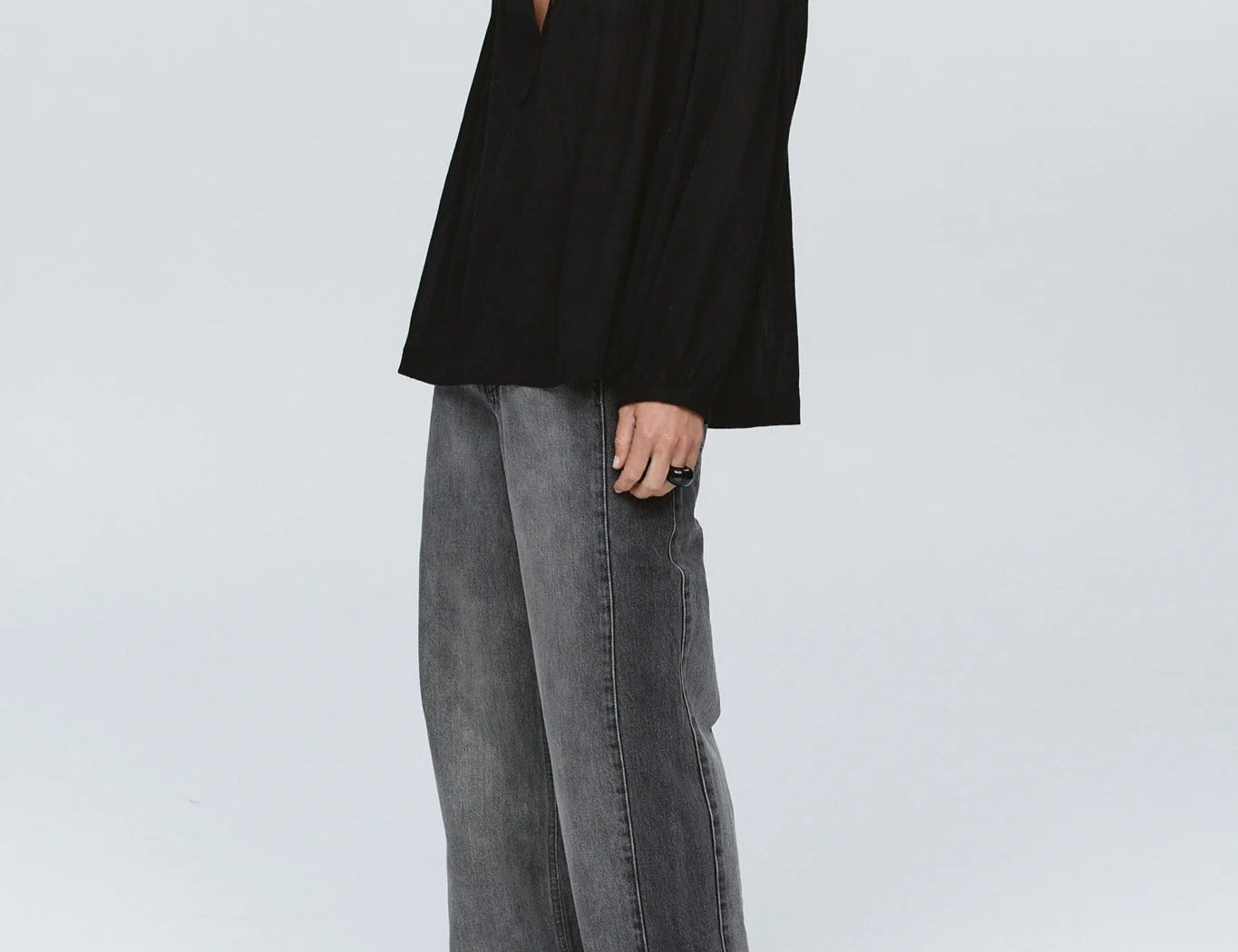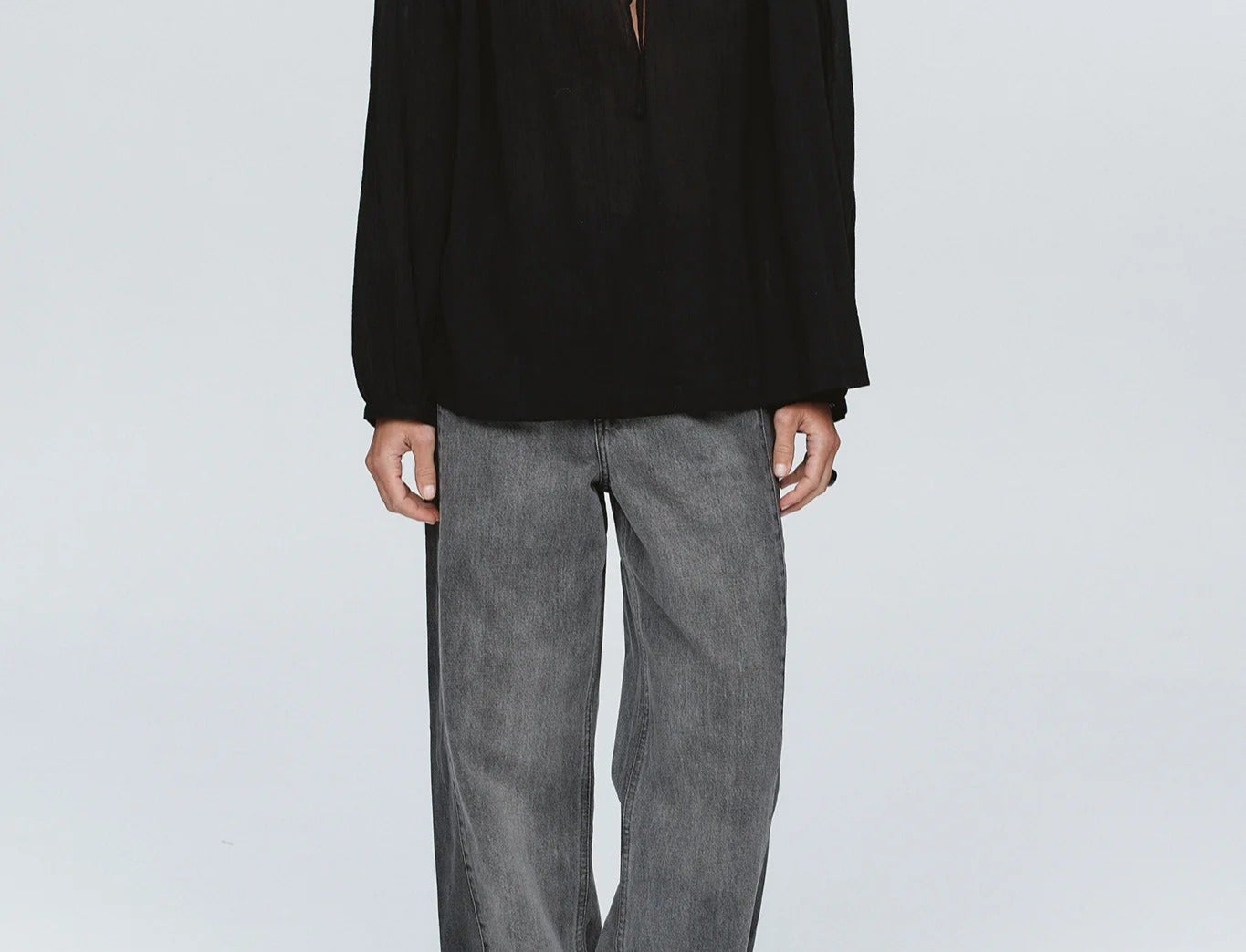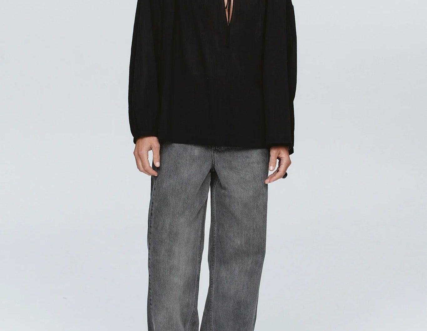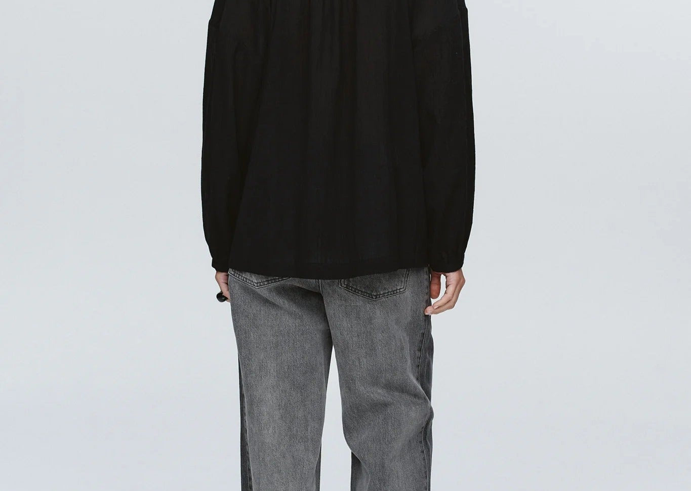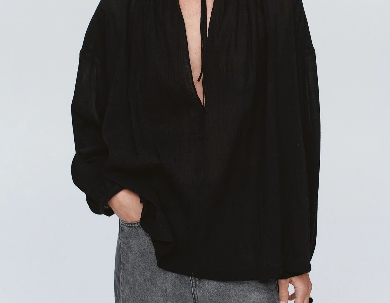 Introducing Marle's Valerie Top in Black, a relaxed long-sleeve blouse top constructed from lightweight 100% cotton. Features a center front seam with a deep V-neckline and functional tie closure. Gathering around the front and back neckline to create volume. Dropped shoulder seams and full-length sleeves finished with clean hems. The fabric's soft drape and breathable quality make it suitable for warm-weather wear.