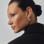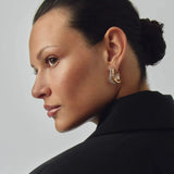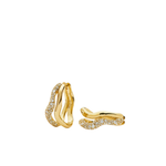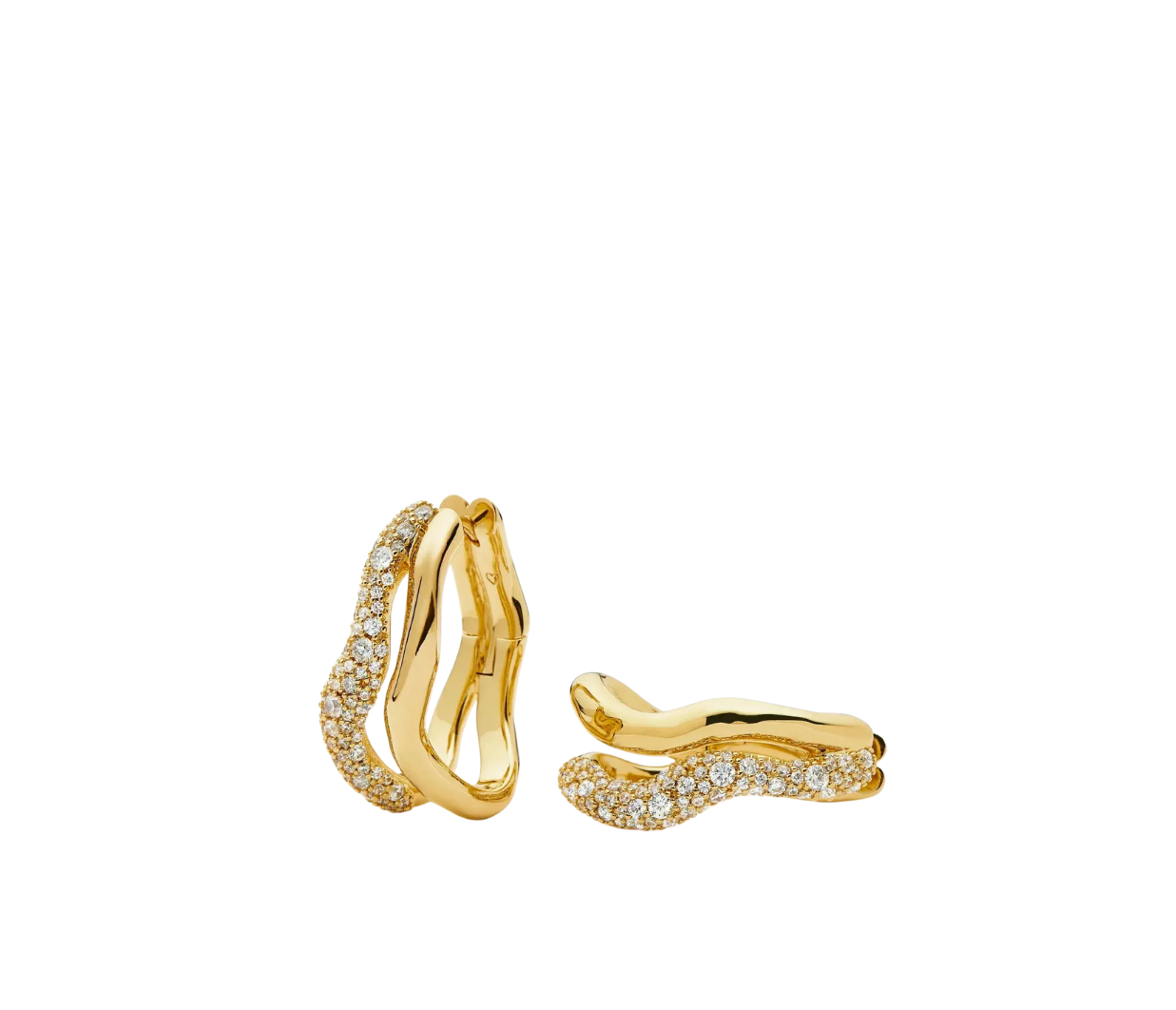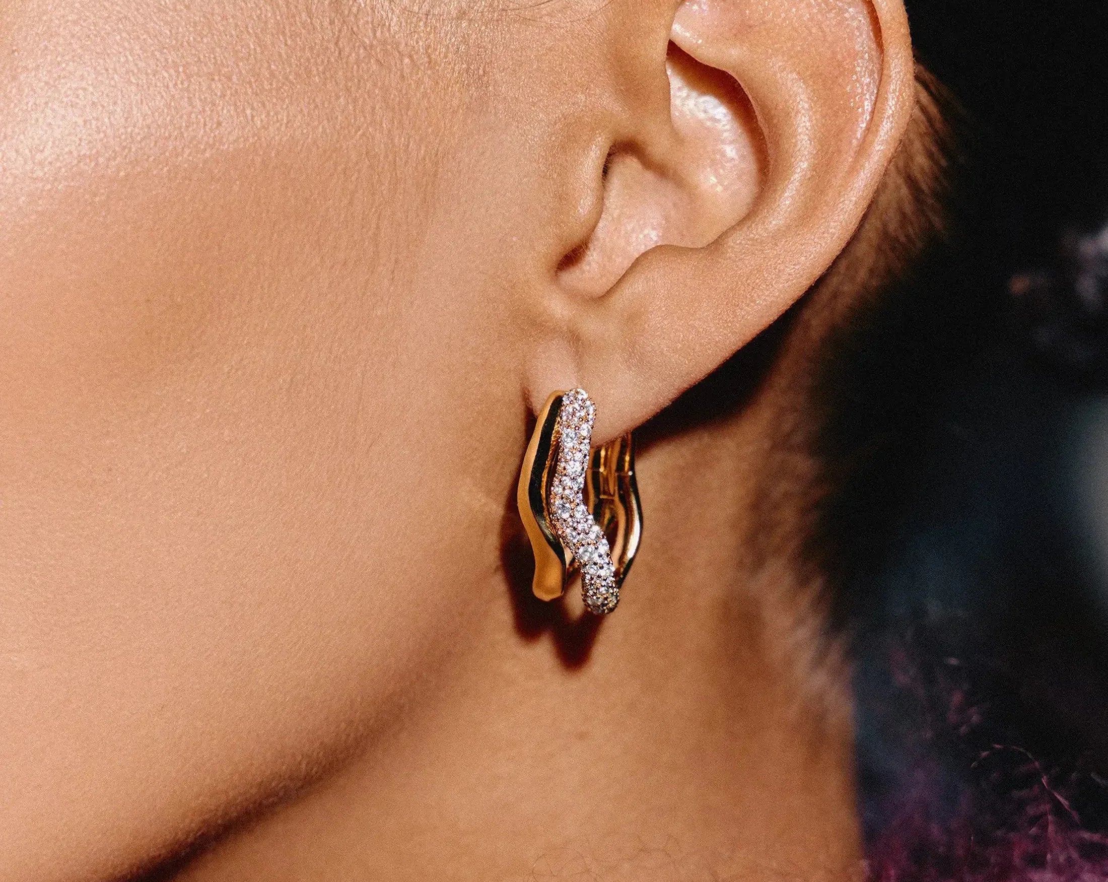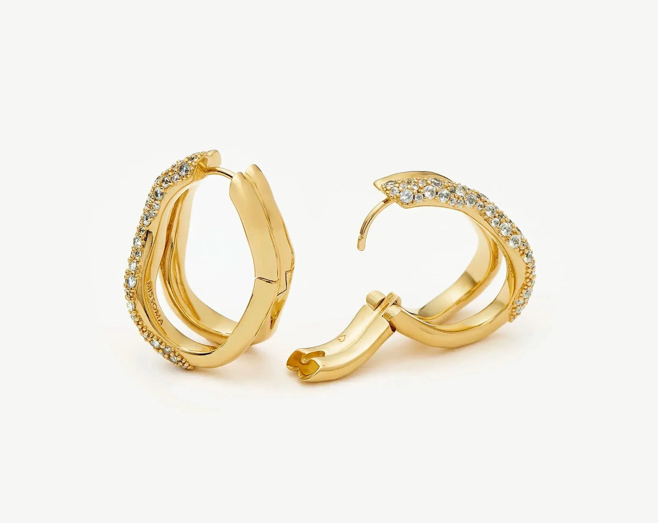 Introducing Missoma's Molten Snow Double Medium Hoop Earrings, a pair of gold molten hoop earrings. Designed in a sculptural curved silhouette, where one side features a smooth, sculptural finish while the other features a subtle shimmer with a frosting of snow pavé to mimic ice crystals. Wear solo or stack with your favorite hoops and studs for party season styling.
