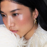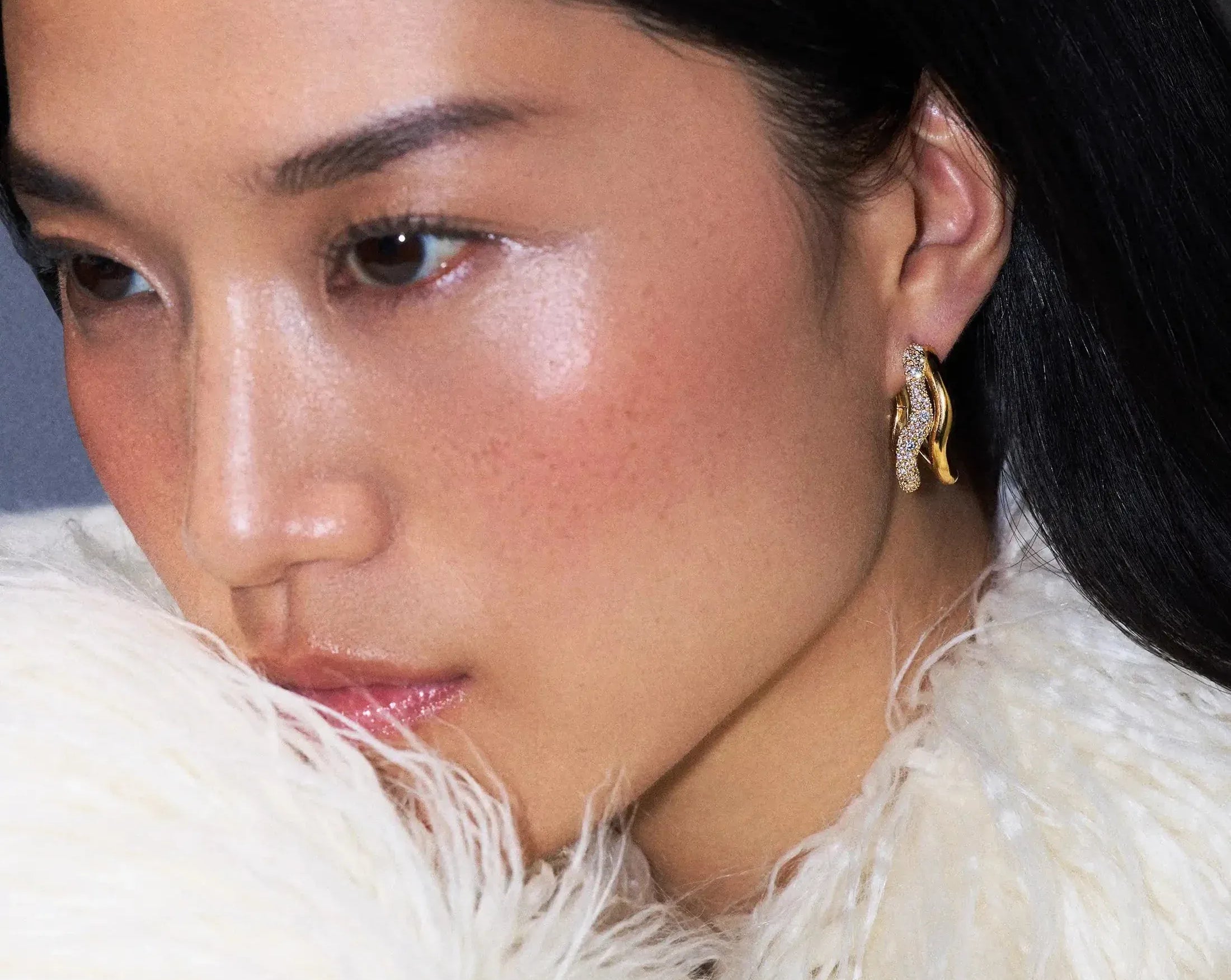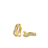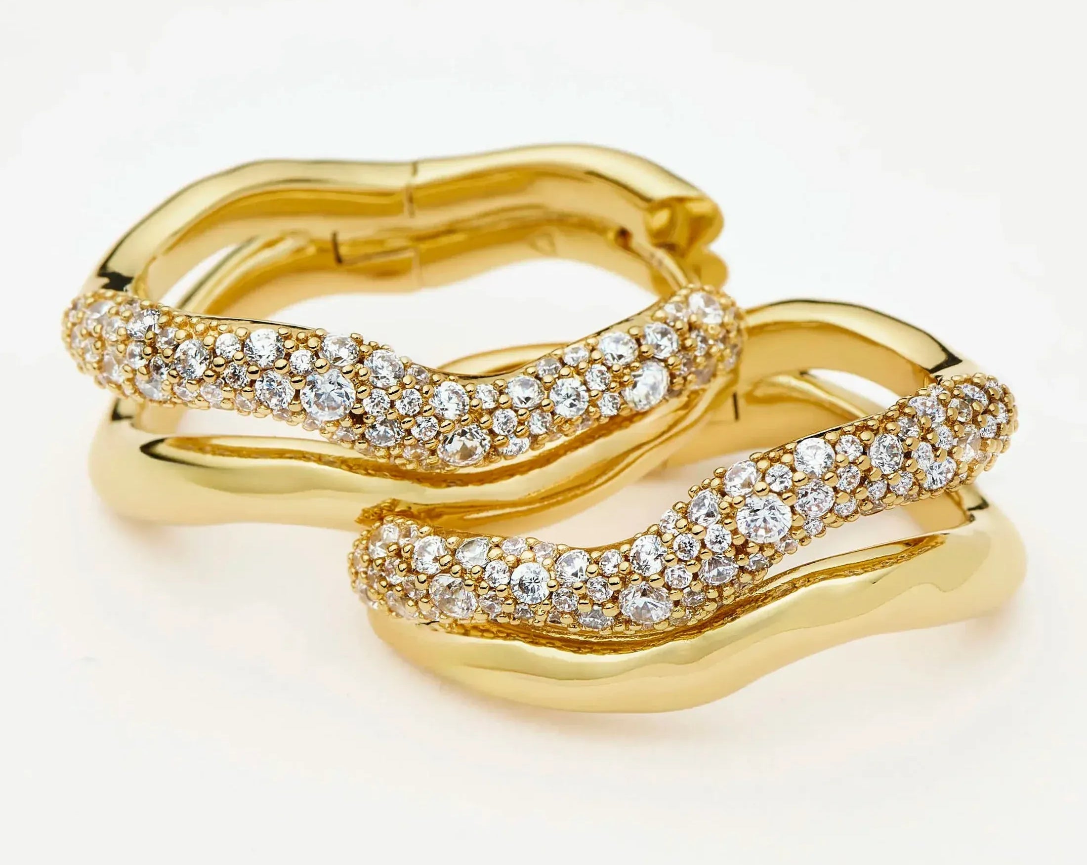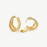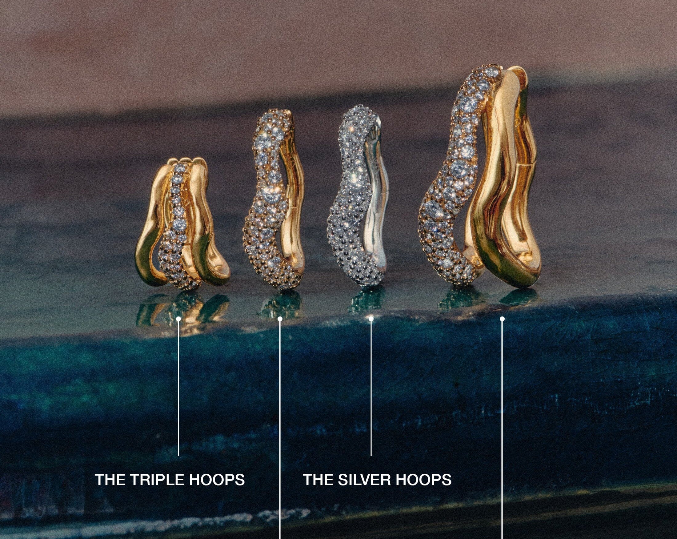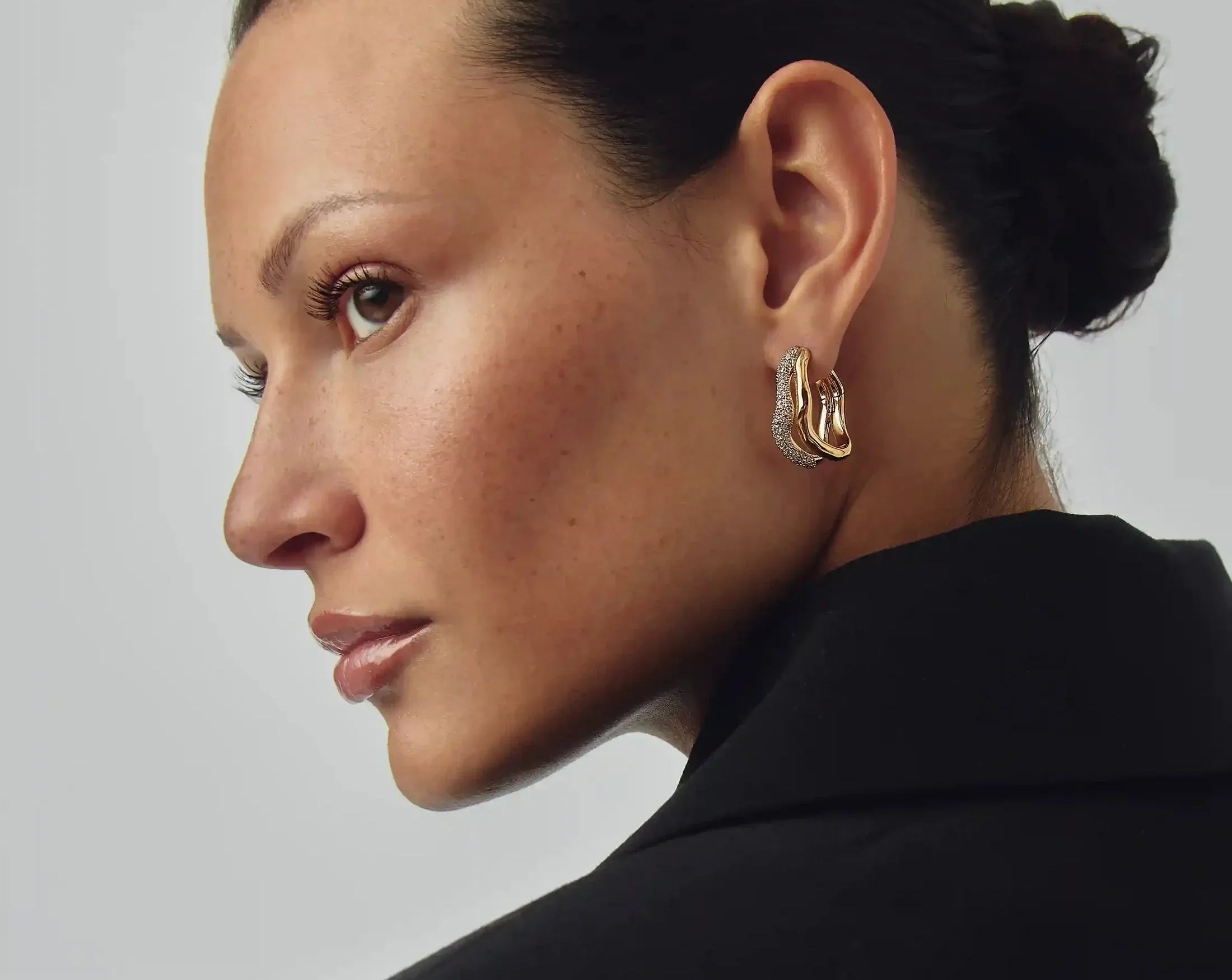 Introducing Missoma's Molten Snow Double Medium Hoop Earrings, a pair of gold molten hoop earrings. Designed in a sculptural curved silhouette, where one side features a smooth, sculptural finish while the other features a subtle shimmer with a frosting of snow pavé to mimic ice crystals. Wear solo or stack with your favorite hoops and studs for party season styling.