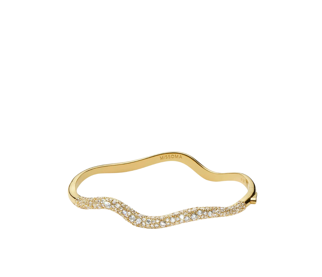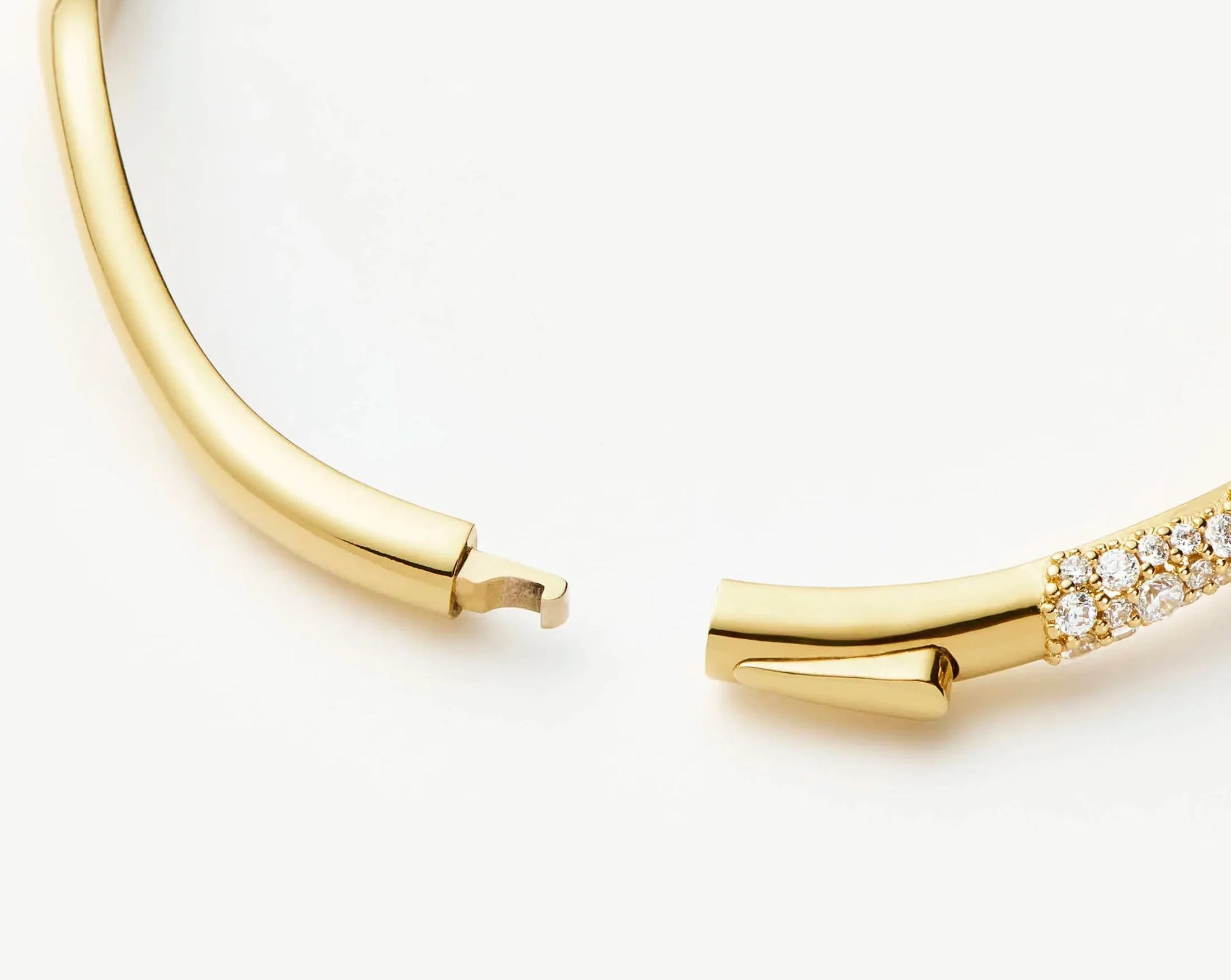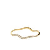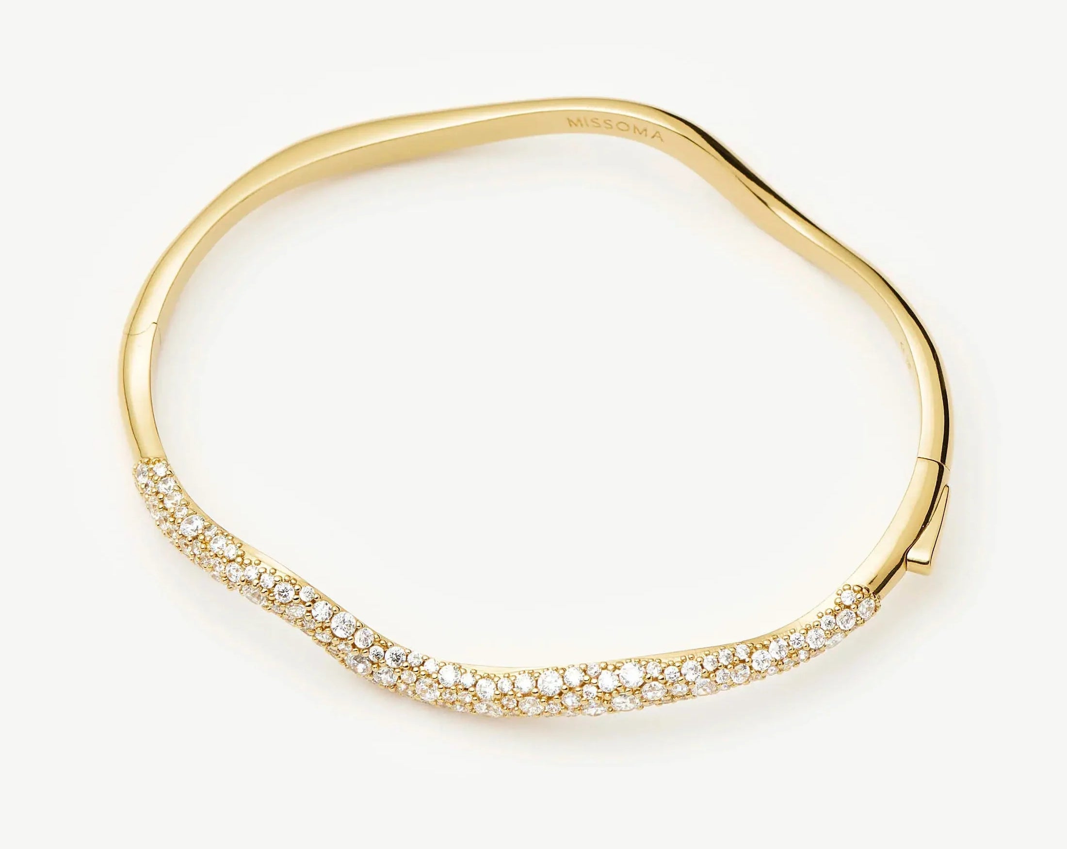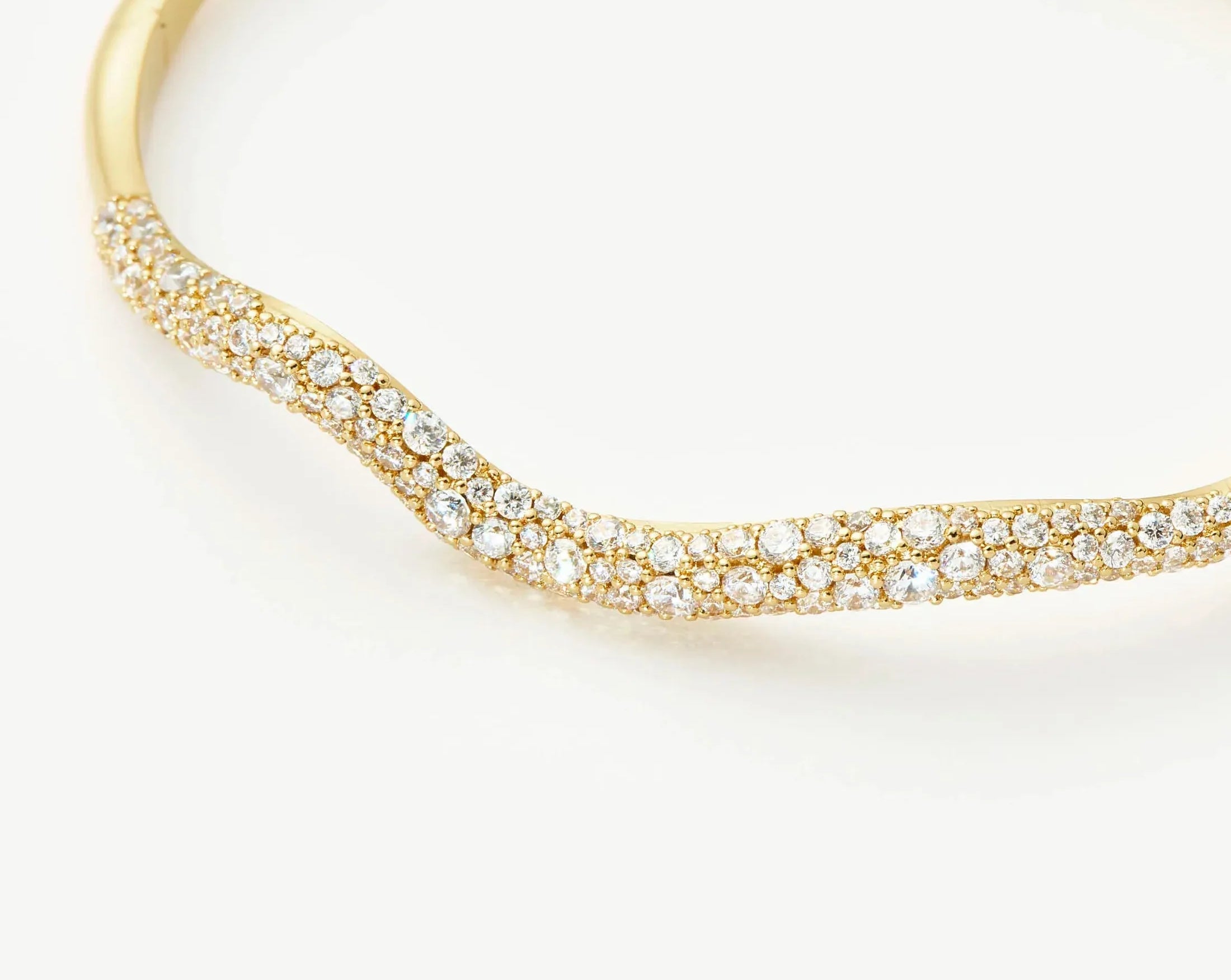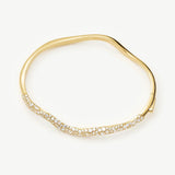 Introducing Missoma's Molten Snow Ripple Hinged Bangle, a molten gold bangle bracelet. Designed with soft organic curves, giving a sculptural molten gold texture with a frosting snow pave mimic of ice crystals, finished with a hinged detail. Perfect piece to elevate your everyday bracelet stack.