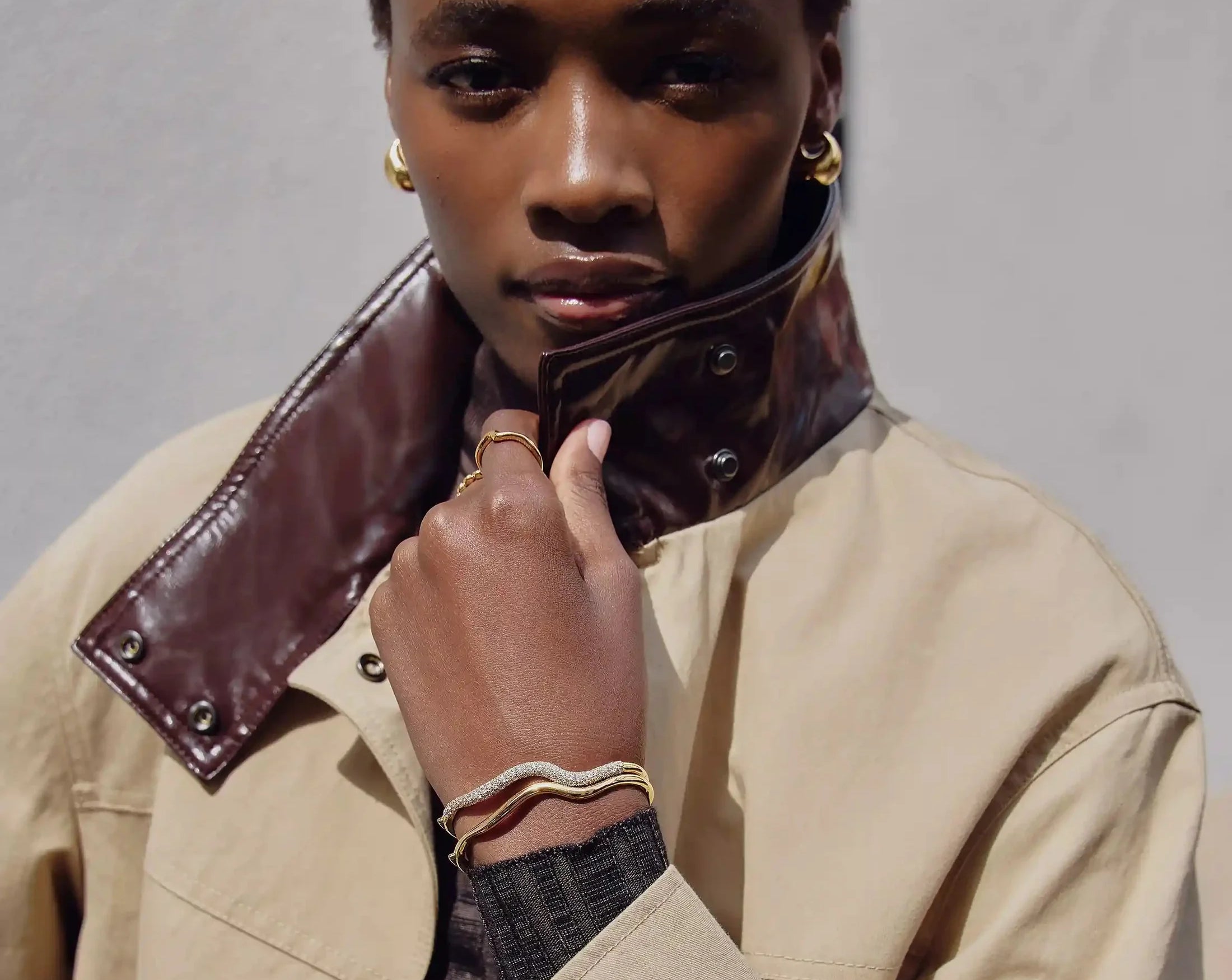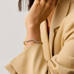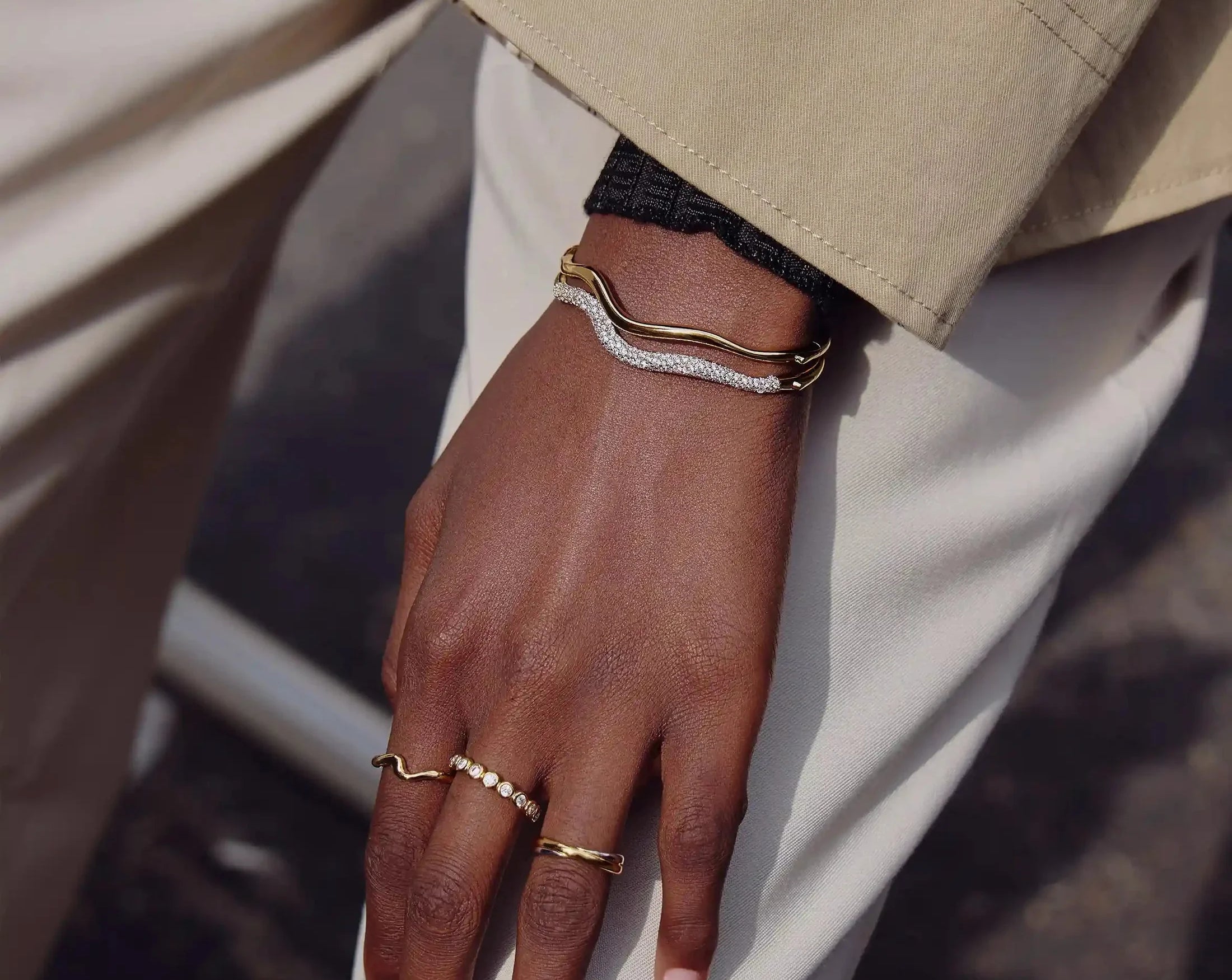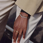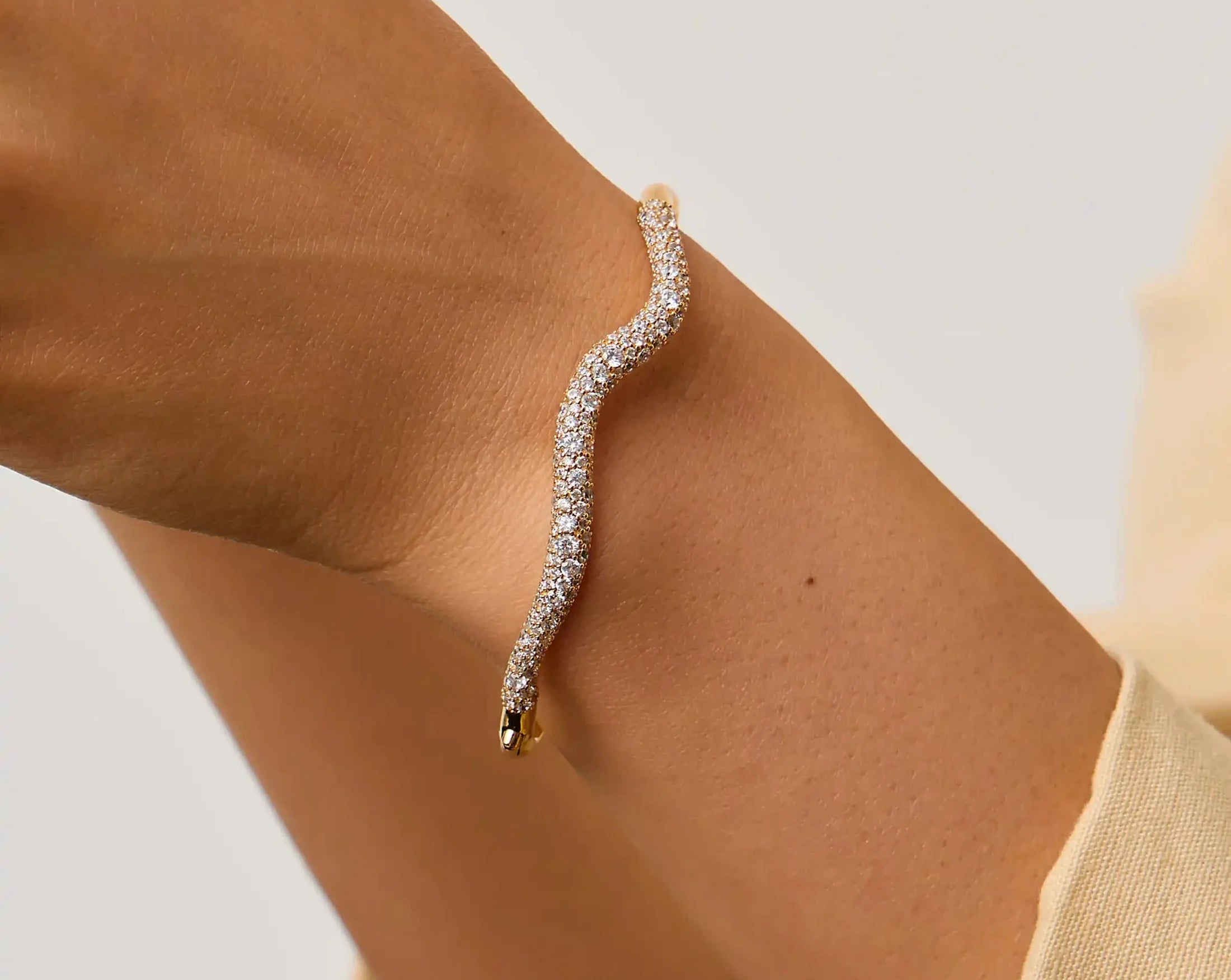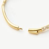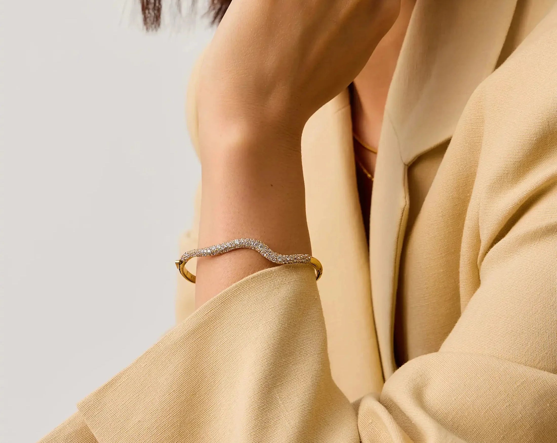 Introducing Missoma's Molten Snow Ripple Hinged Bangle, a molten gold bangle bracelet. Designed with soft organic curves, giving a sculptural molten gold texture with a frosting snow pave mimic of ice crystals, finished with a hinged detail. Perfect piece to elevate your everyday bracelet stack.