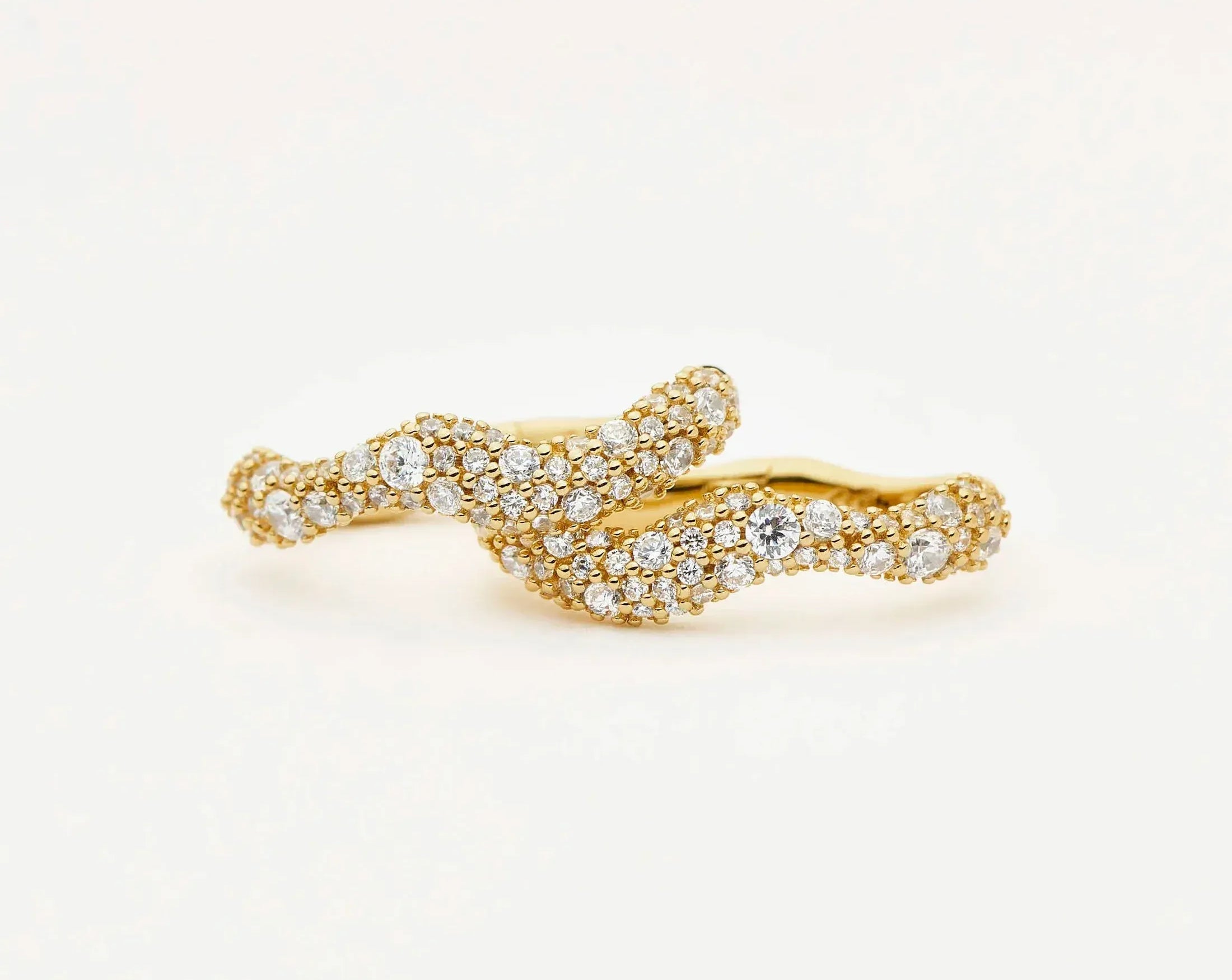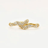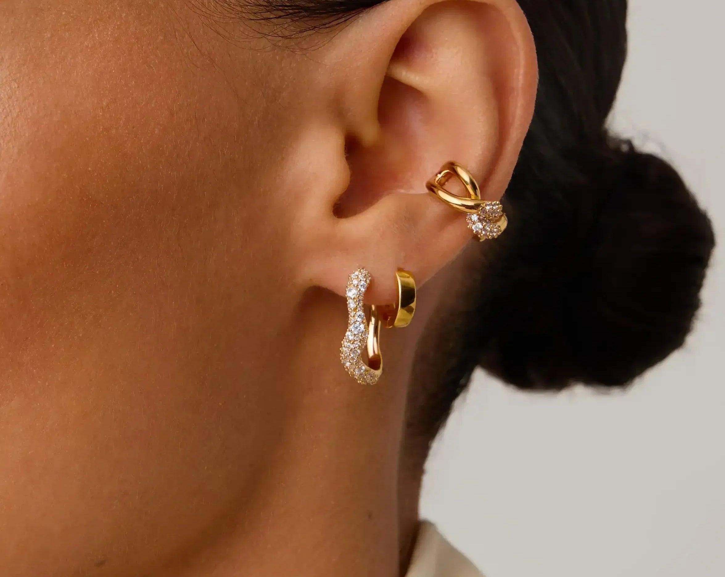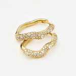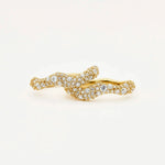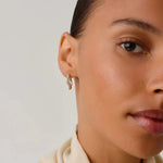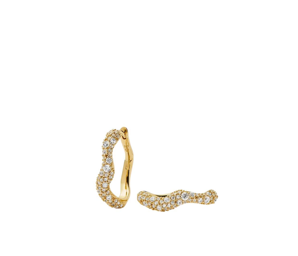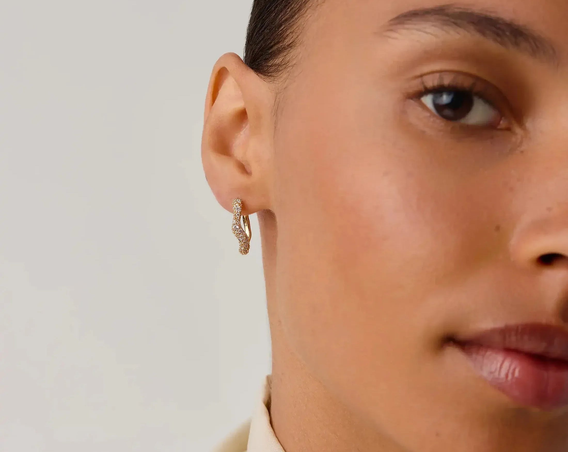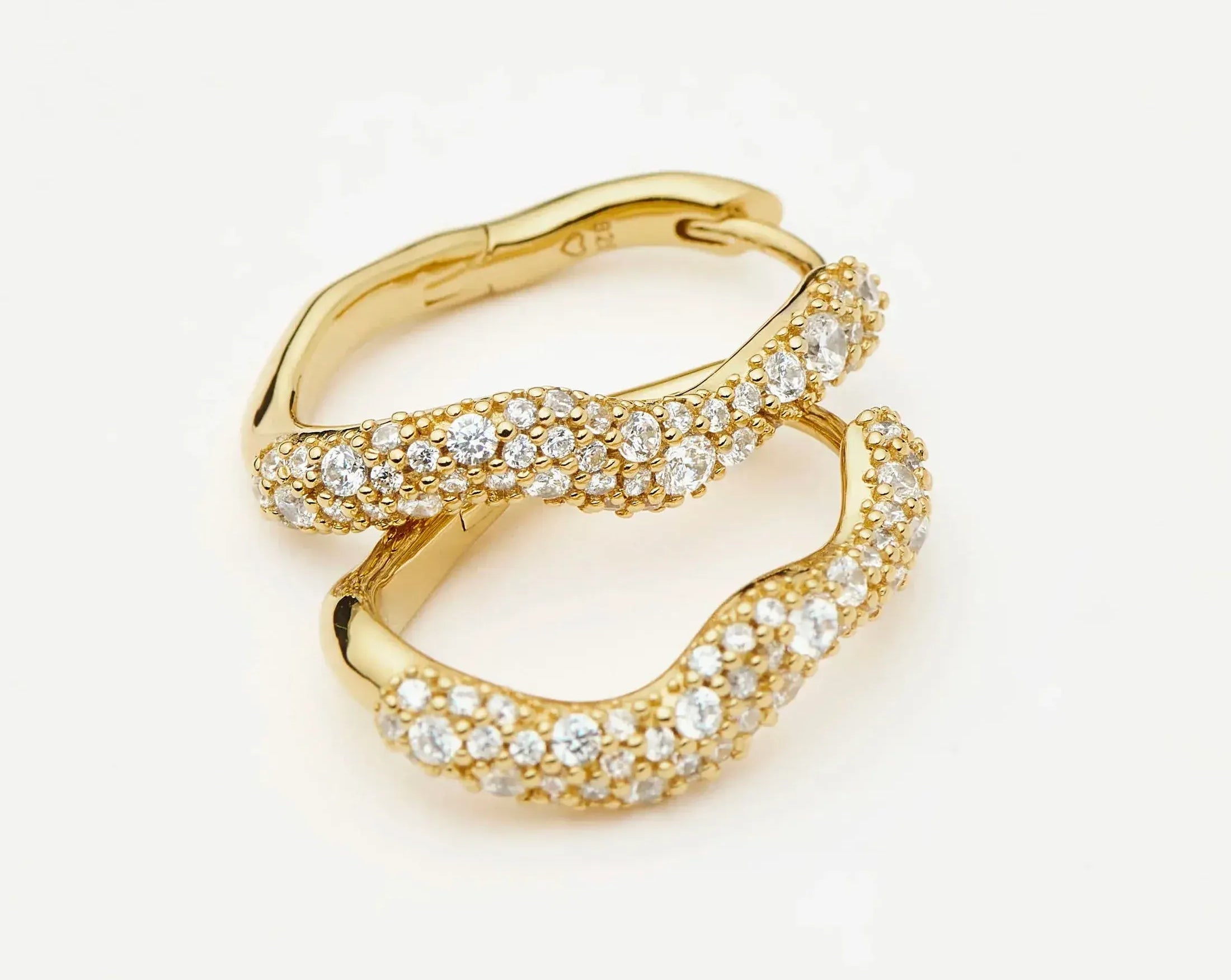 Introducing Missoma's Molten Snow Small Hoop Earrings, a pair of gold molten small hoop earrings. Designed in a sculptural curved silhouette, featuring an element of shimmer with a frosting of snow pavé to mimic ice crystals. Wear solo or stack with your favorite hoops and studs for party season styling.