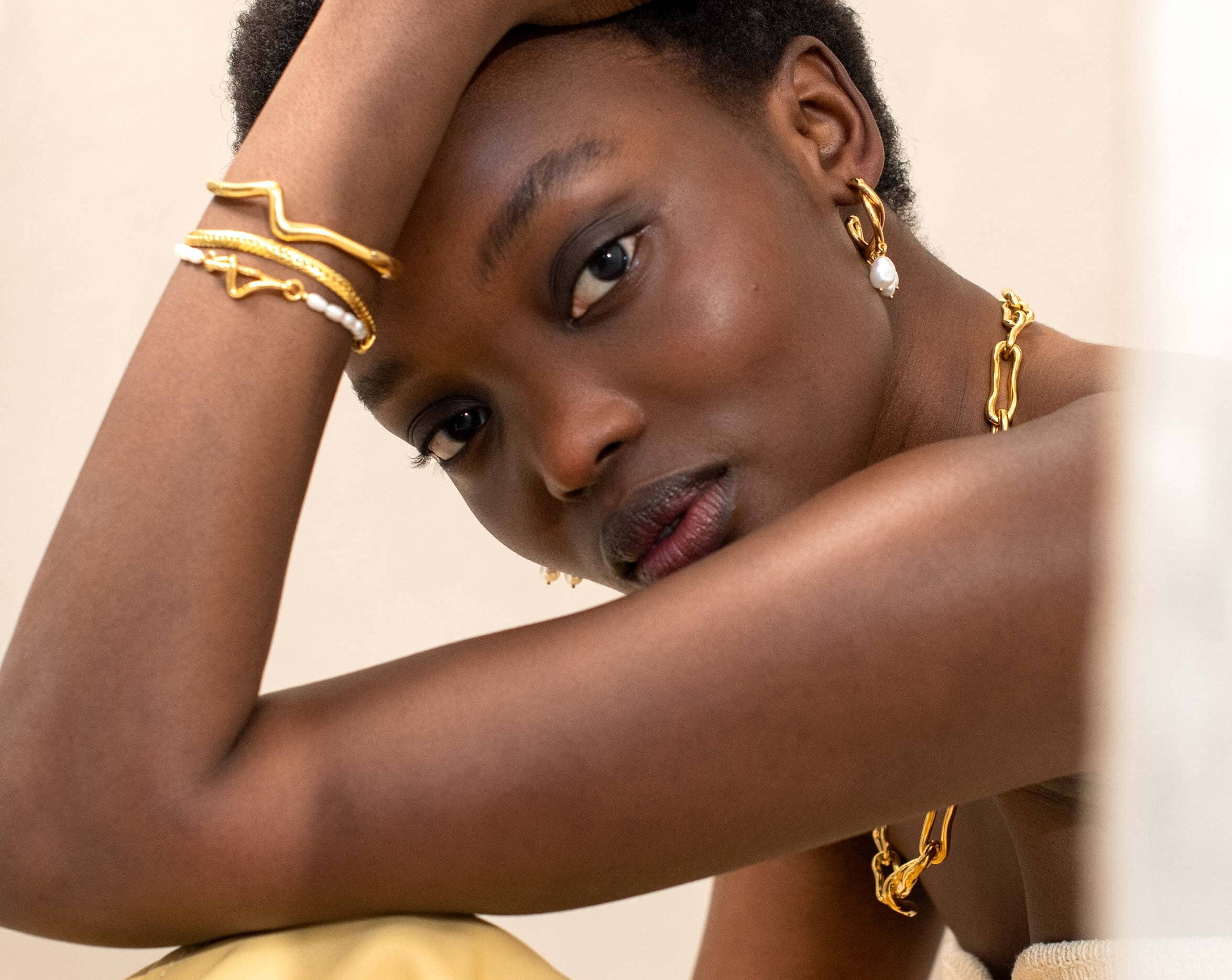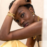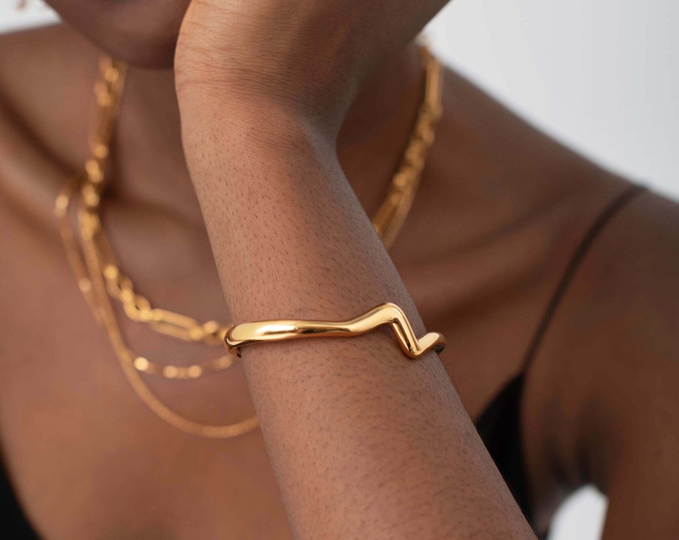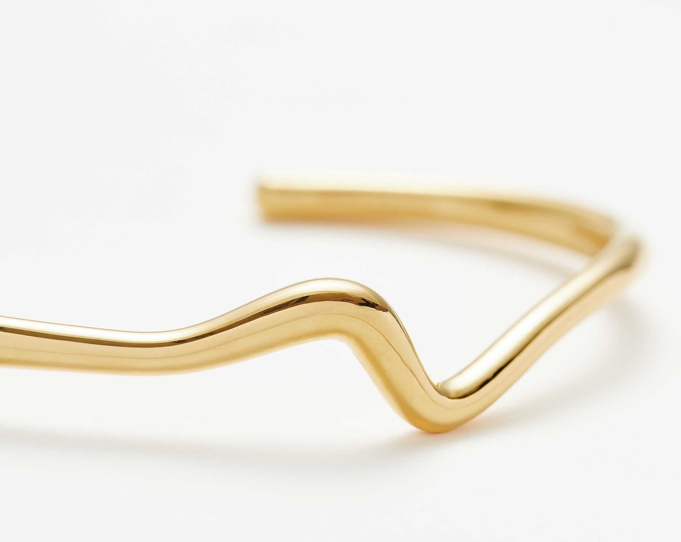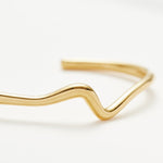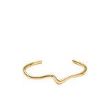 Make it molten. The Molten Wave Cuff Bracelet in Gold is a simple cuff bracelet designed with a classic round shape with wavy detailing. Designed to slide on easily, wear solo or pair with chunky chains to create a bold arm stack. This piece is handcrafted with recycled materials to help us reduce our environmental impact.