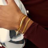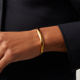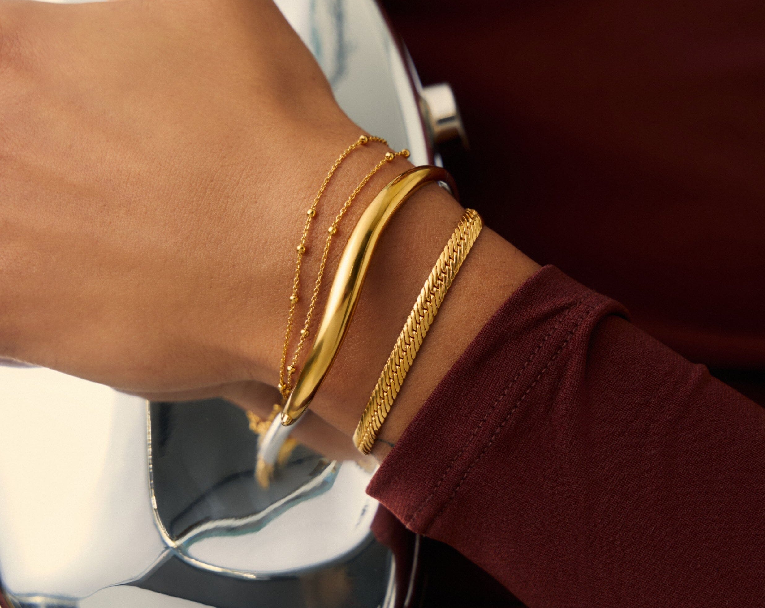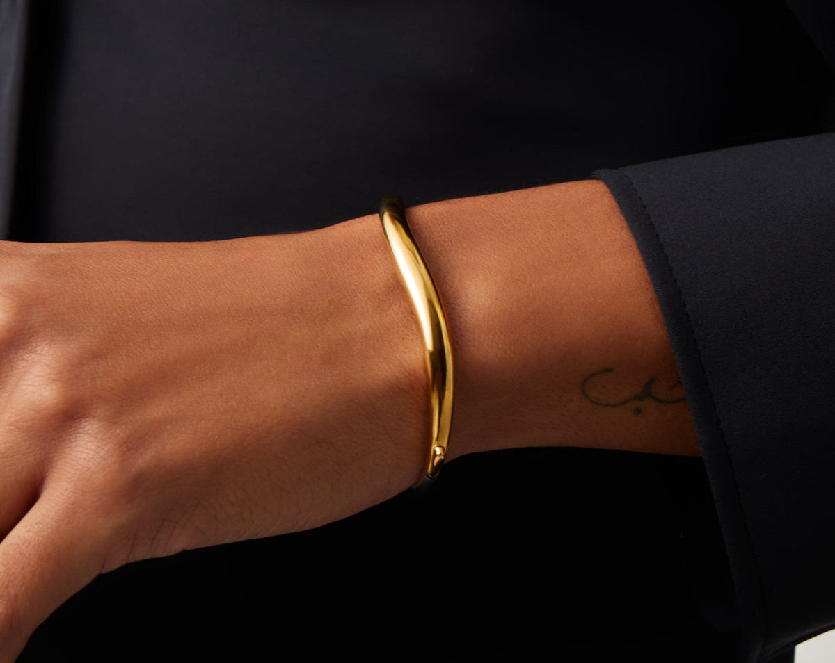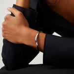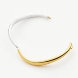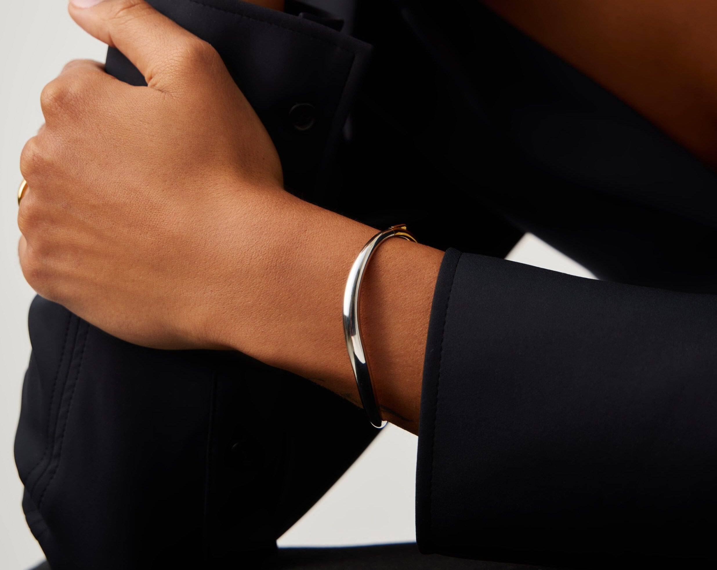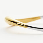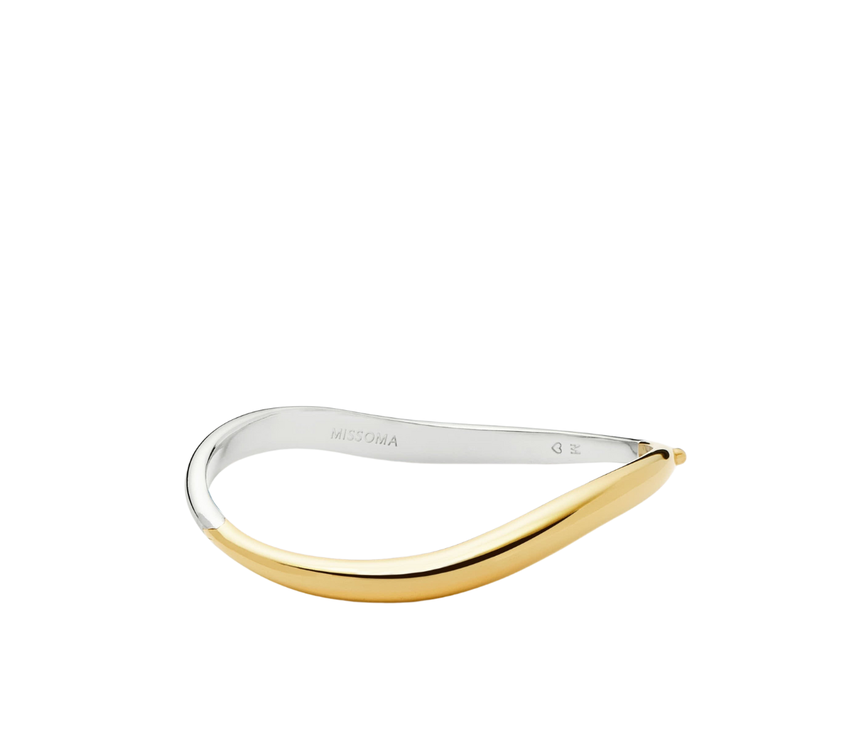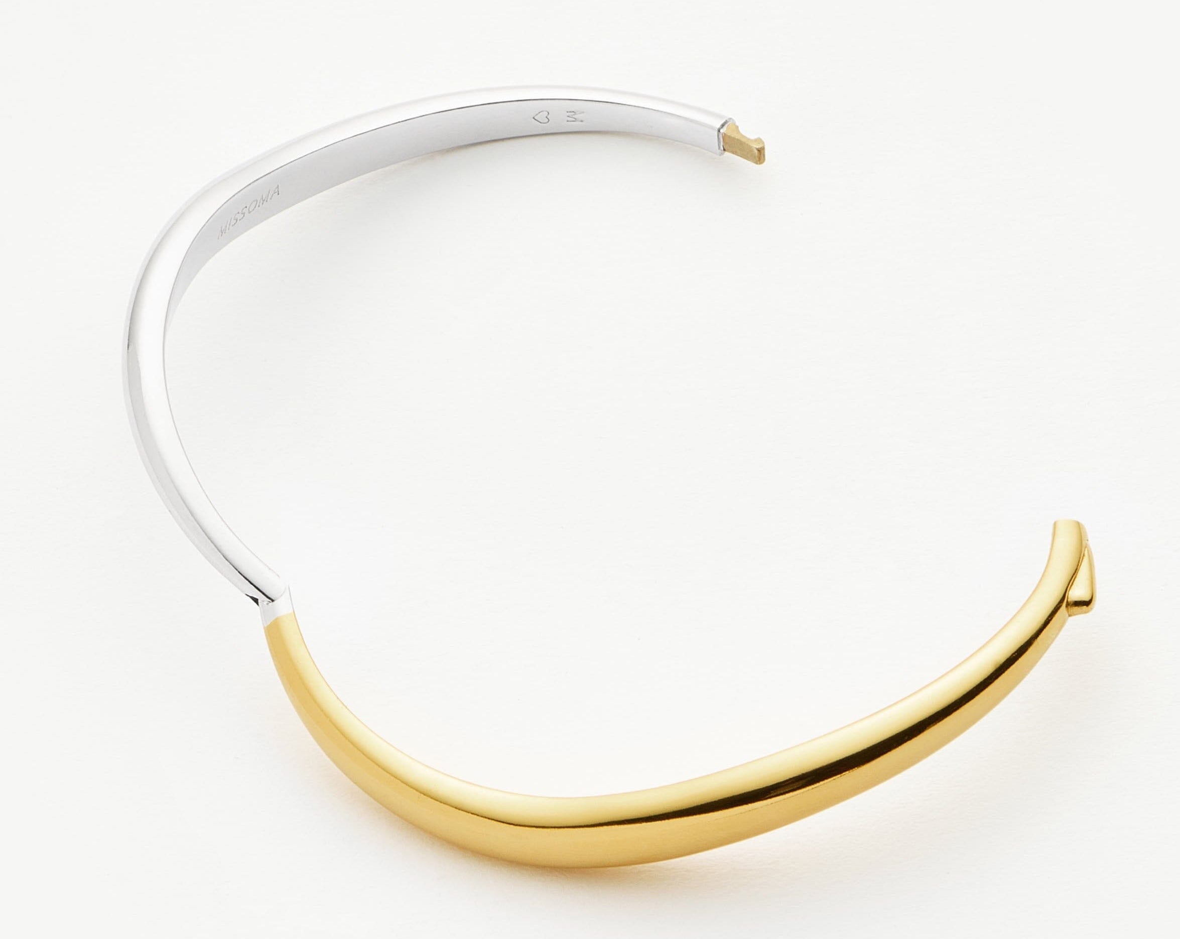 Introducing Missoma's Savi Signature Hinged Bangle in Silver and Gold, featuring our signature Savi 'S' shape as the perfect starting point for your arm stack. Designed with a hinged oval shape for easy wear, the bangle can be worn with either the gold or silver front facing, giving you two bangles in one.