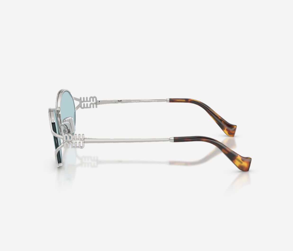 The Miu Miu 0MU-54YS-1BC10F sunglasses in Light Blue Silver capture the brand's unique blend of tradition and modernity. With a sleek gold metal frame, these sunglasses bring a touch of elegance to any look, while the irregular shape offers a distinctive, contemporary edge. The Light Blue lenses feature a solid colour treatment, adding depth and sophistication to this standout design.