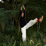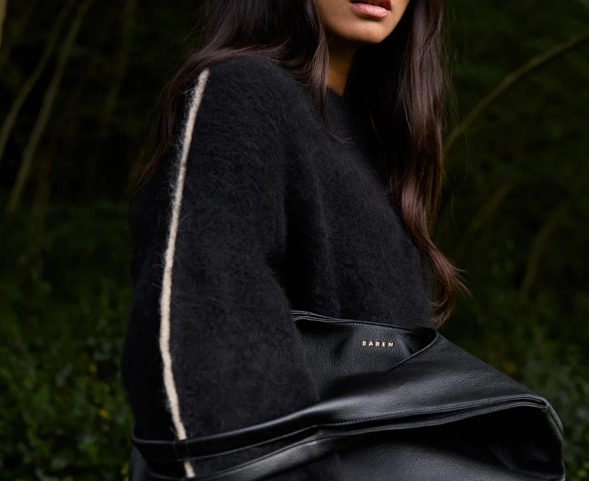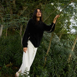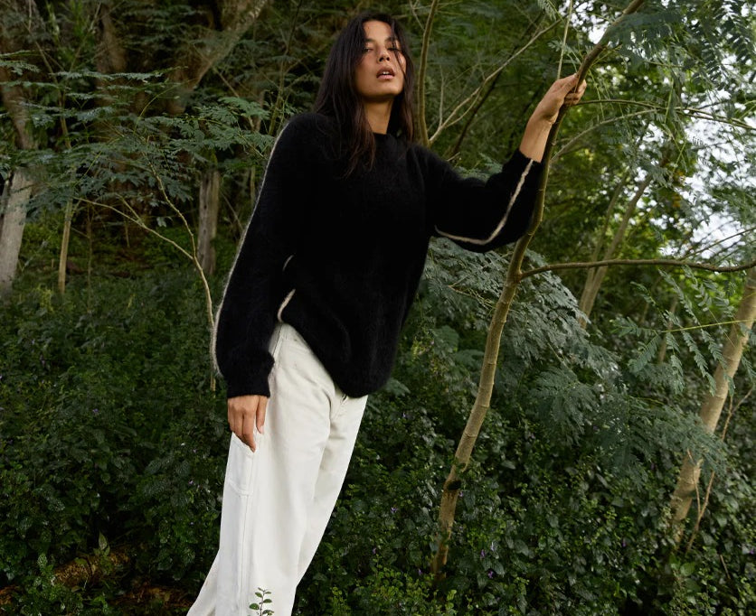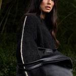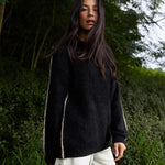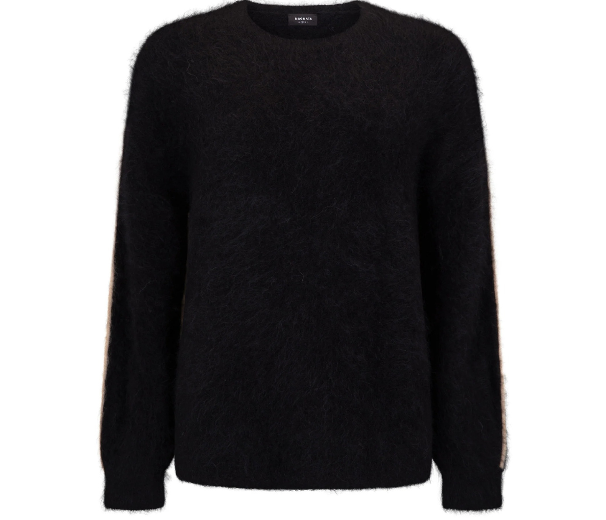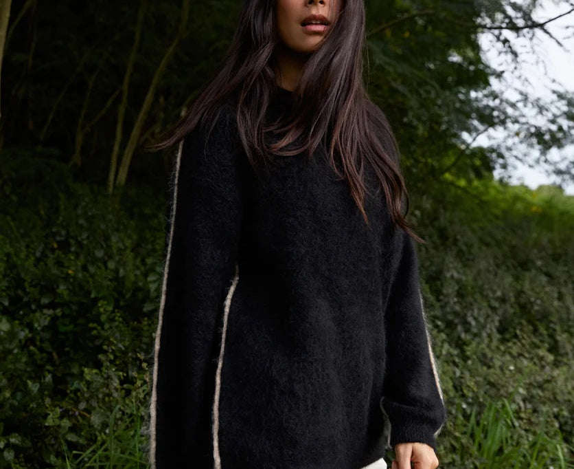 Introducing Nagnata's Brushed Alpaca Wool Sweater in Black. Crafted from a luxurious brushed alpaca blend, offering an ultra-soft hand-feel and effortless warmth. Designed in a relaxed silhouette, it features sculptural sleeves and a subtle contrast highlight along the side seams adding unexpected edge to a classic knit.