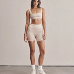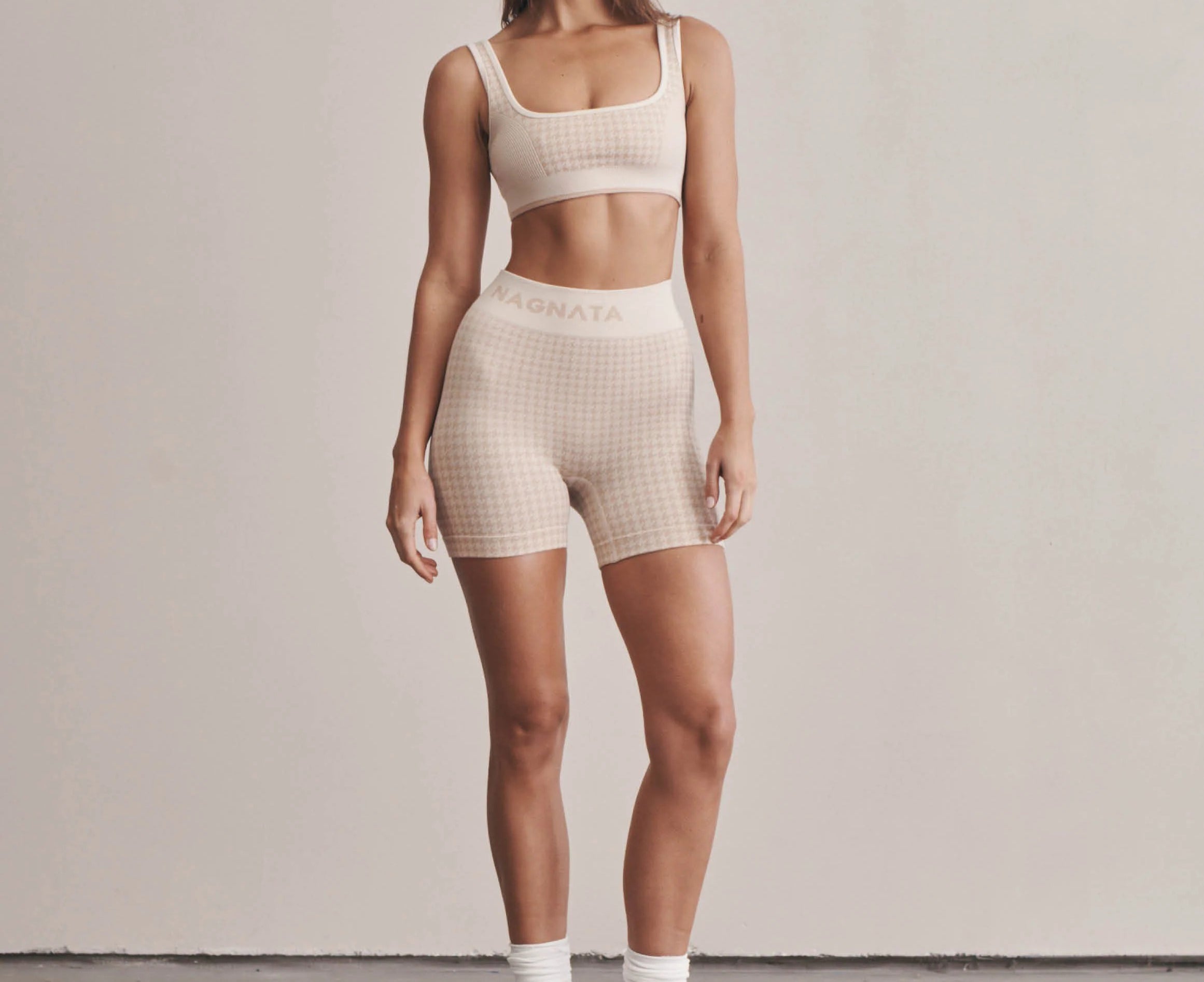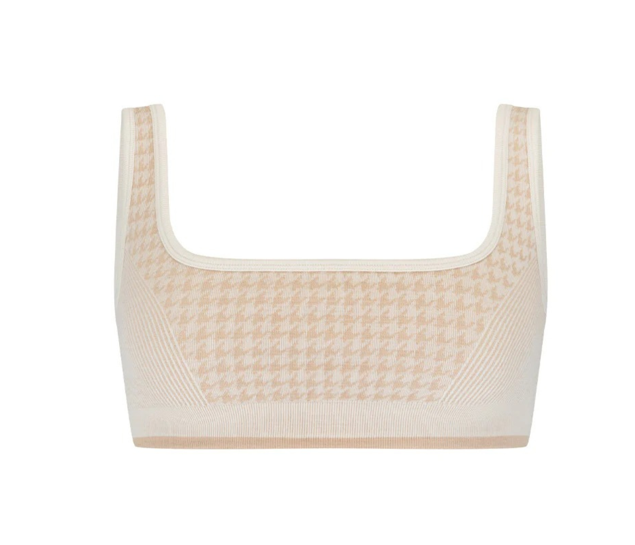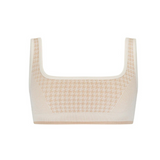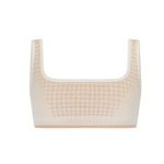 Introducing Nagnata's Houndstooth Wool Bralet in Bone White. Crafted from certified Superfine Merino wool in Nagnata’s signature rib, this seamless bralet offers a sculpted, second-skin fit with light compression and full lining for added support. Featuring a square neckline, houndstooth jacquard, and contrast hem band with logo detailing at the back.