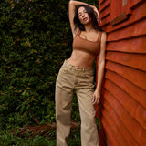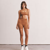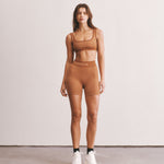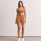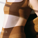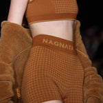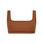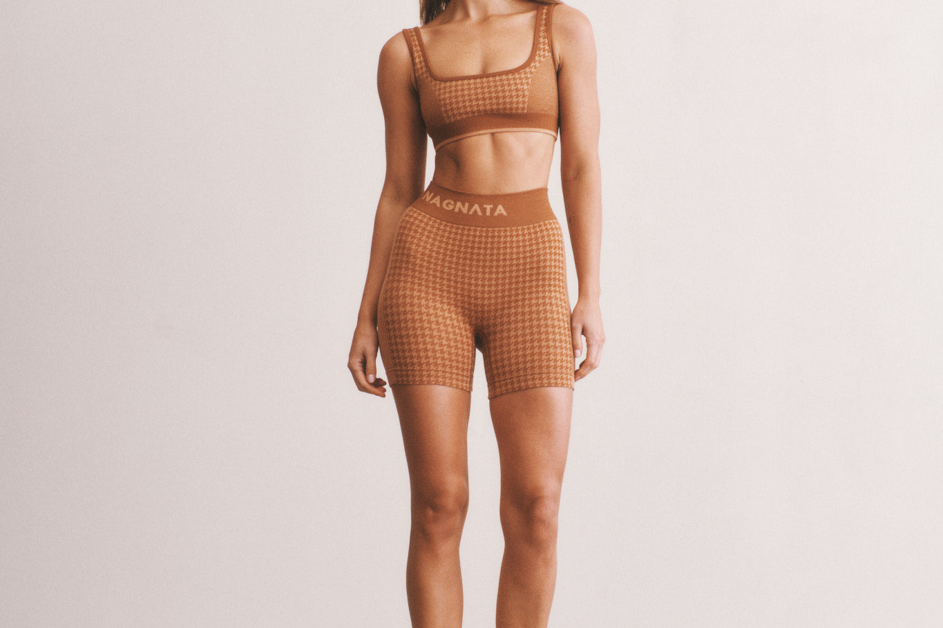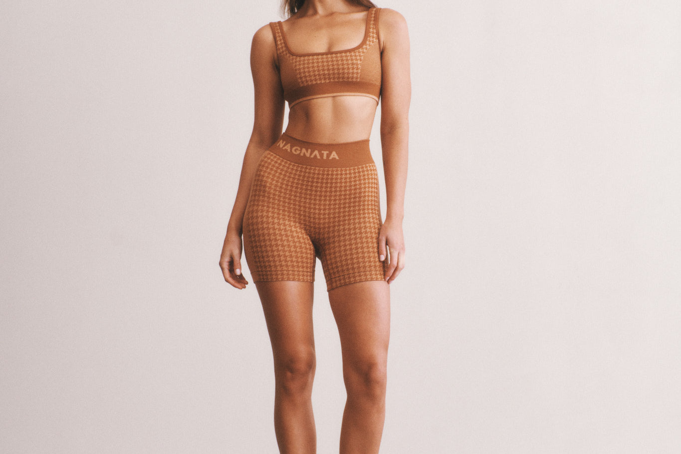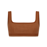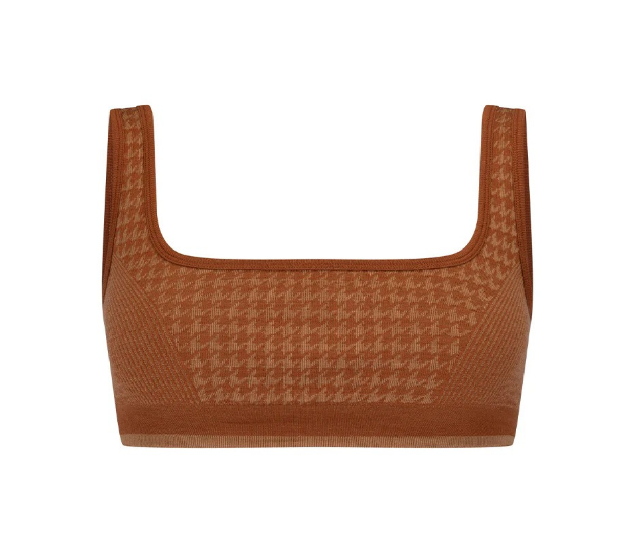 Introducing Nagnata's Houndstooth Wool Bralet in Spice. Crafted from certified Superfine Merino wool in Nagnata’s signature rib, this seamless bralet offers a sculpted, second-skin fit with light compression and full lining for added support. Featuring a square neckline, houndstooth jacquard, and contrast hem band with logo detailing at the back.