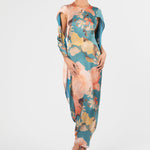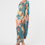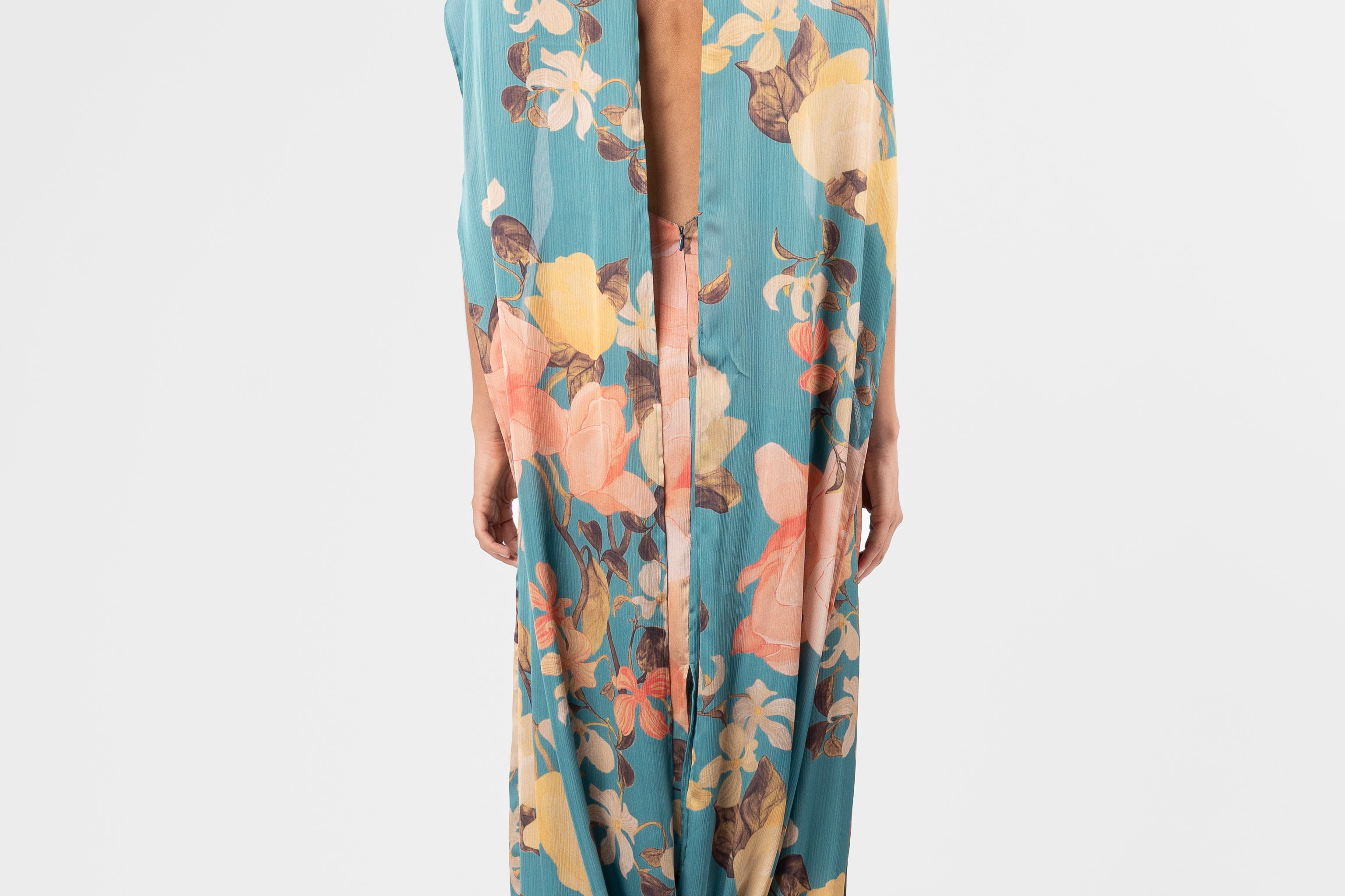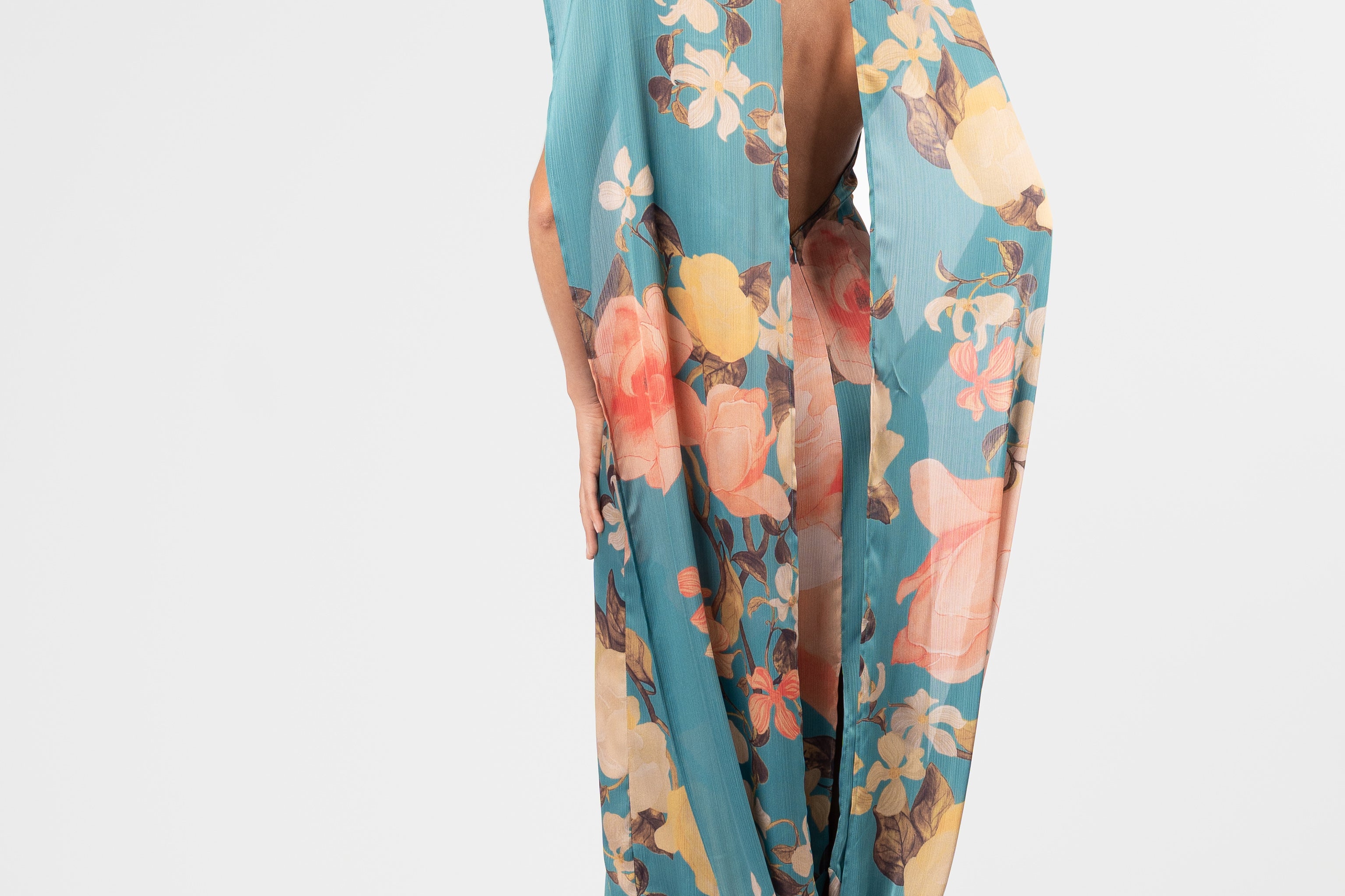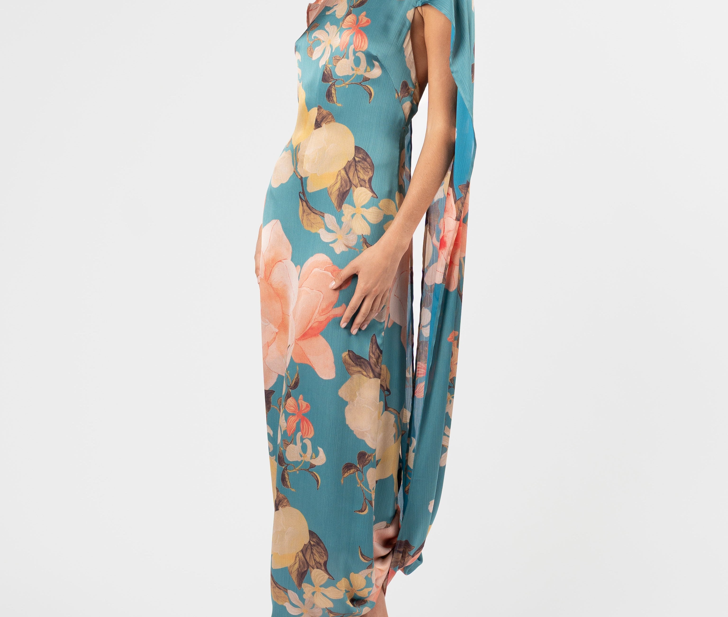 Introducing One Fell Swoop’s Backlit Dress in Lagoon, an open-back maxi silhouette in One Fell Swoop’s exclusive floral lagoon print. Designed with fluid side panels that extend into a cape-like drape, the Backlit dress features an open back, round neckline, and centre back invisible zip. Perfect for evening occasions and summer events.