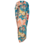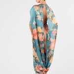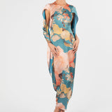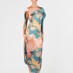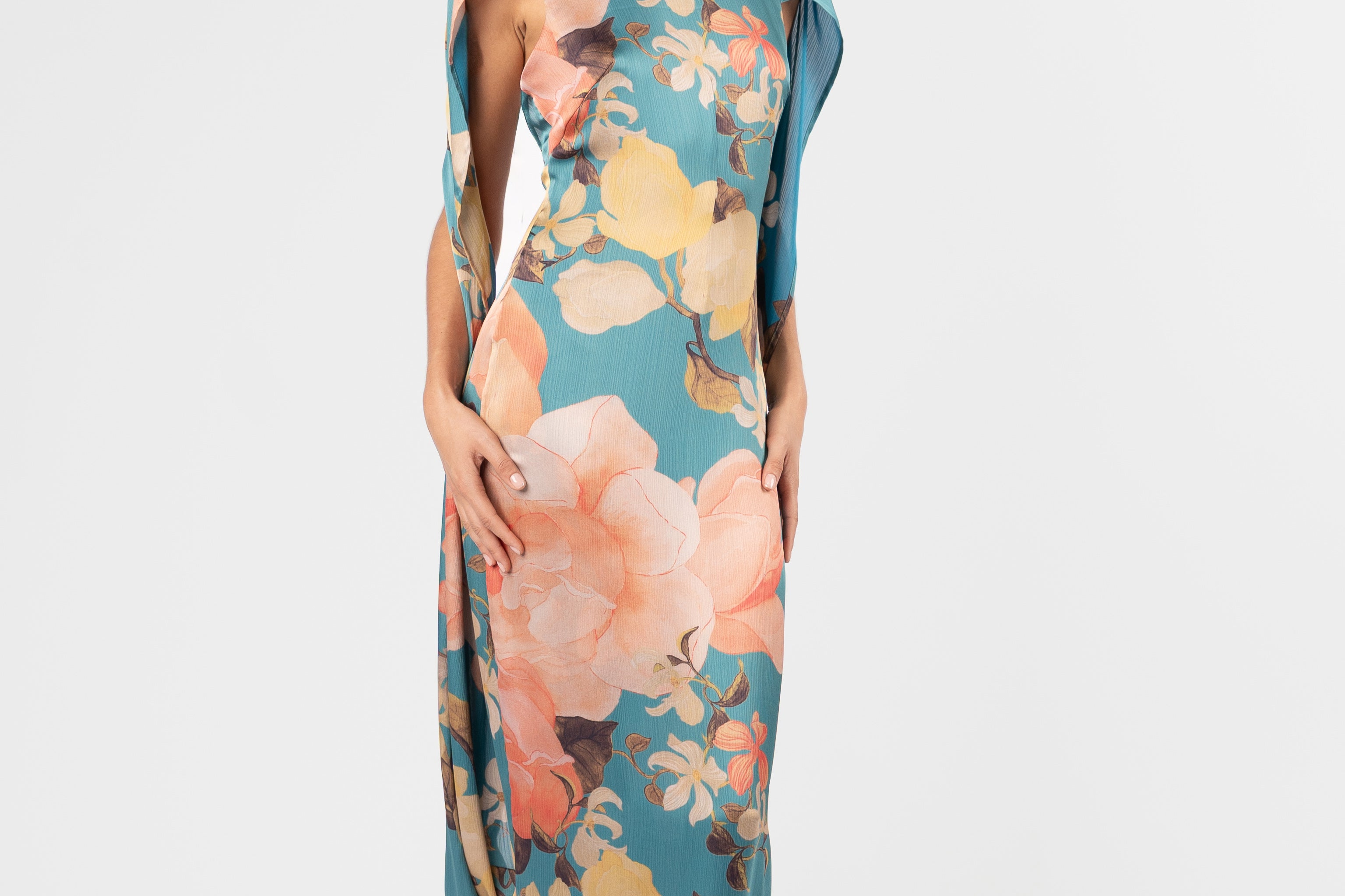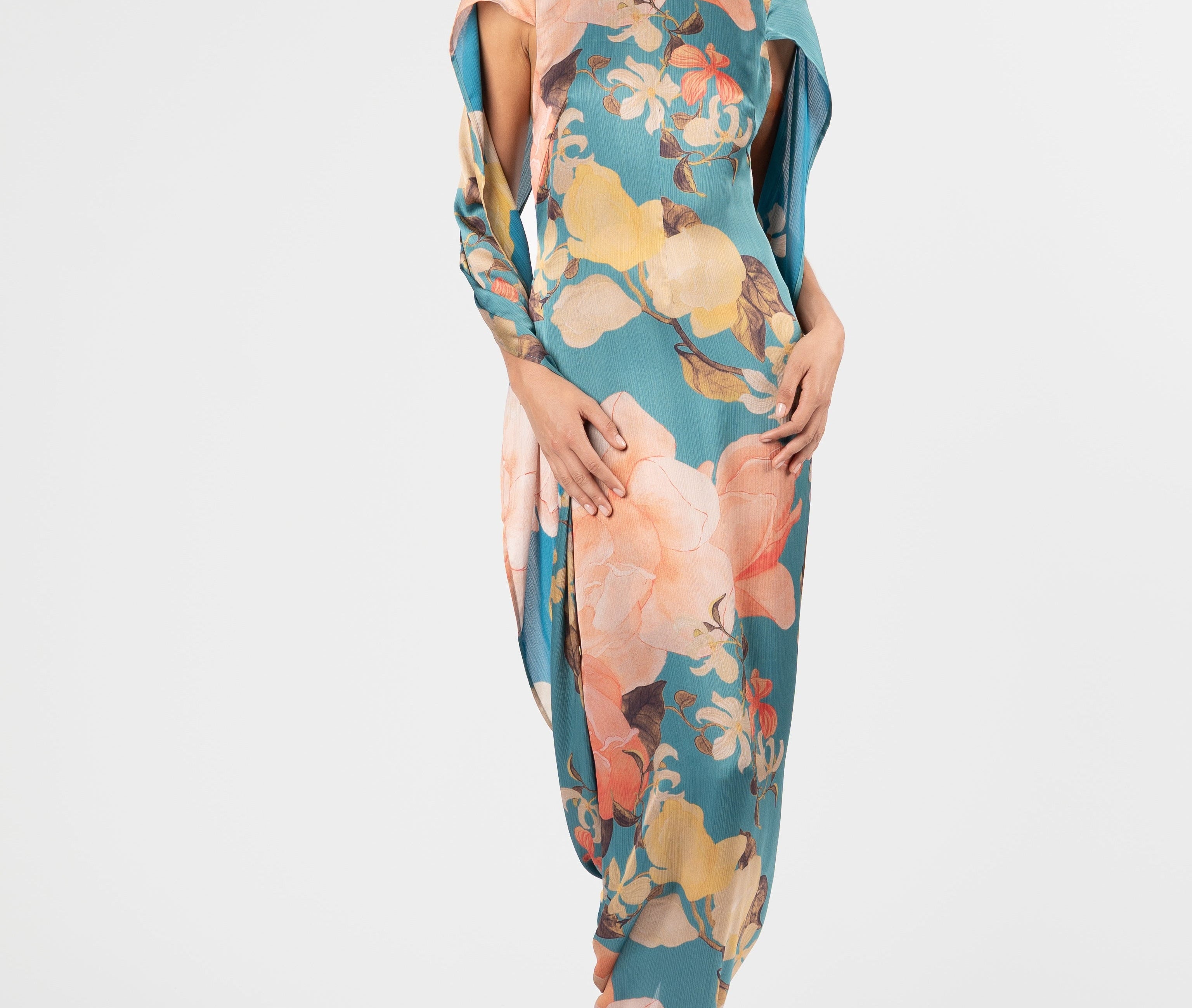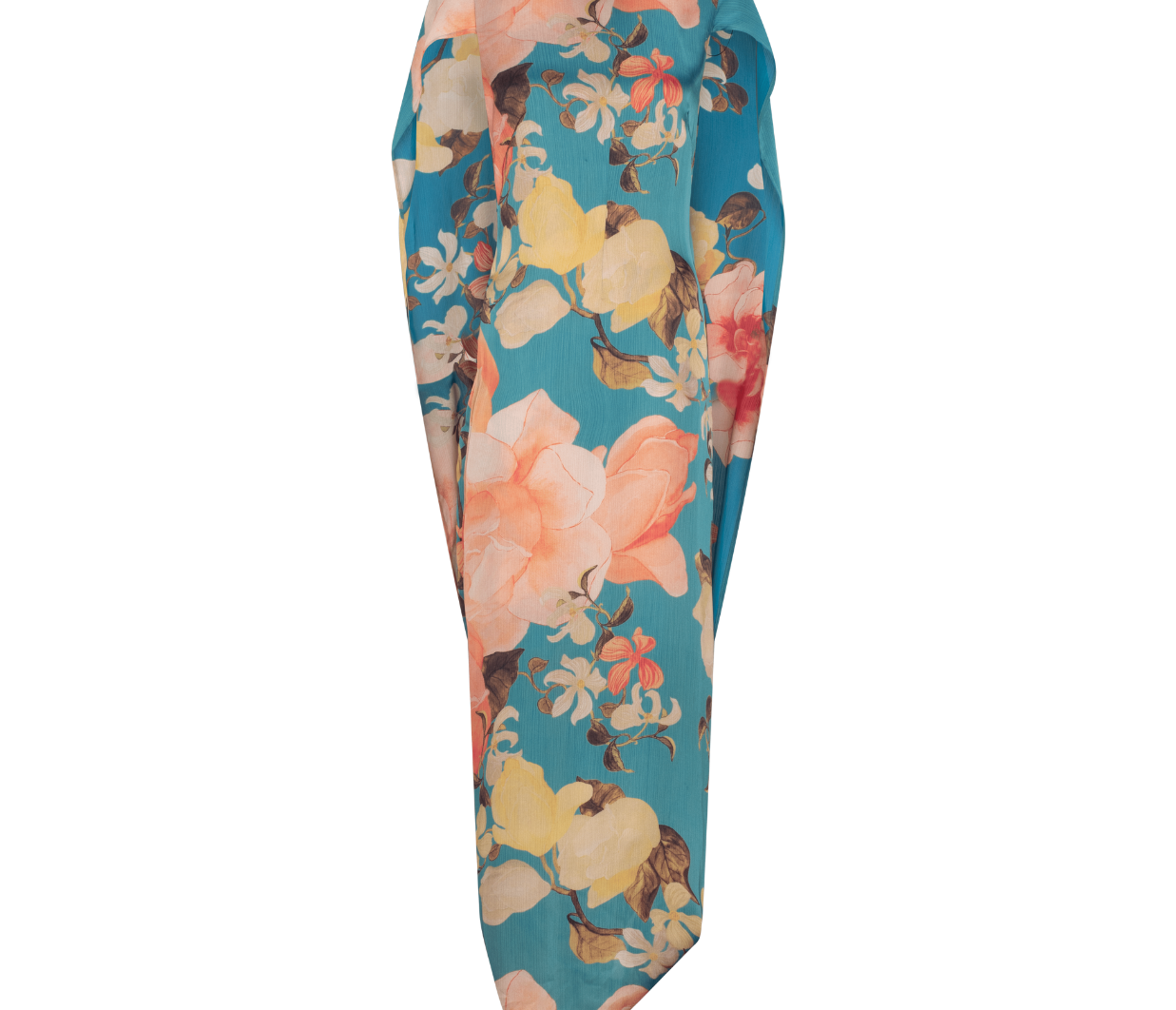 Introducing One Fell Swoop’s Backlit Dress in Lagoon, an open-back maxi silhouette in One Fell Swoop’s exclusive floral lagoon print. Designed with fluid side panels that extend into a cape-like drape, the Backlit dress features an open back, round neckline, and centre back invisible zip. Perfect for evening occasions and summer events.