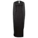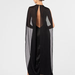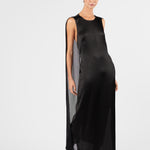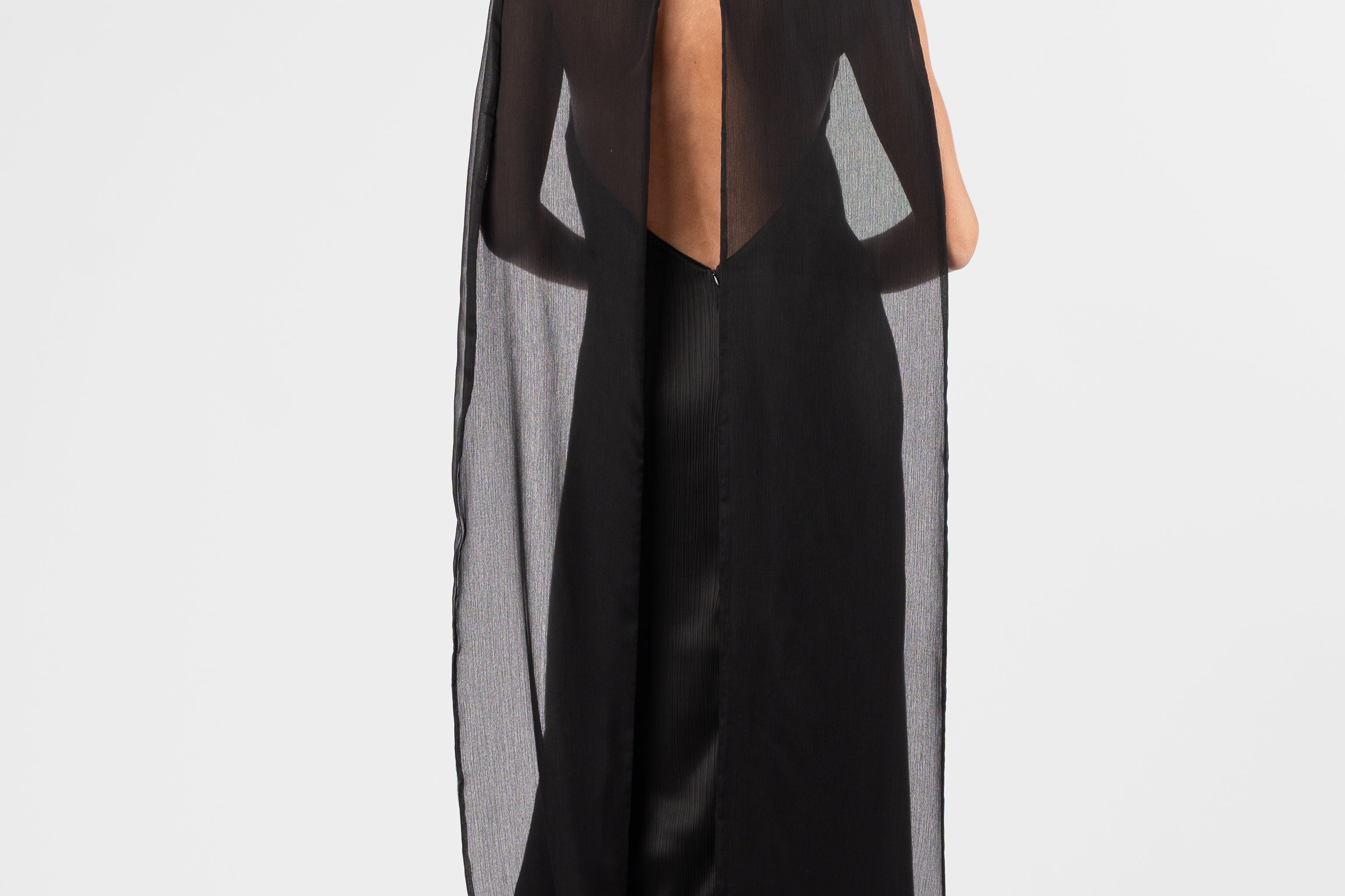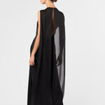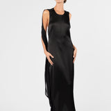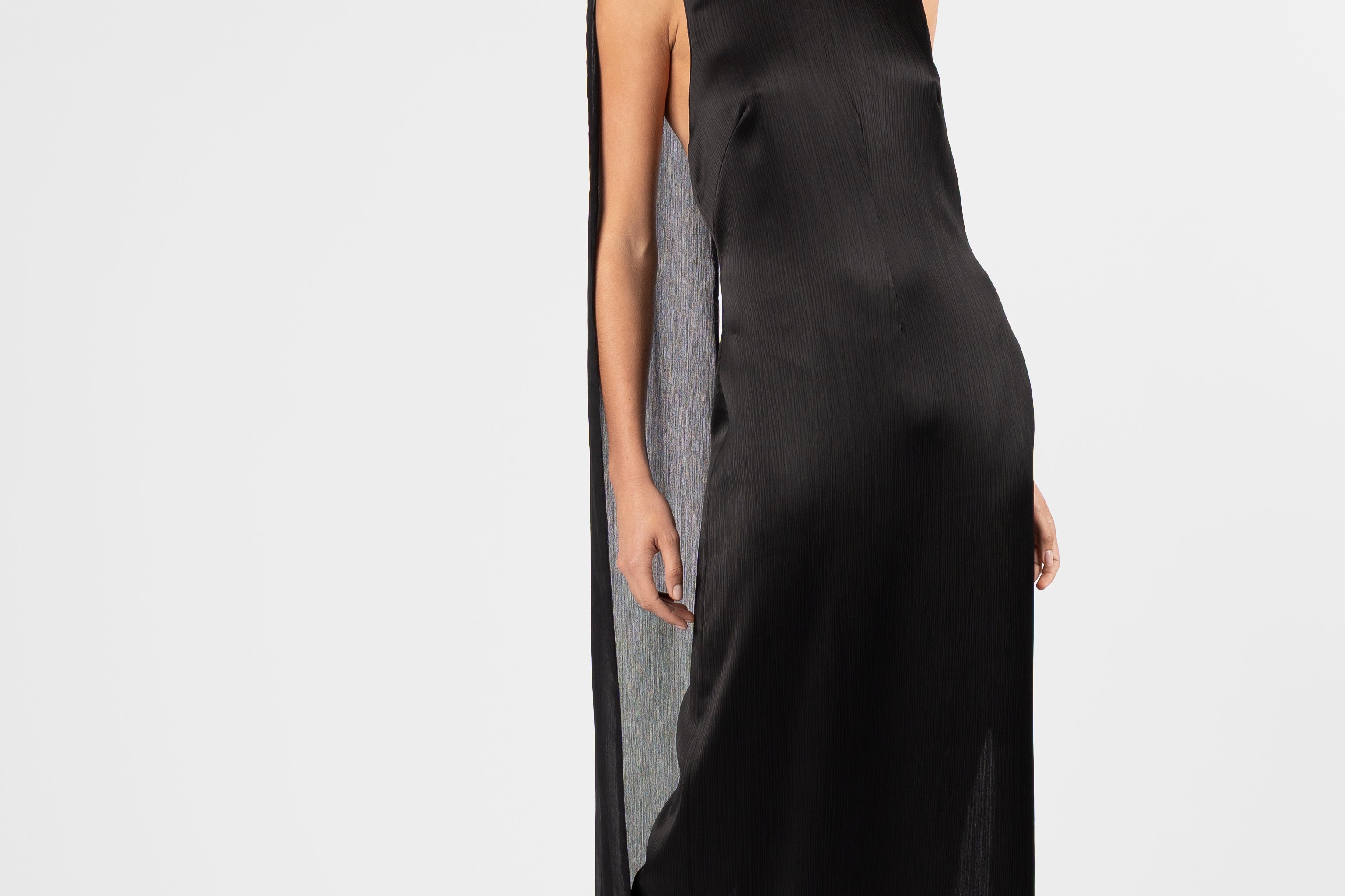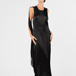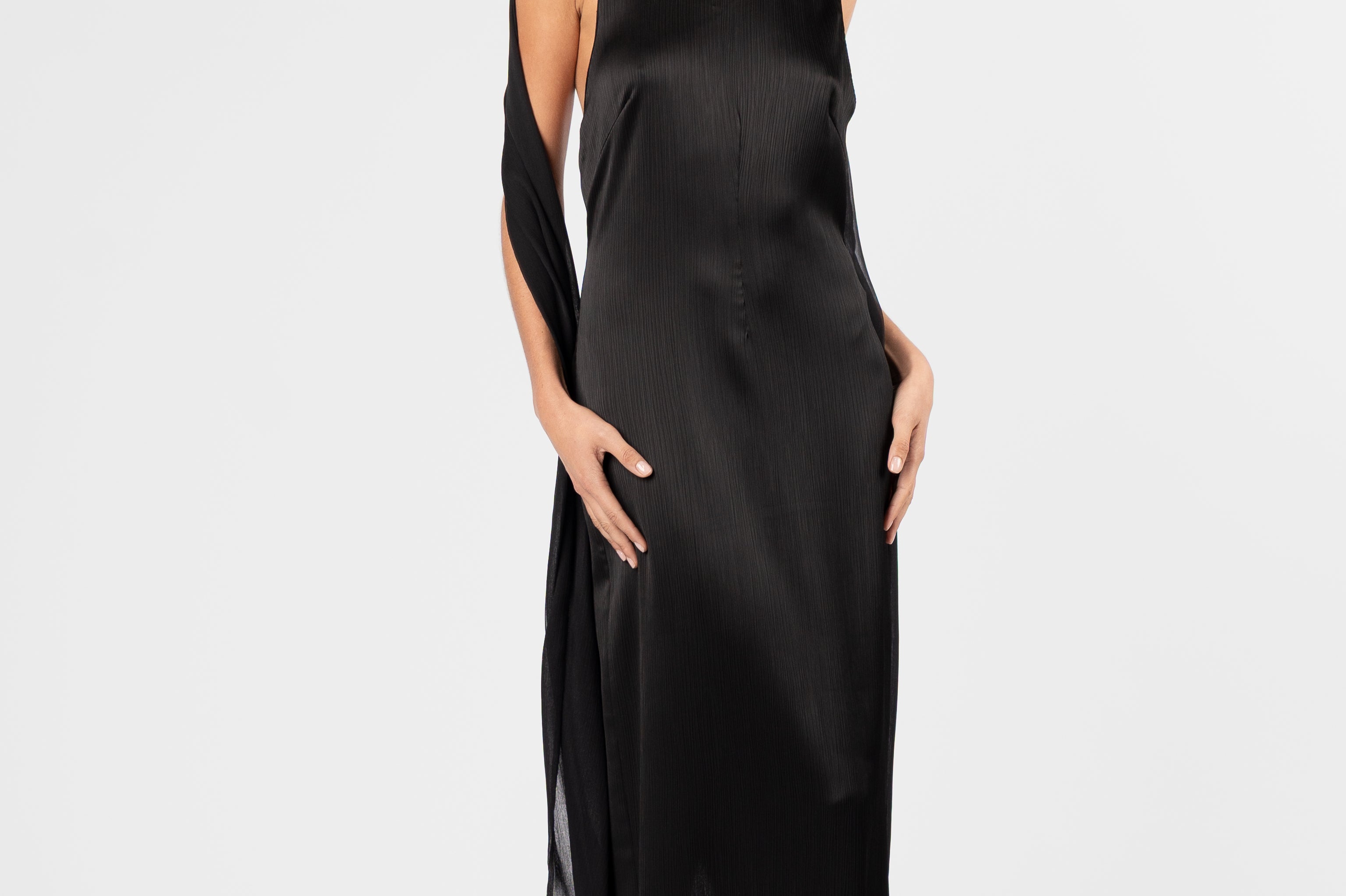 Introducing One Fell Swoop’s Dani Dress in Obsidian, a backless maxi silhouette in a black hue. Designed with a high round neckline, sleeveless, backless cut, and an asymmetric cape drape that moves fluidly with each step. The modern asymmetric hemline enhances its sculptural edge, making it an elevated choice for refined evening occasions.