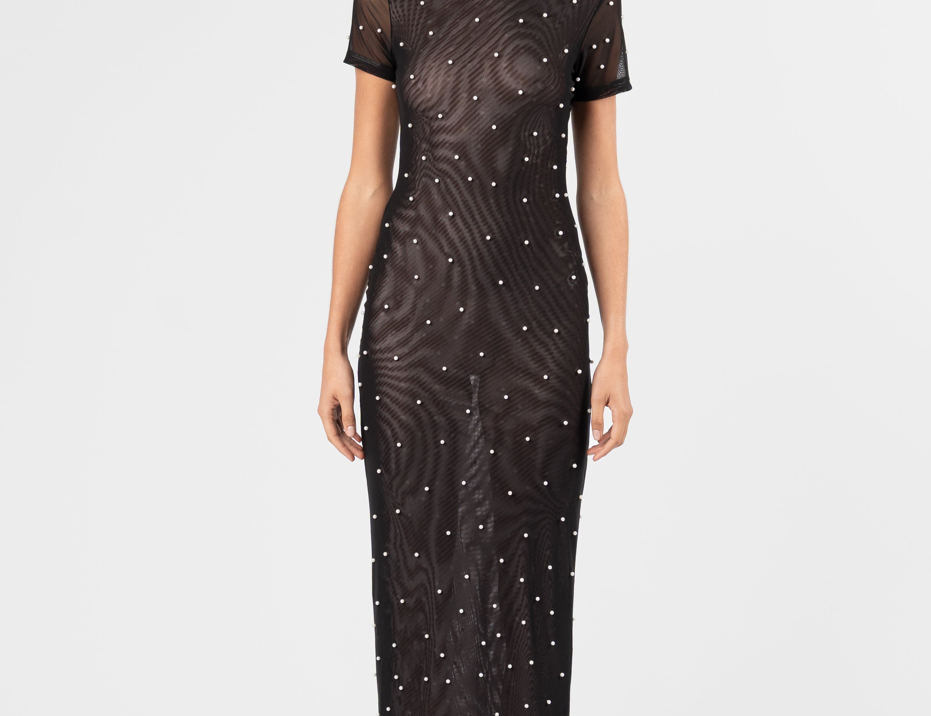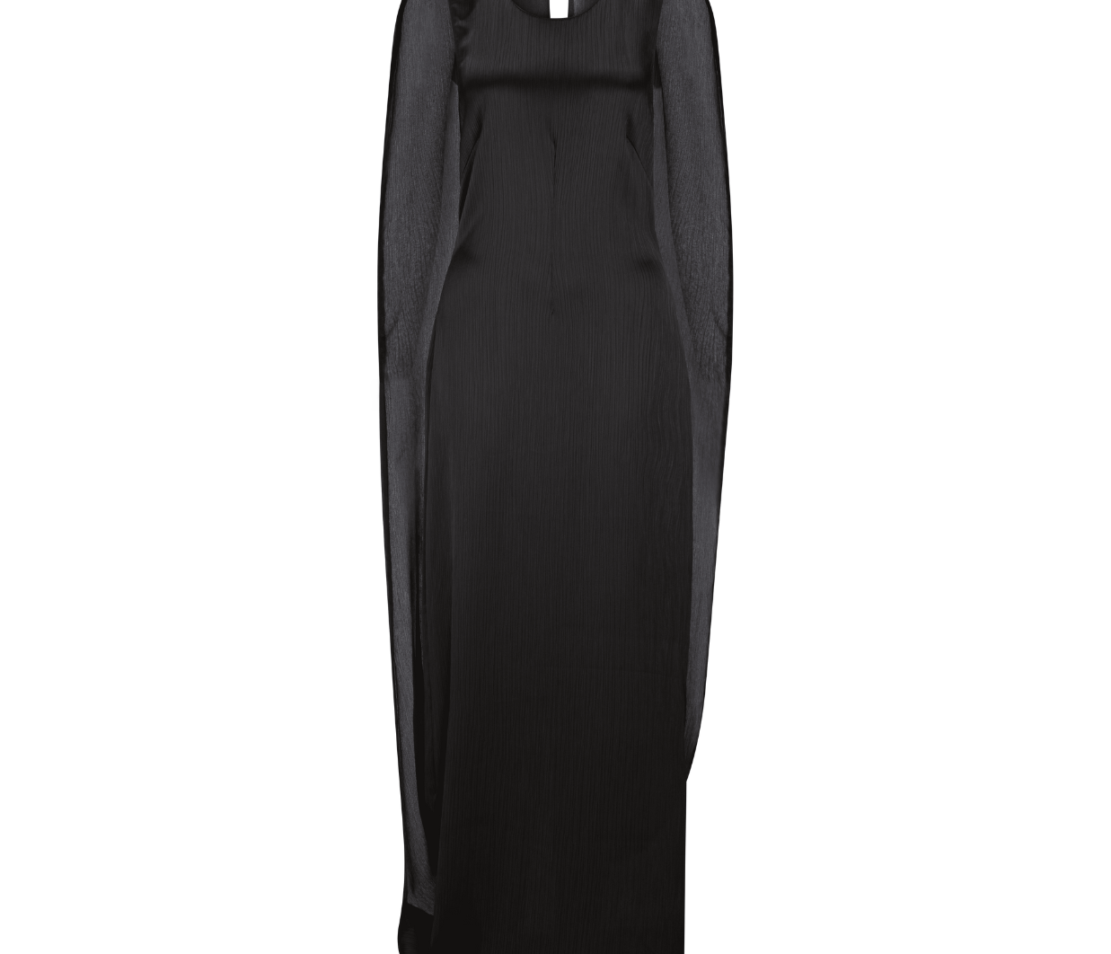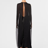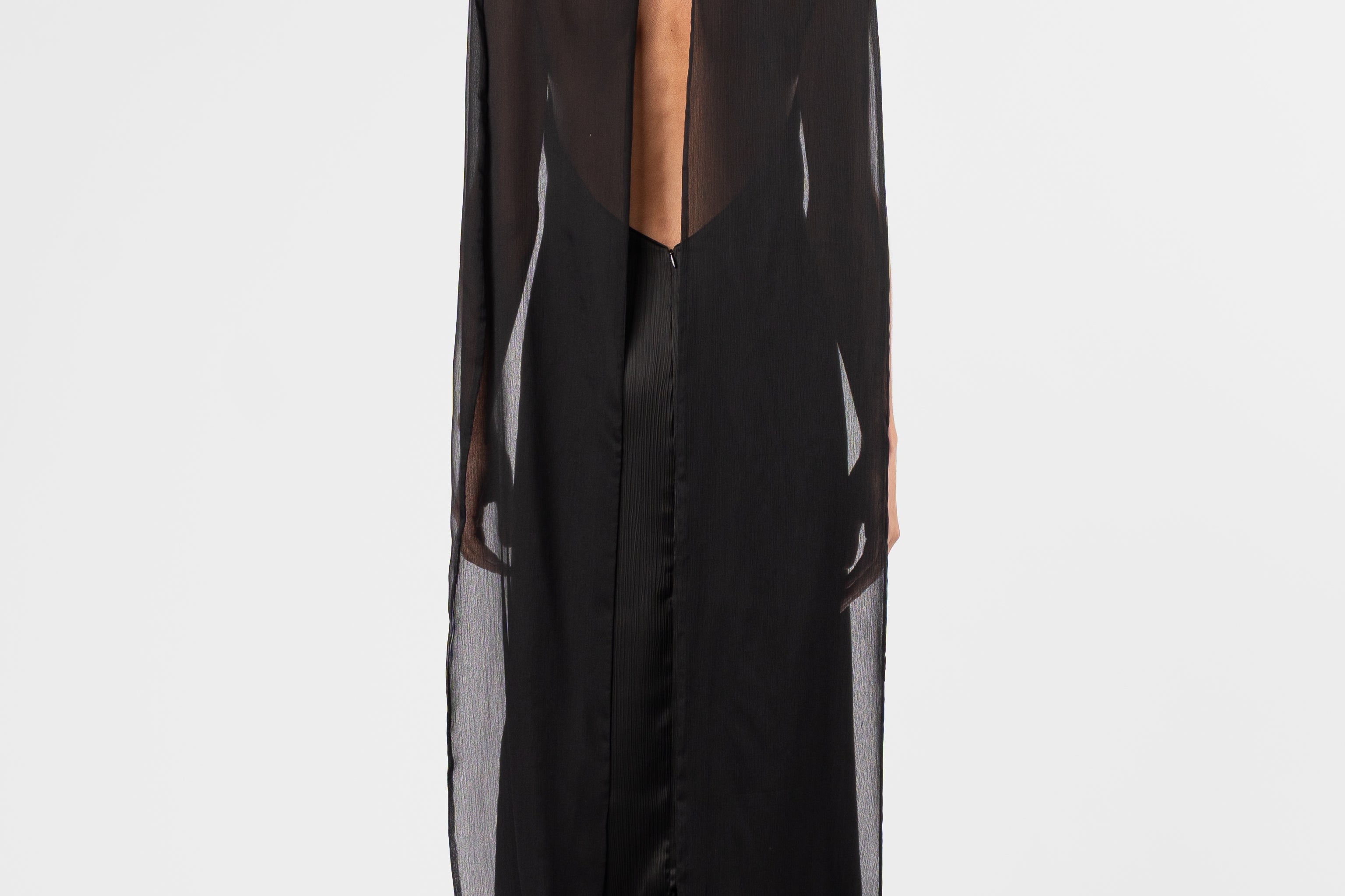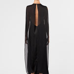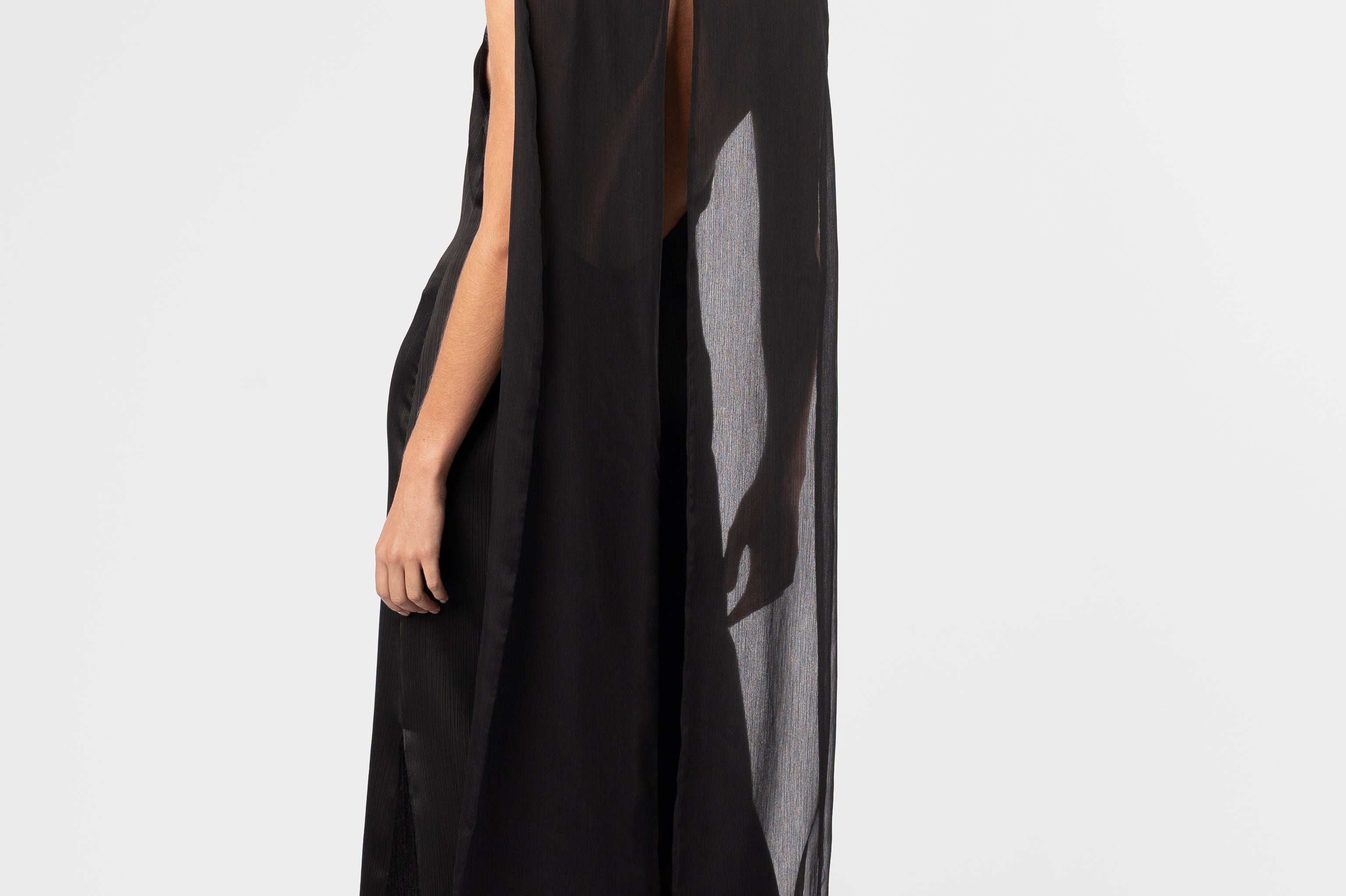 Introducing One Fell Swoop’s Dani Dress in Obsidian, a backless maxi silhouette in a black hue. Designed with a high round neckline, sleeveless, backless cut, and an asymmetric cape drape that moves fluidly with each step. The modern asymmetric hemline enhances its sculptural edge, making it an elevated choice for refined evening occasions.