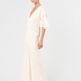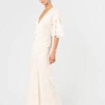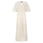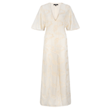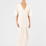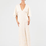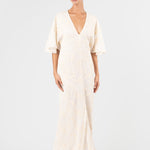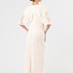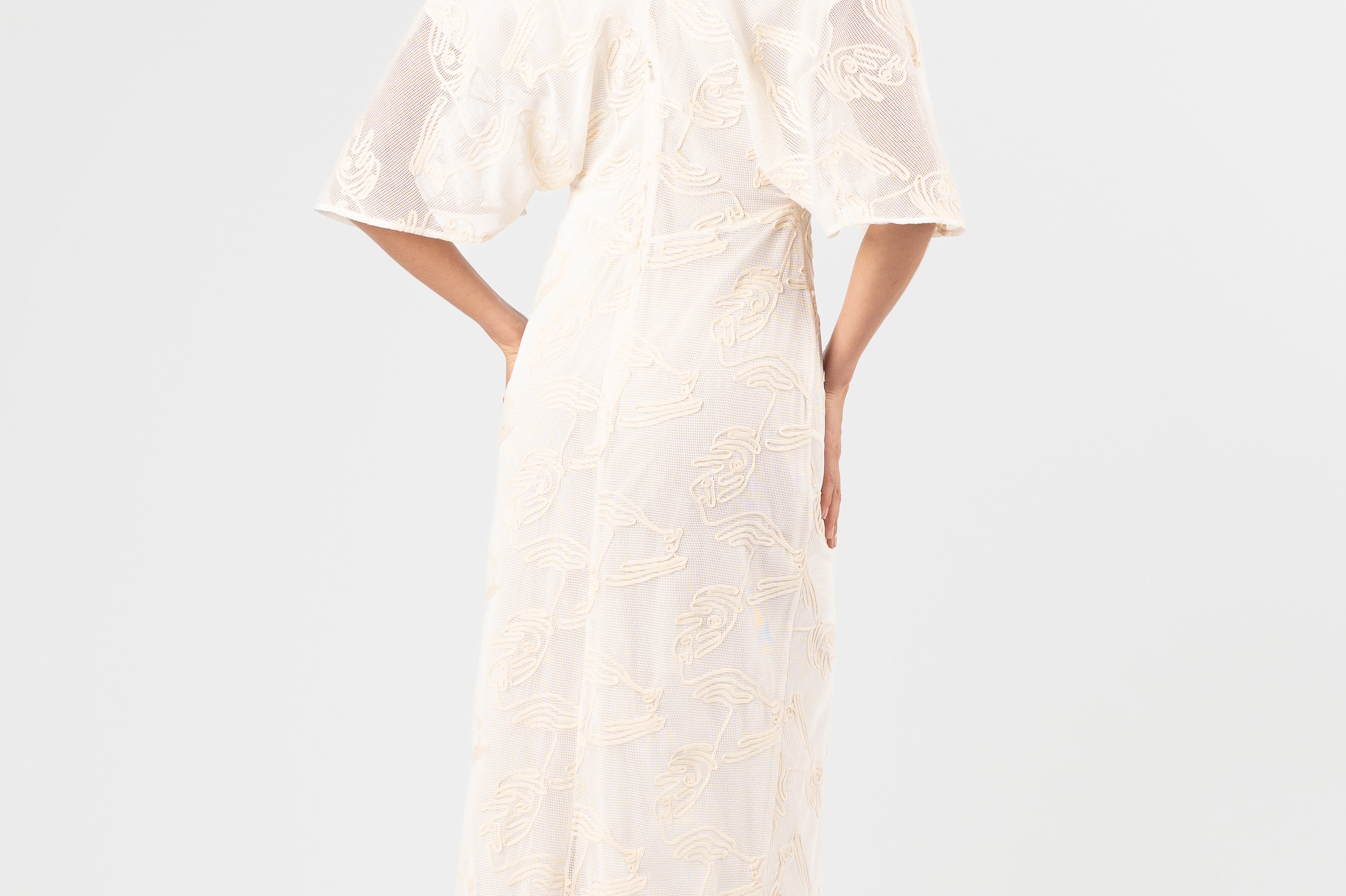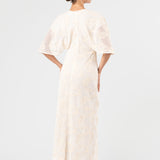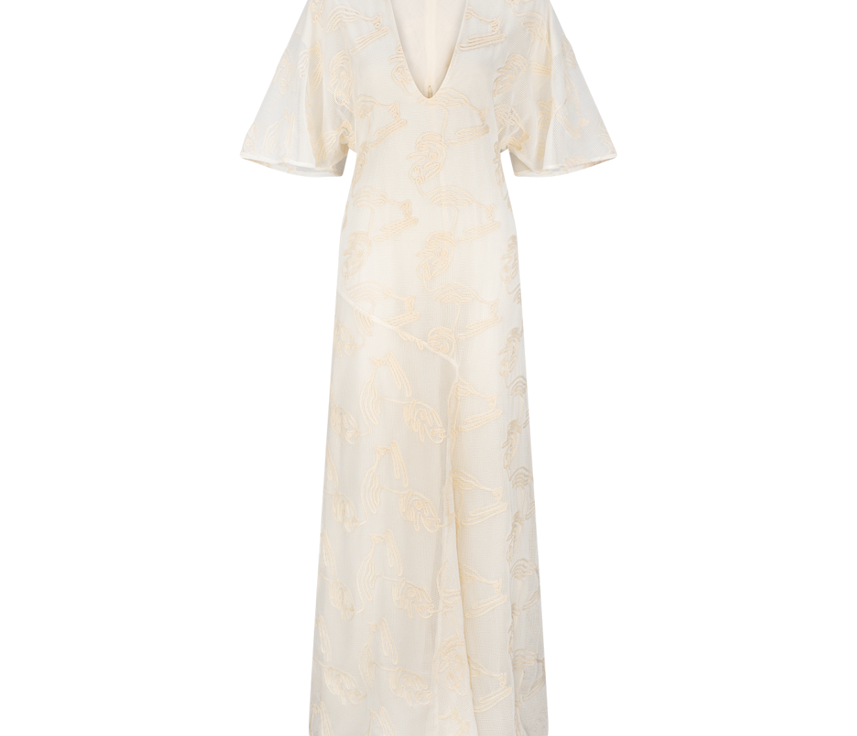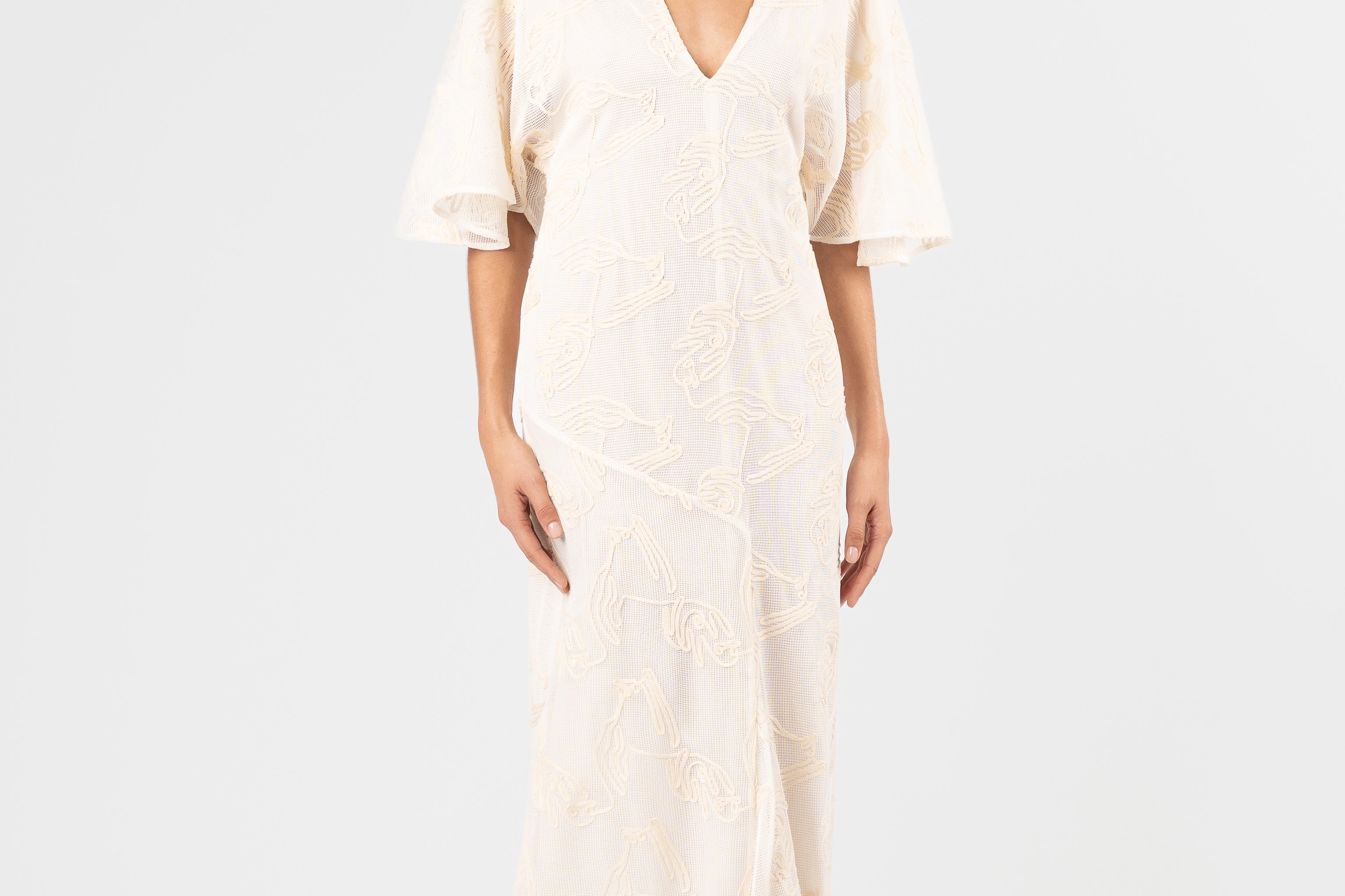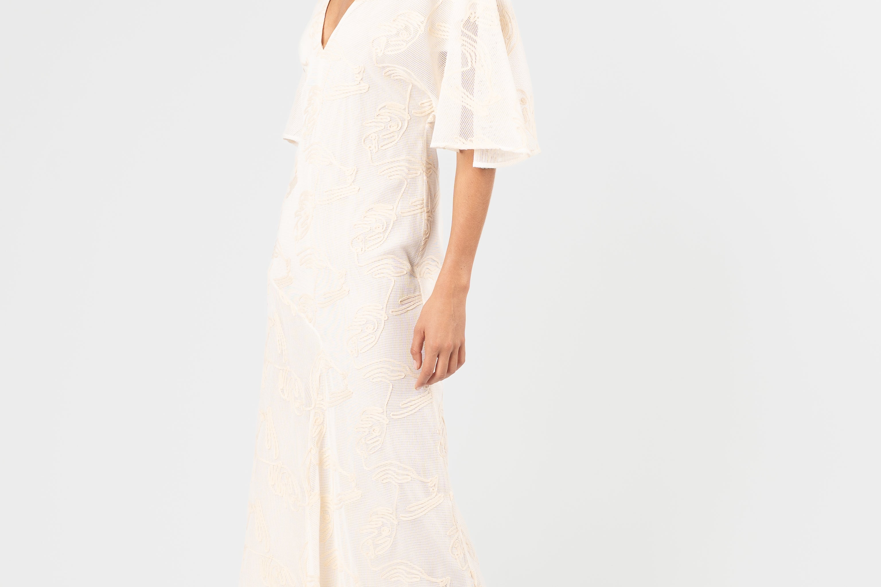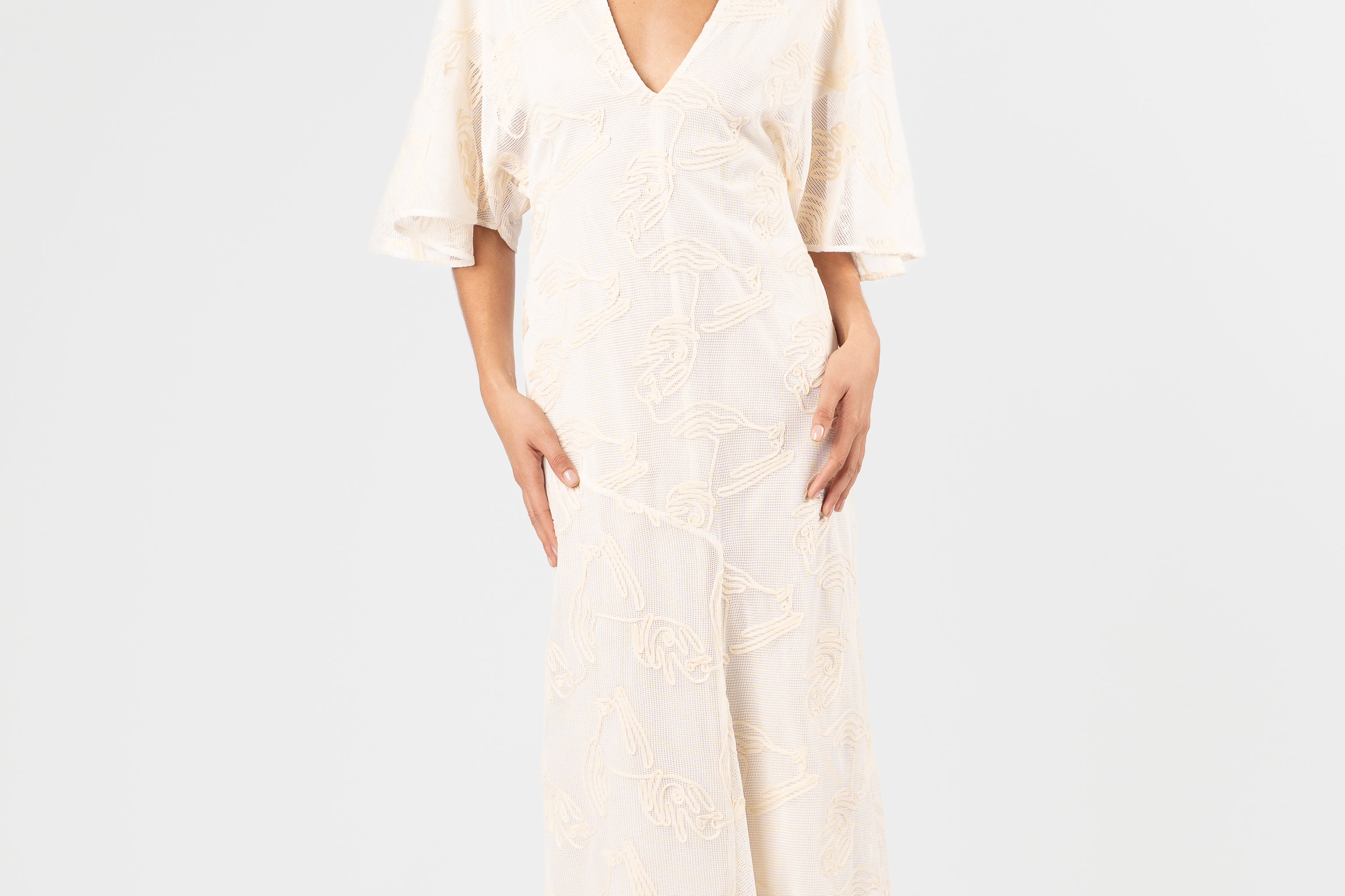 Introducing One Fell Swoop's Daniella Dress in Drift, a relaxed maxi dress in a cream silhouette with embroidered detailing. Designed with a cotton ribbon for soft dimension, featuring a square neckline, spaghetti straps, and relaxed A-line draping. perfect for a summer day-to-night occasion.