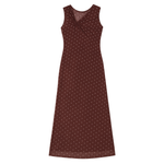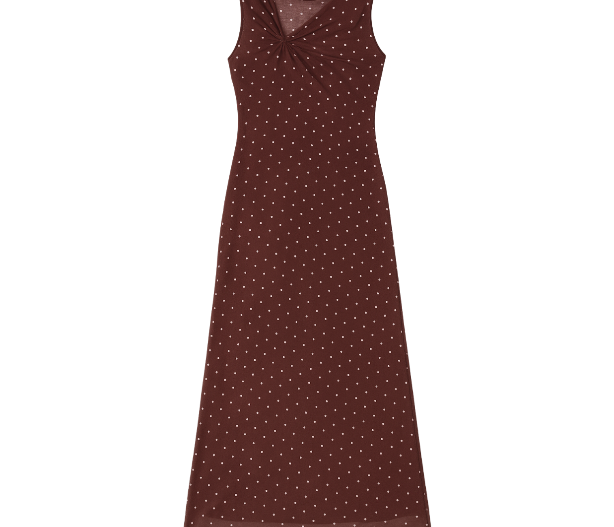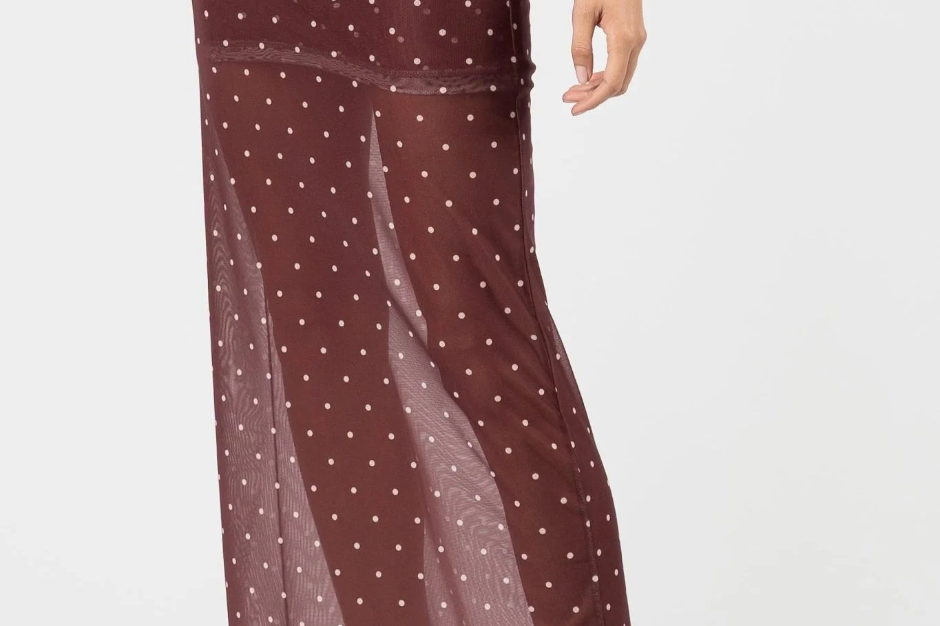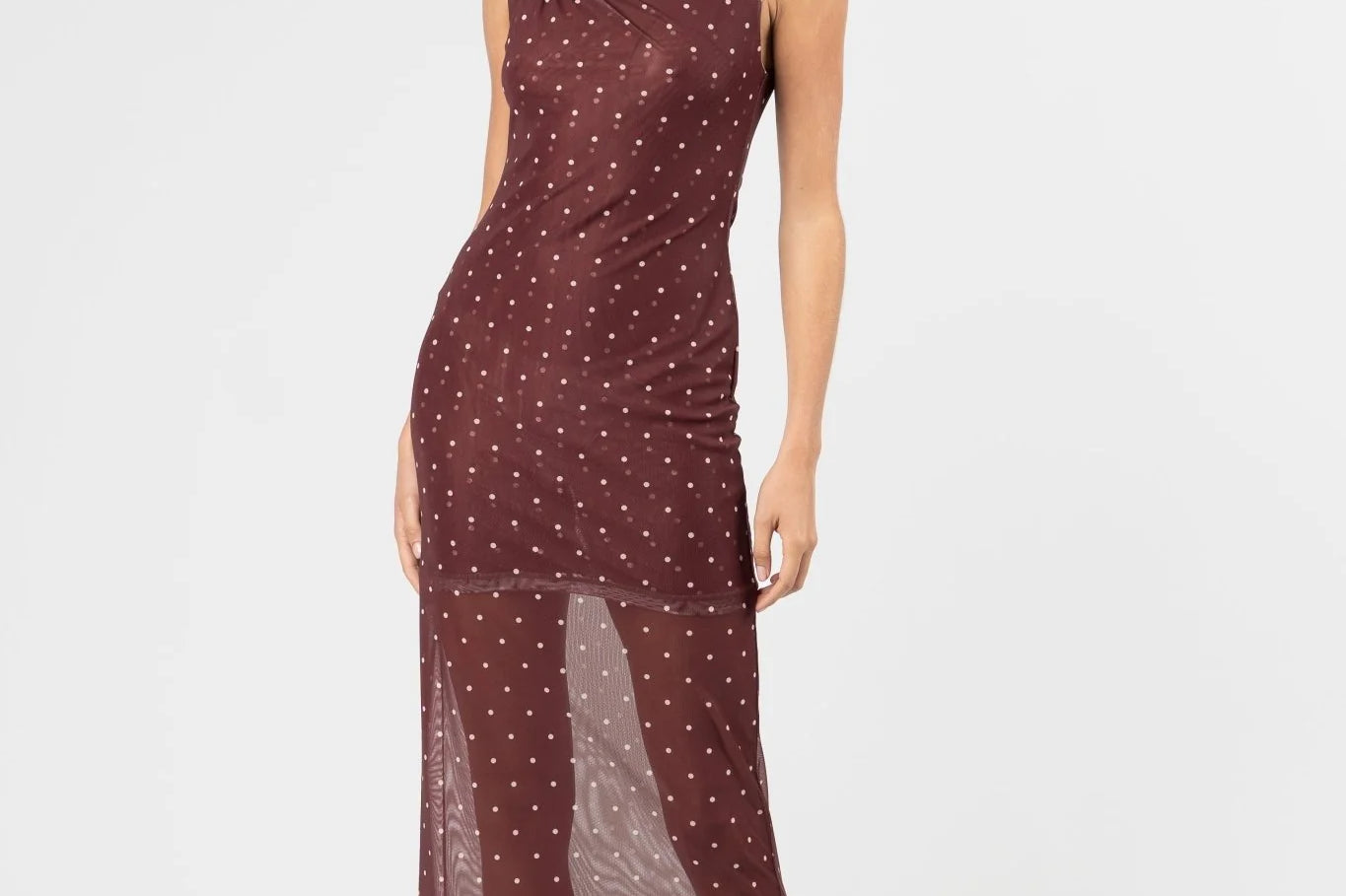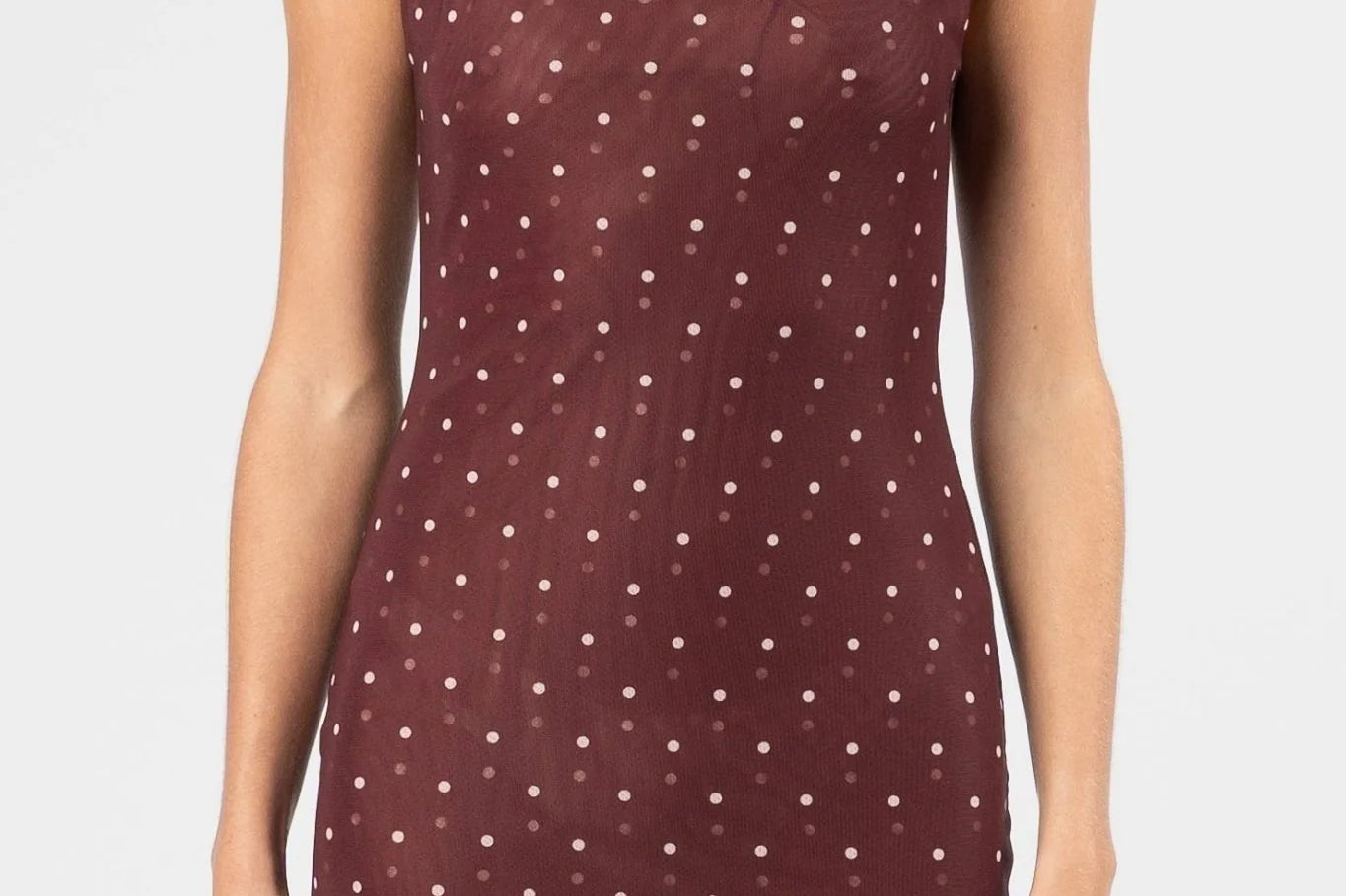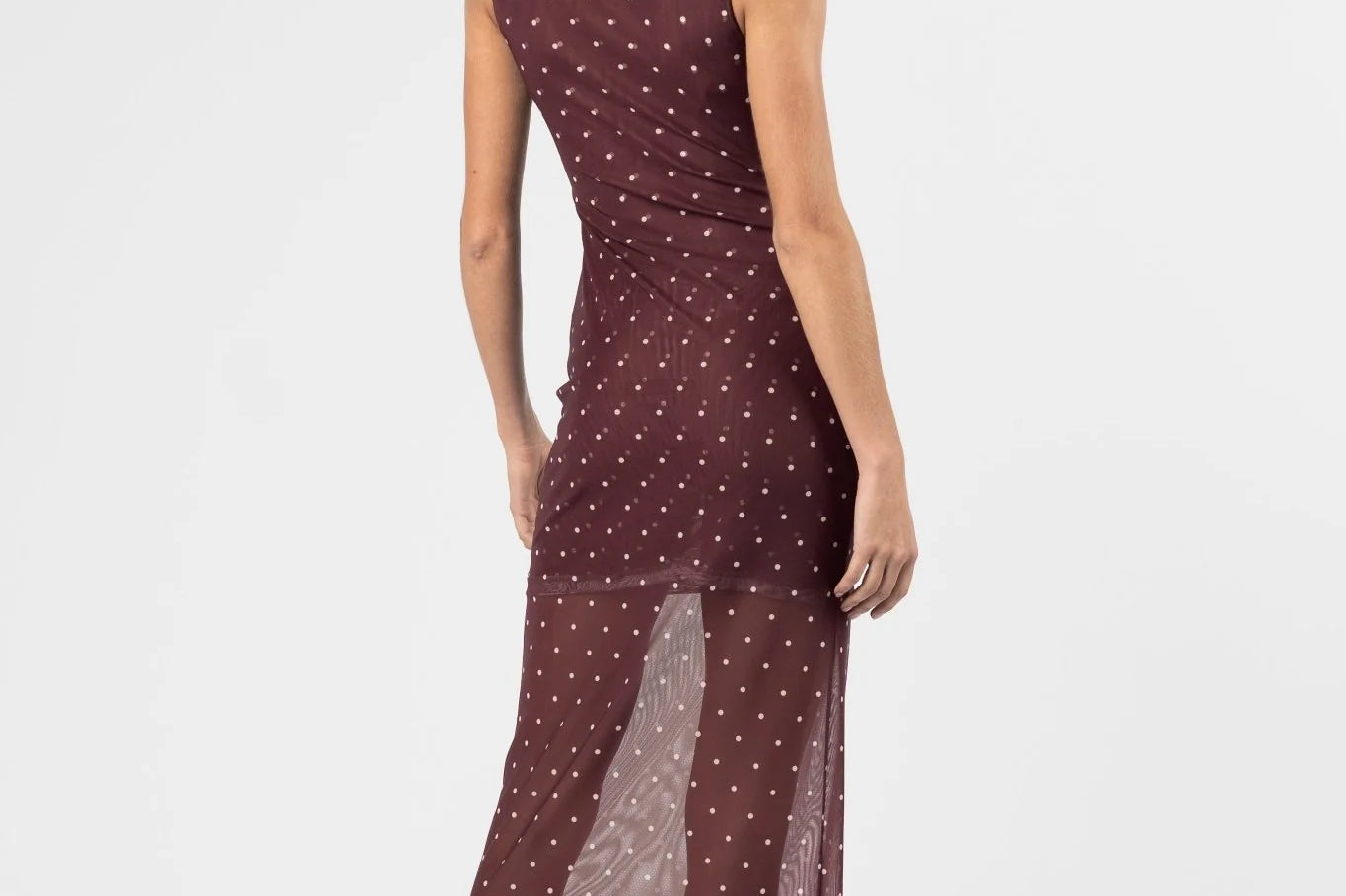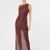 Introducing One Fell Swoop's Sora Knot Mesh Dress in Lola Dot, a mesh maxi dress silhouette in red wine with polka dots. The Sora knot dress features a softly draped detail at the neckline that flows seamlessly into a smooth, clean waistline. The sheer lower section allows the printed mesh to fall freely for a light, fluid finish.