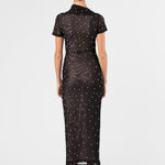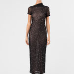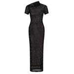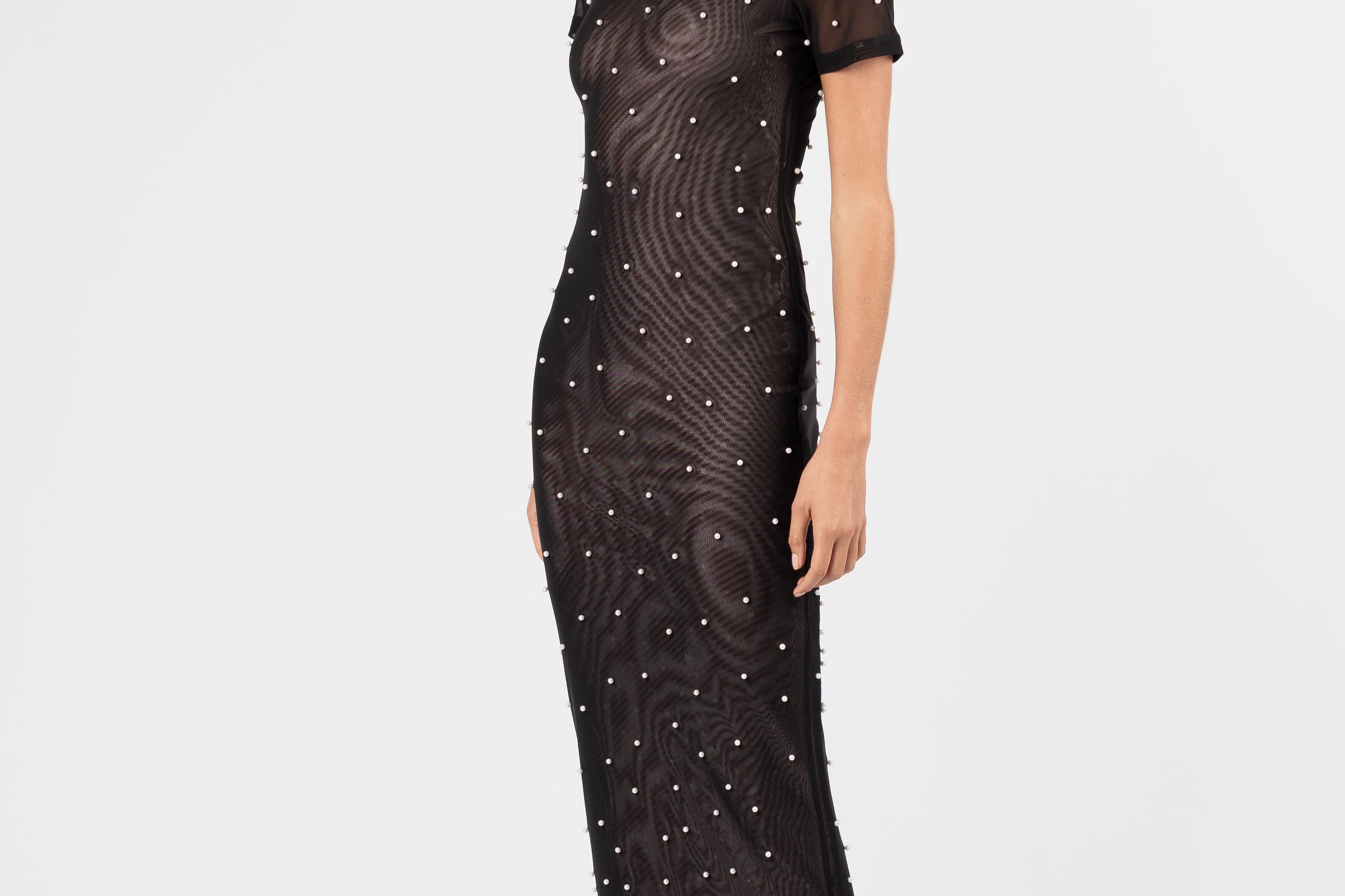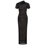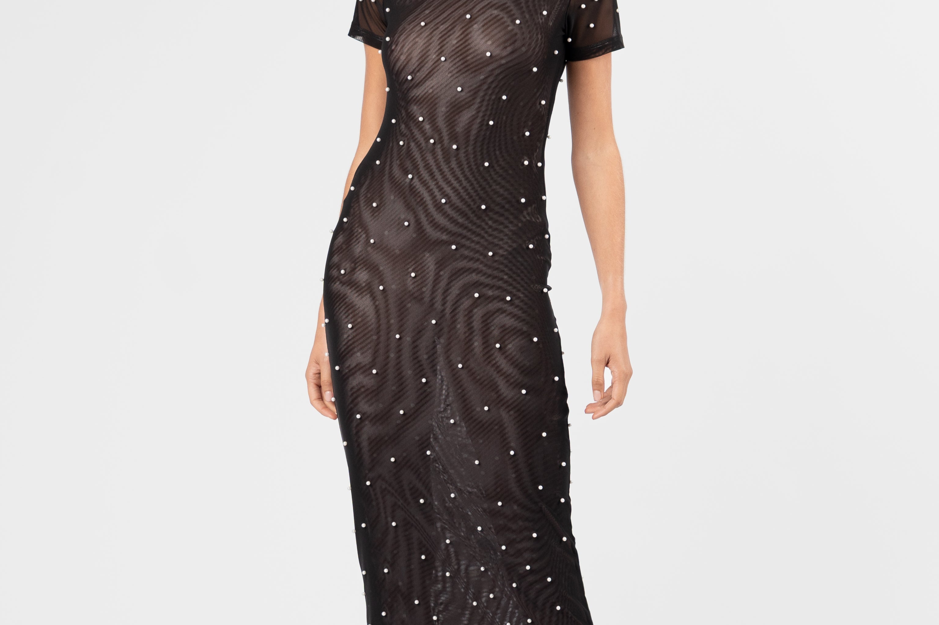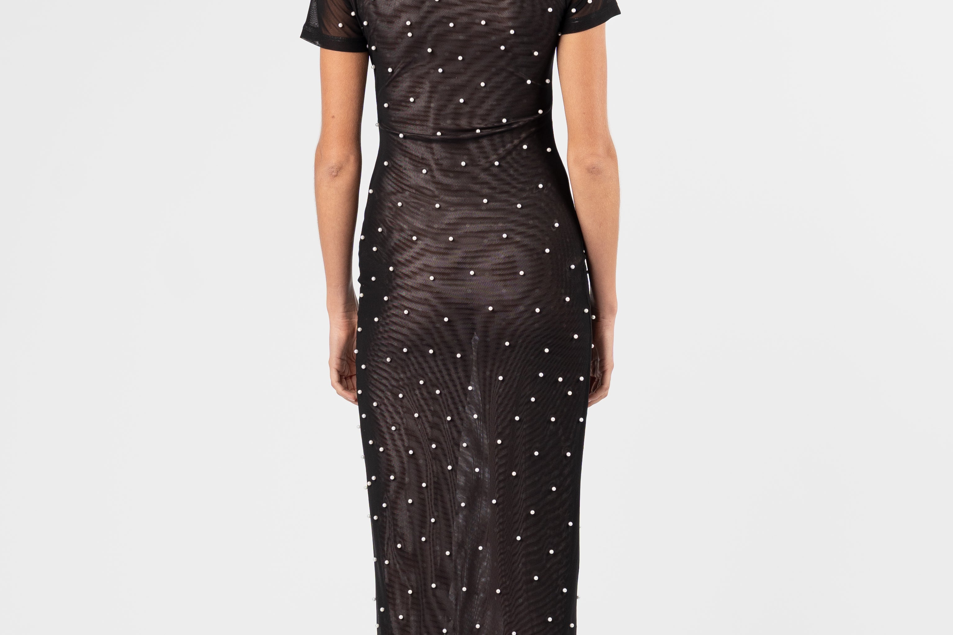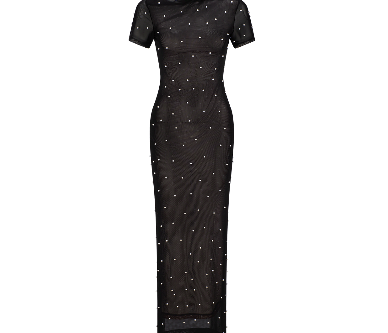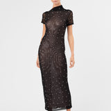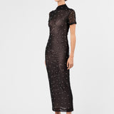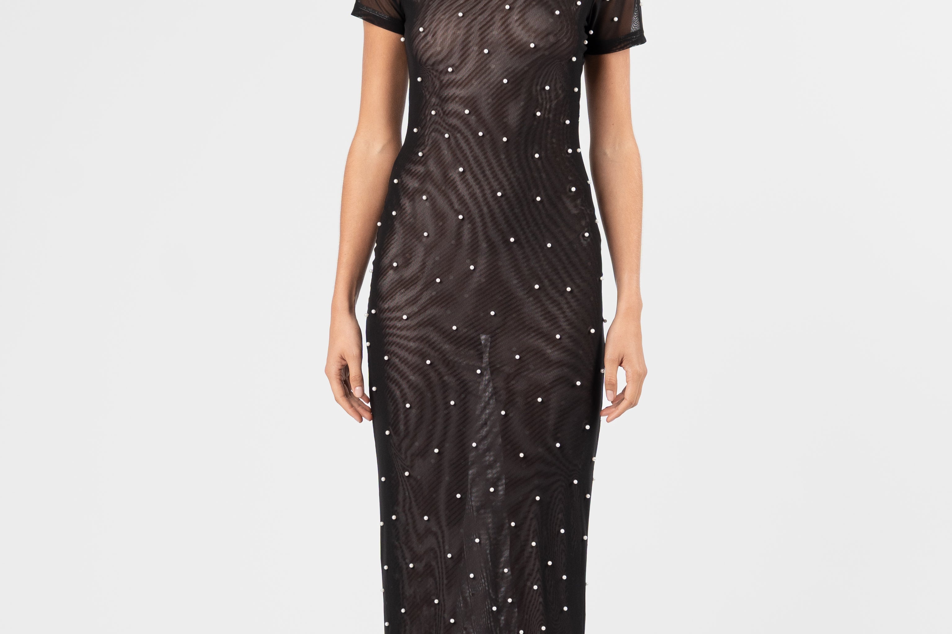 Introducing One Fell Swoop Vortex Contour Dress in Sable Pearl, a maxi dress silhouette with pearl detailing on a black canvas. Designed with mesh fabrication featuring a capped short sleeve with a fitted A-line draping sitting above the ankle. Perfect for day-to-night event wear.