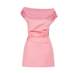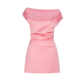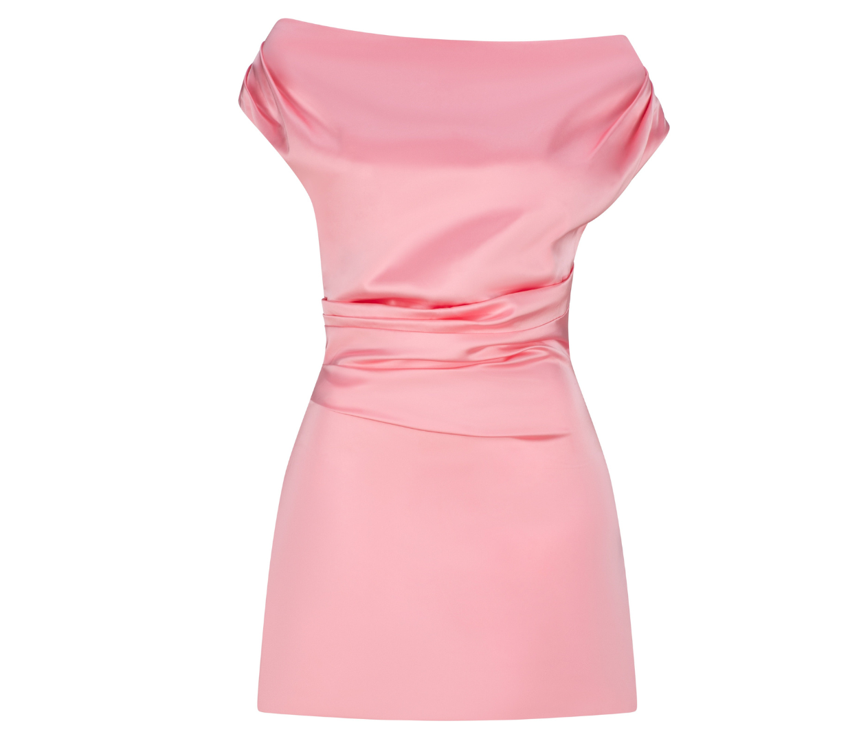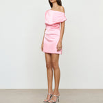 Introducing One Of Others Rhode Mini Dress in Taffy, an off-shoulder mini dress silhouette in a pink taffy hue. Designed with an asymmetrical off-the-shoulder silhouette with tuck detailing in a fluid satin sheen finish. Perfect for a day and night look.