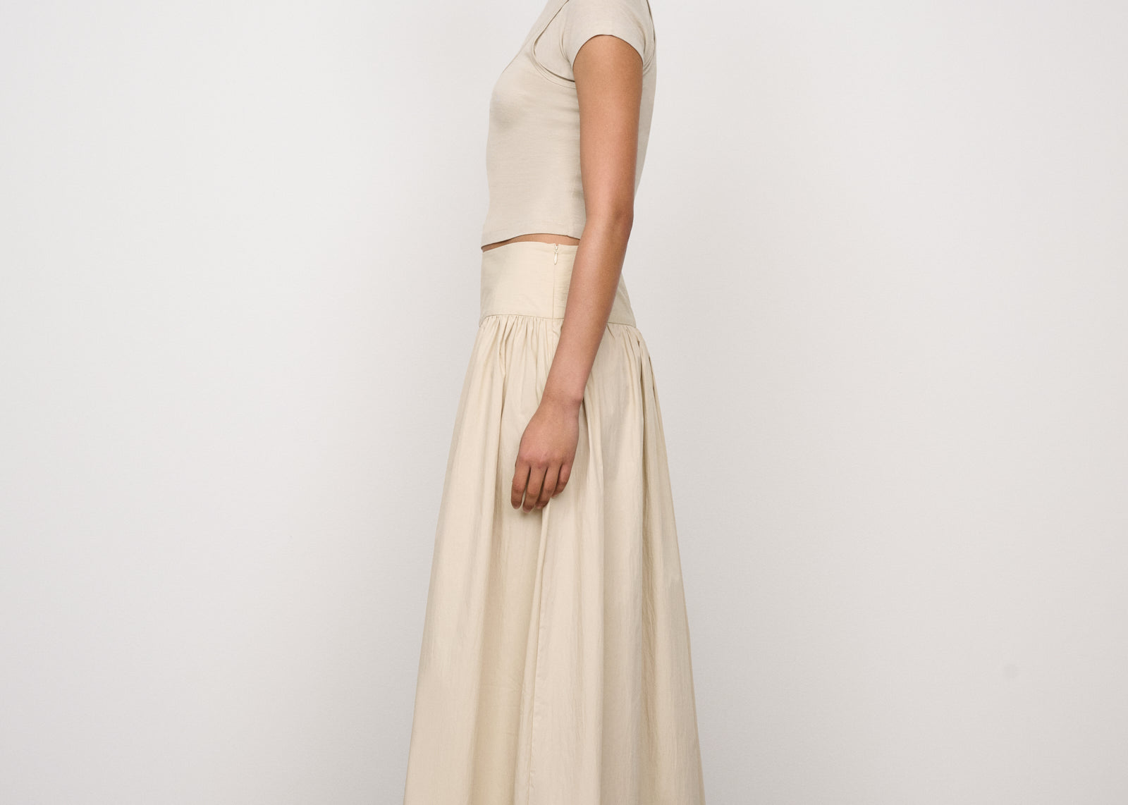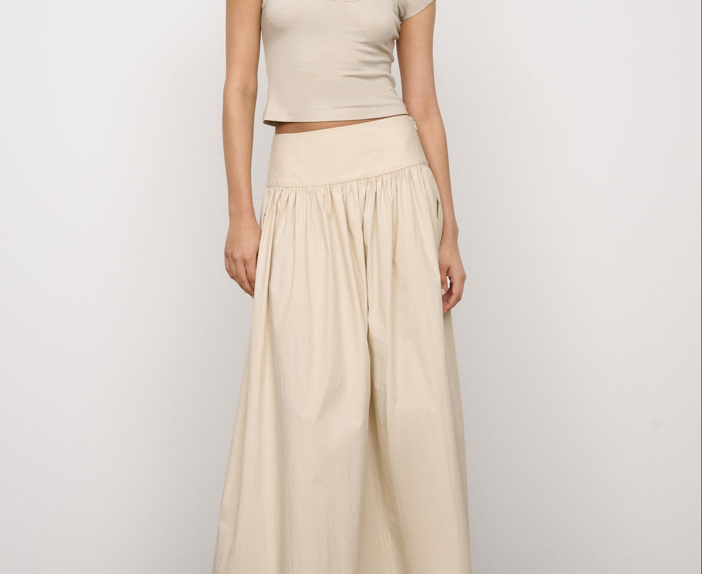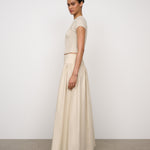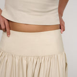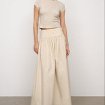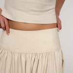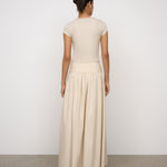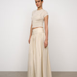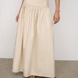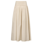 Introducing One Of Others Rowe Skirt in Calico, a midi-length skirt in a cream-calico color hue. Designed in an A-line silhouette, with a clean, wide waistband for a flattering fit, and finished with a soft gathered pleated draping to the ankle. Perfect for transitioning from day to evening casual and formal looks.