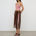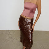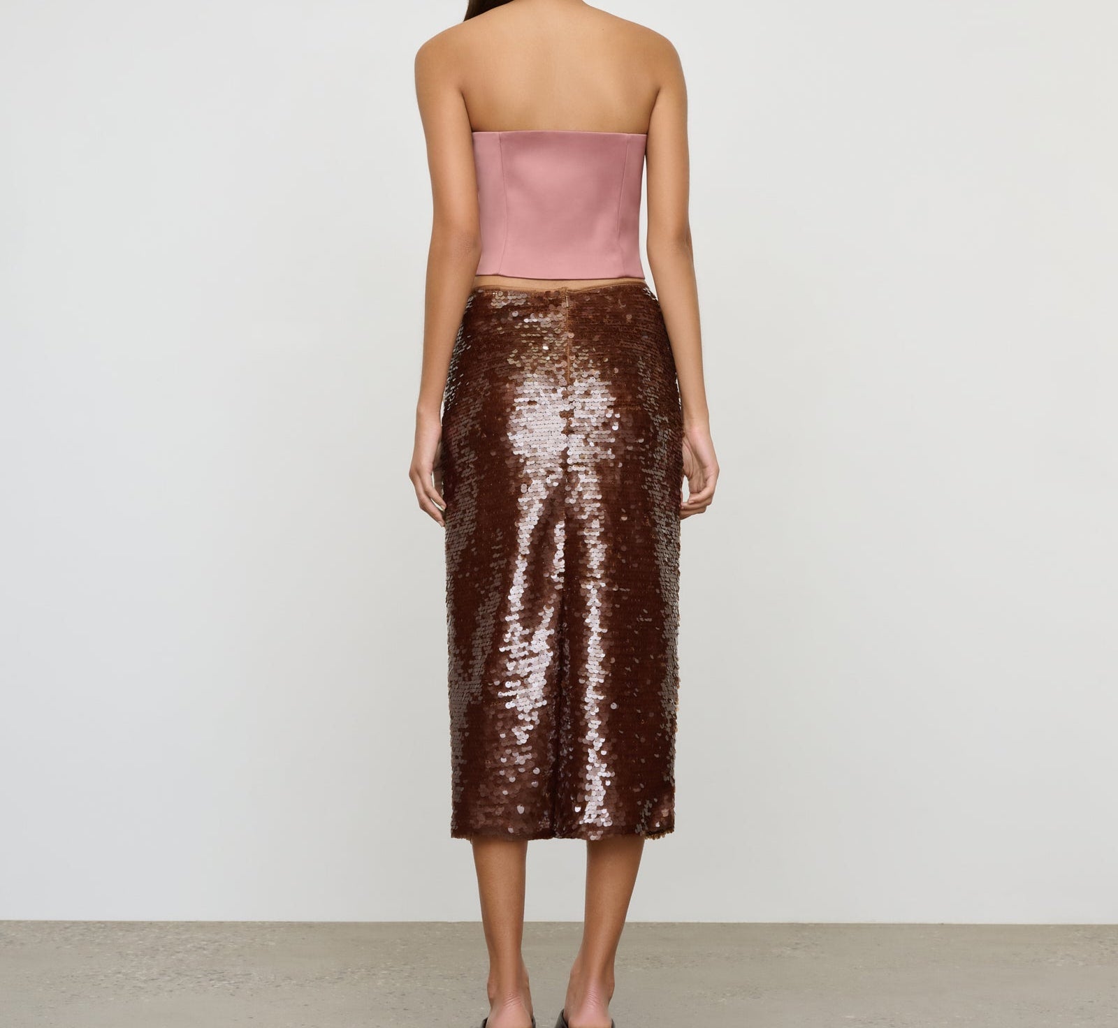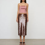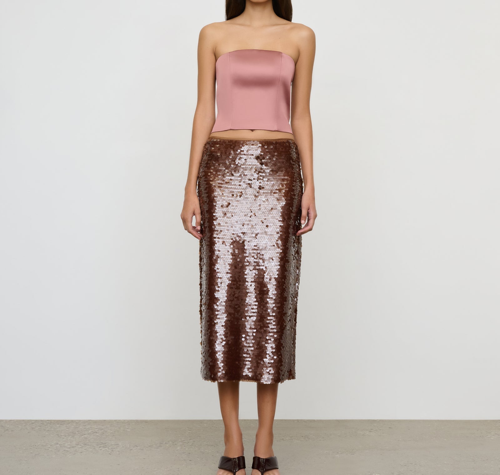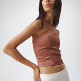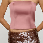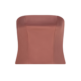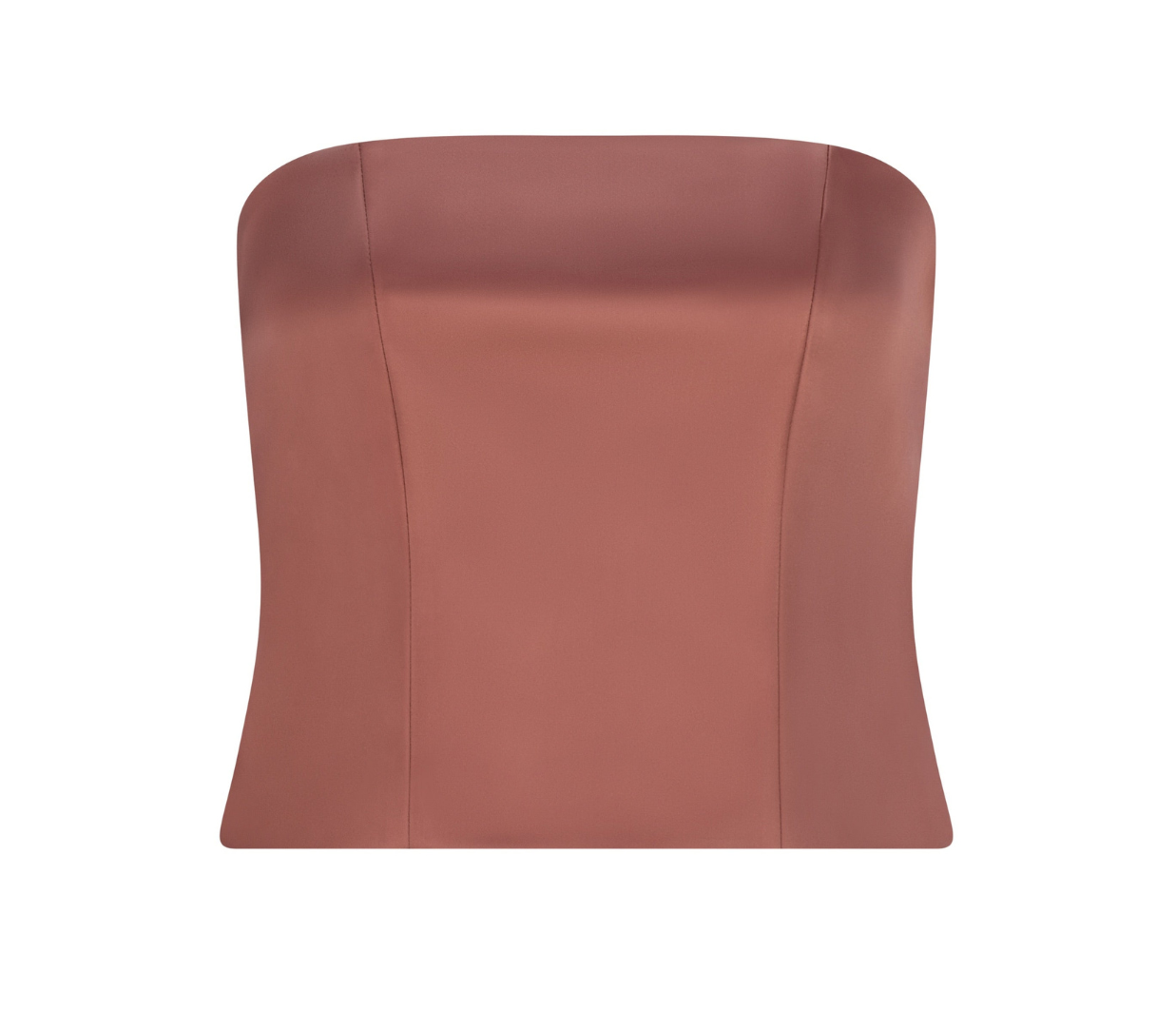 Introducing One Of Others Sanna Strapless Bustier Top in Venus, a strapless bandeau top in mauve pink. Designed with high-shine satin fused to a heavyweight crepe, this piece forms a beautifully structured bodice, refined with an above-the-waist finish. Wear it with the Kendall Skirt in Coffee for an elevated look.