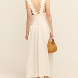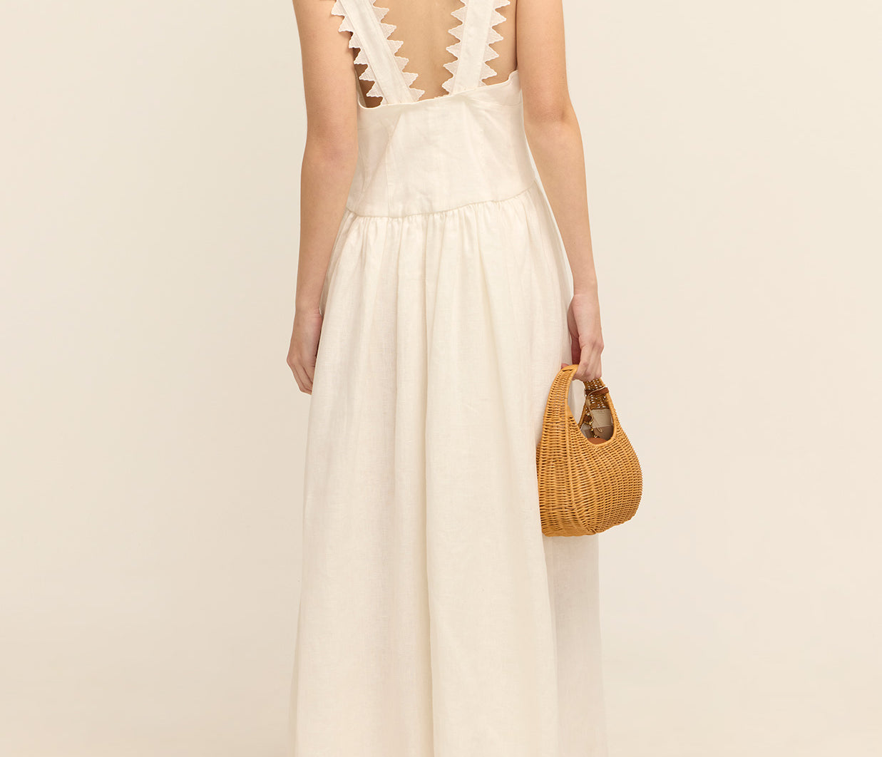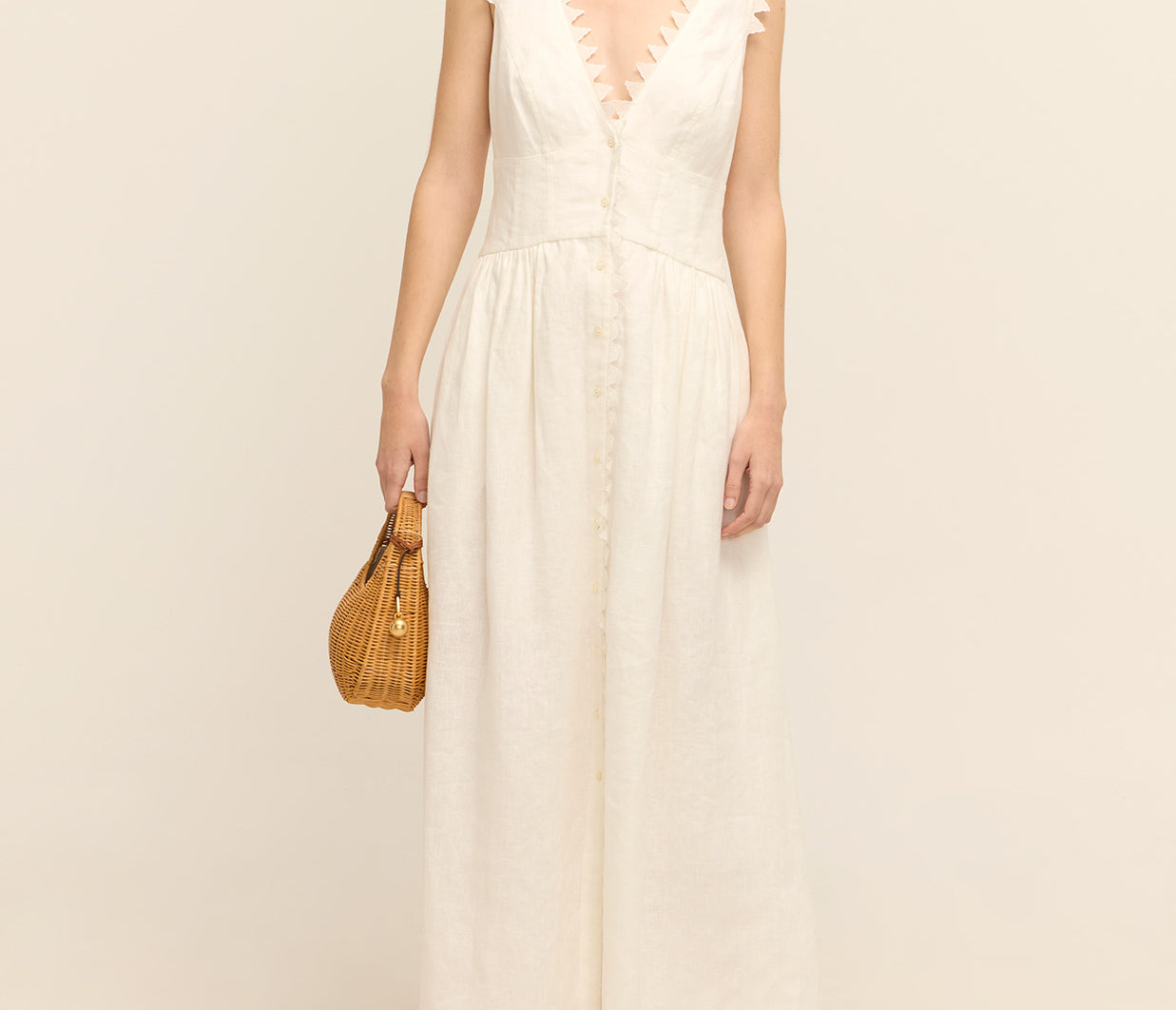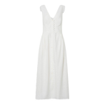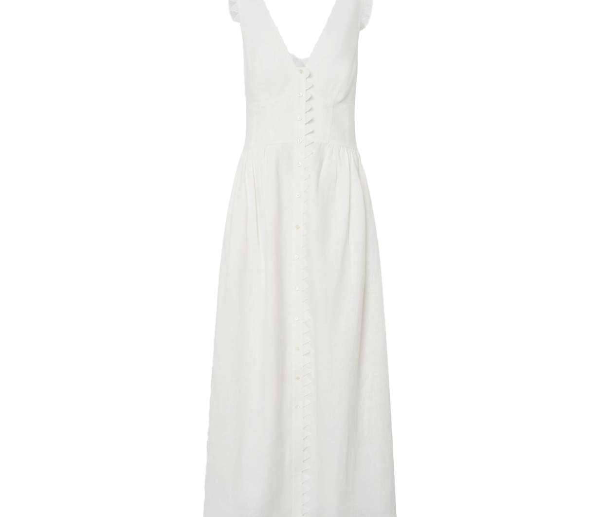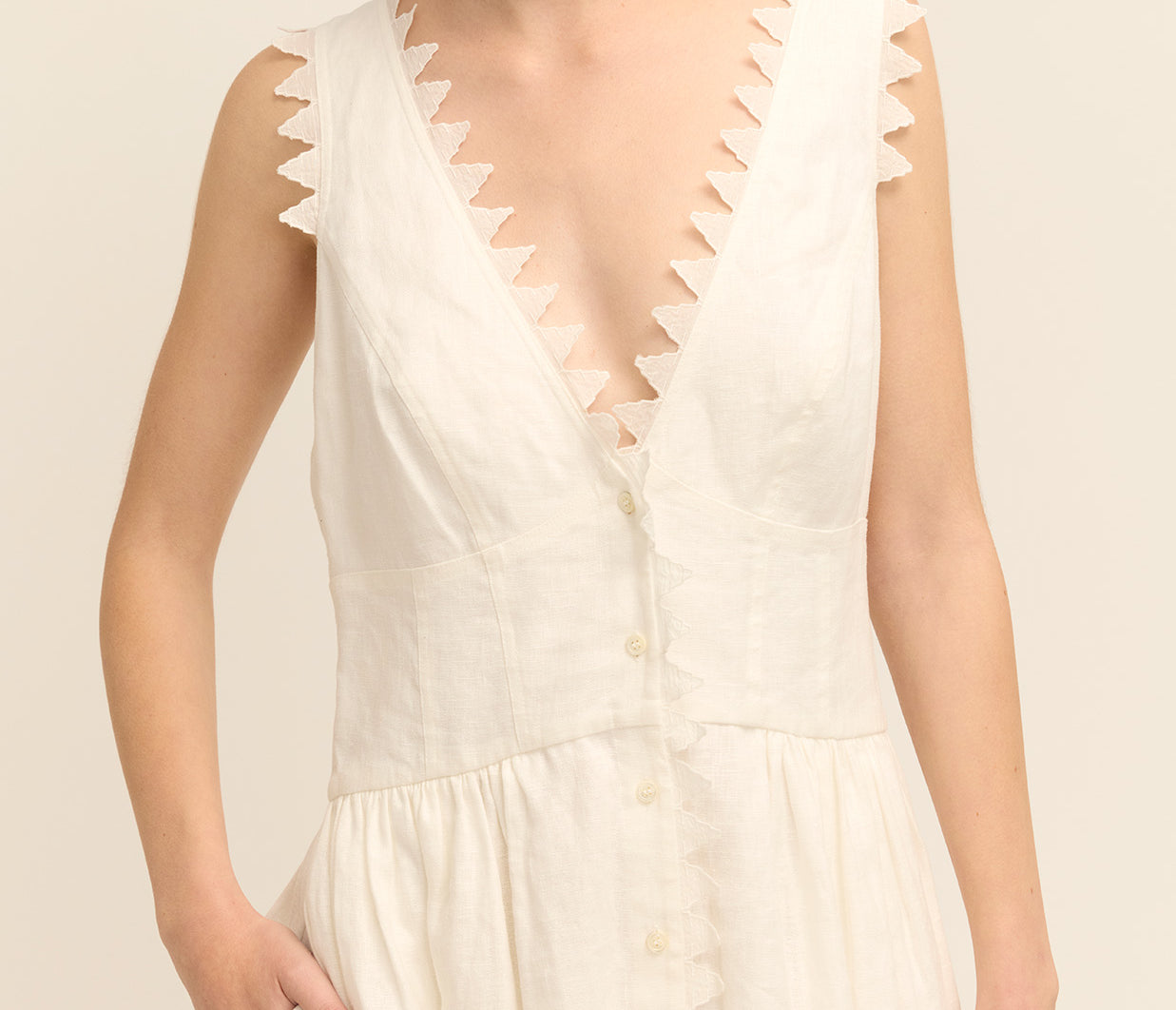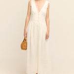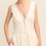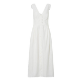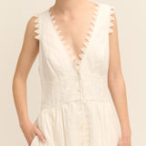 Introducing the Lace Trim Apron Dress. This midi-length beauty is crafted from mid-weight linen and adorned with delicate saw-tooth lace. Featuring a fitted bodice, a graceful button-front closure, and practical side pockets, it flows into a full hem for a flattering silhouette.